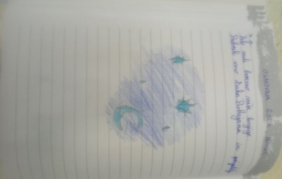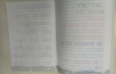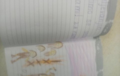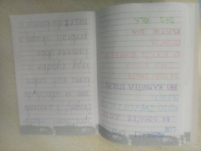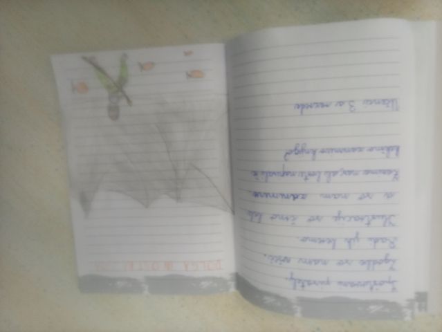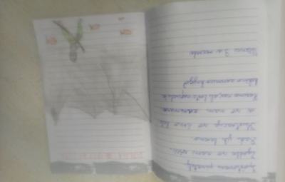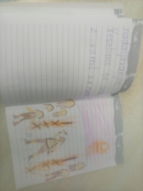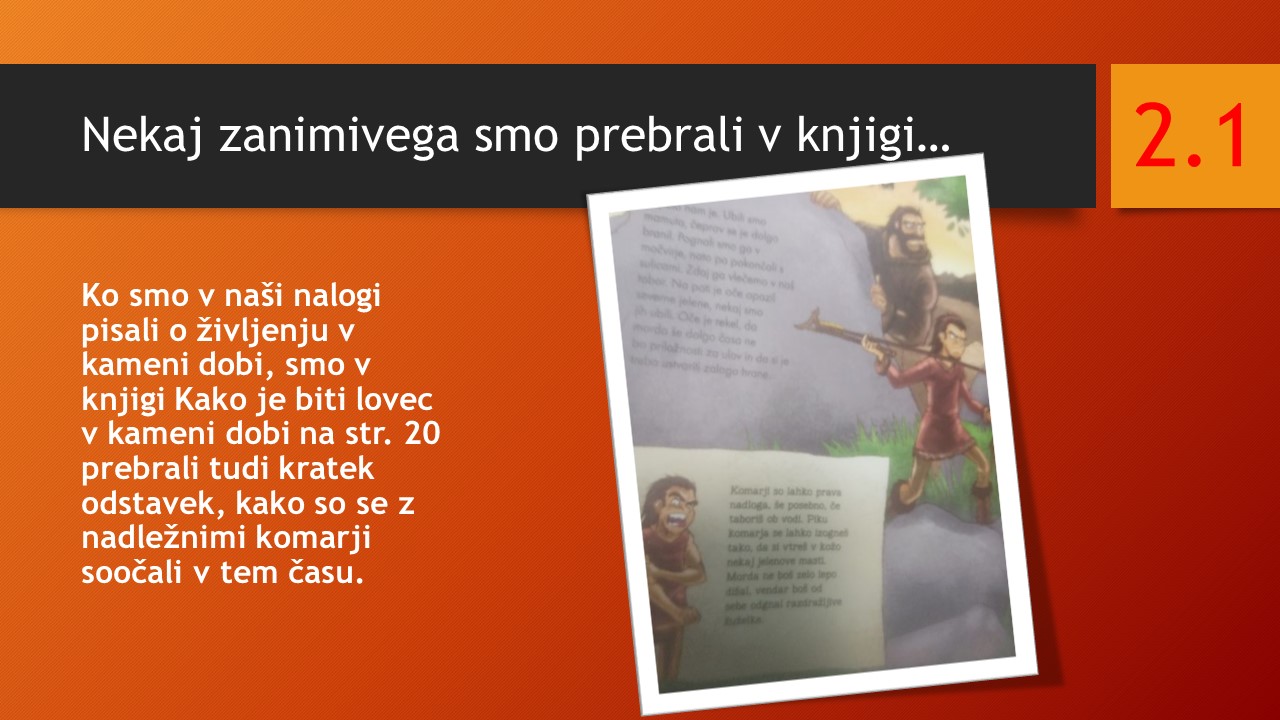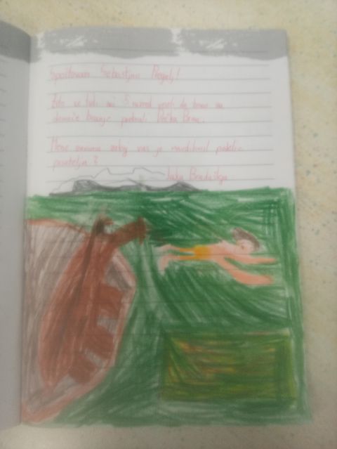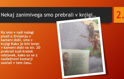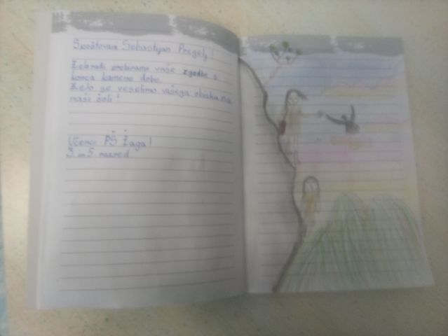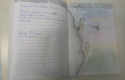 Učenci so ob prebiranju knjig iz zbirke Zgodbe s konca kamene dobe take ilustracije podarili pisatelju na obisku (glej fotografije v fotogaleriji):