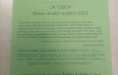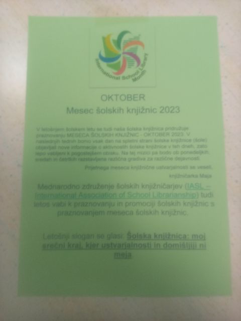 Mednarodno združenje šolskih knjižničarjev (IASL – International Association of School Librarianship) tudi letos vabi k praznovanju in promociji šolskih knjižnic s praznovanjem meseca šolskih knjižnic. Letošnji slogan se glasi: Šolska knjižnica: moj srečni kraj, kjer ustvarjalnosti in domišljiji ni meja. Letos vas vabimo k praznovanju z zavedanjem o povezavi med knjigami, branjem, šolskimi knjižnicami in o tem, da lahko skupaj soustvarjamo prijetno vzdušje v šolski knjižnici. V mesecu oktobru lahko posebno skrb namenite promociji šolske knjižnice kot prostoru, kjer smo lahko srečni, ko smo ustvarjalni in se po mili volji predajamo domišljiji. (https://knjiznicarske-novice.si/mednarodni-mesec-solskih-knjiznic-2023/)