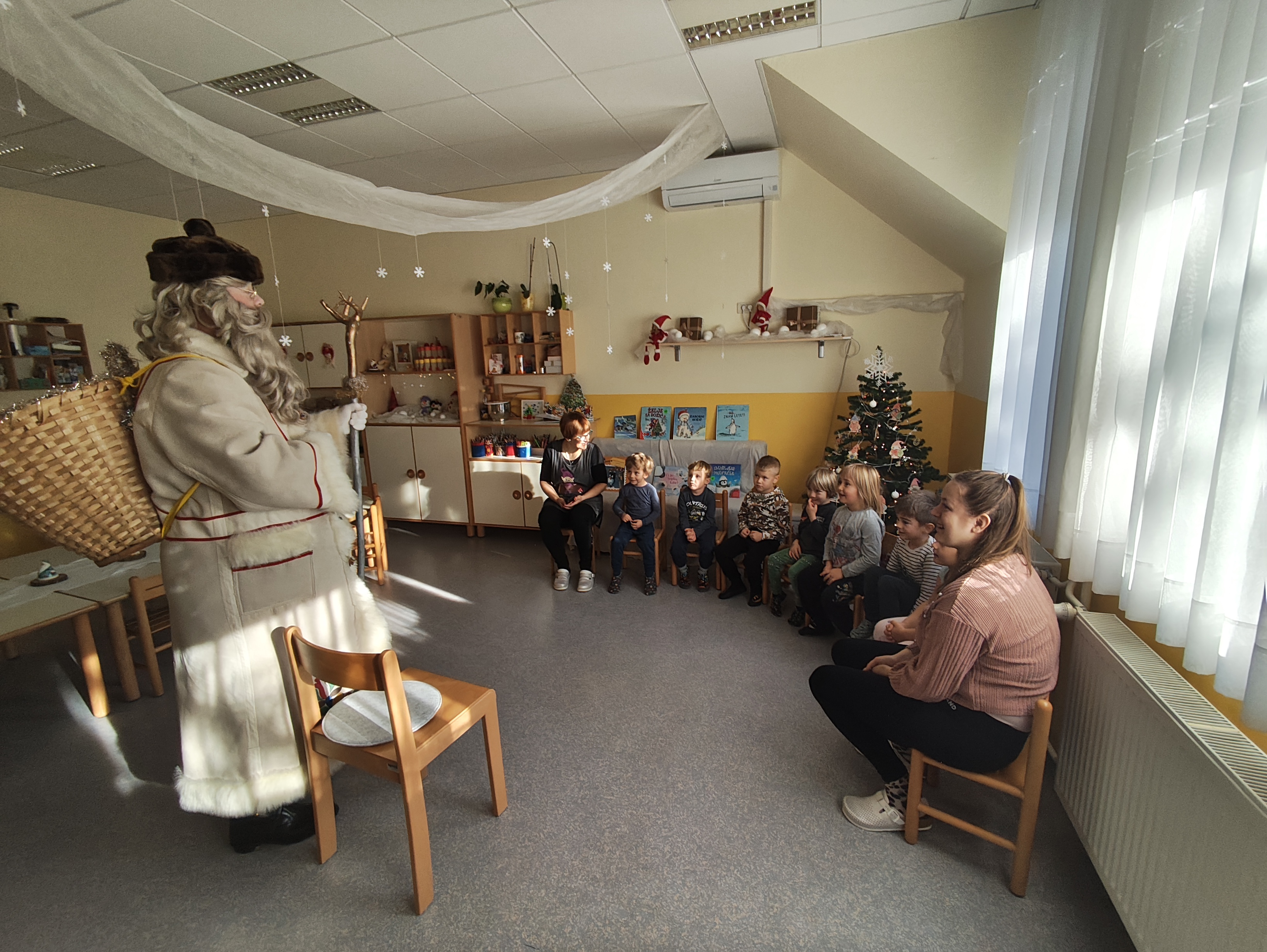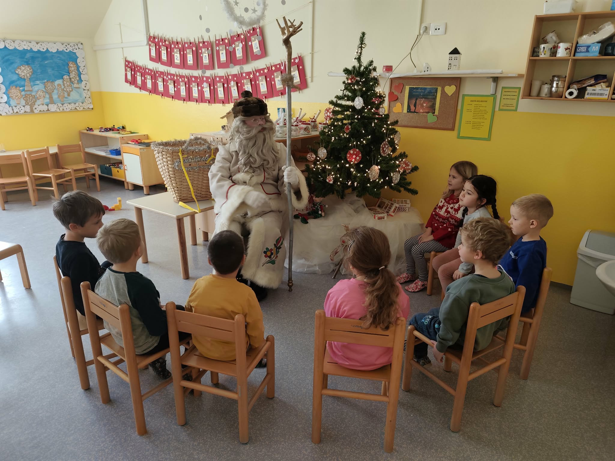 V našem vrtcu smo doživeli še en poseben in čaroben decembrski dan, saj nas je obiskal Dedek Mraz. Otroci so ga z velikim navdušenjem pričakali in ga sprejeli z nasmehi, toplim aplavzom ter prazničnim vzdušjem. Dedek Mraz si je vzel čas za pogovor z otroki, jih povprašal o njihovih željah, igrah in vsakdanjih dogodivščinah v vrtcu. Seveda ga je zanimalo tudi, če pomagajo staršem in starim staršem pri vsakodnevnih opravilih. Otroci so mu z veseljem pripovedovali, kaj radi počnejo, in mu obljubili, da se bodo še naprej trudili biti prijazni, spoštljivi in pridni. Skupaj so zapeli nekaj prazničnih pesmi, ki so prostor napolnile z veseljem in otroškim smehom. Dedek Mraz je nato prebral seznam pridnih otrok, na katerem se je seveda znašlo prav vsako ime, kar je med otroki povzročilo veliko veselja in ponosa.
