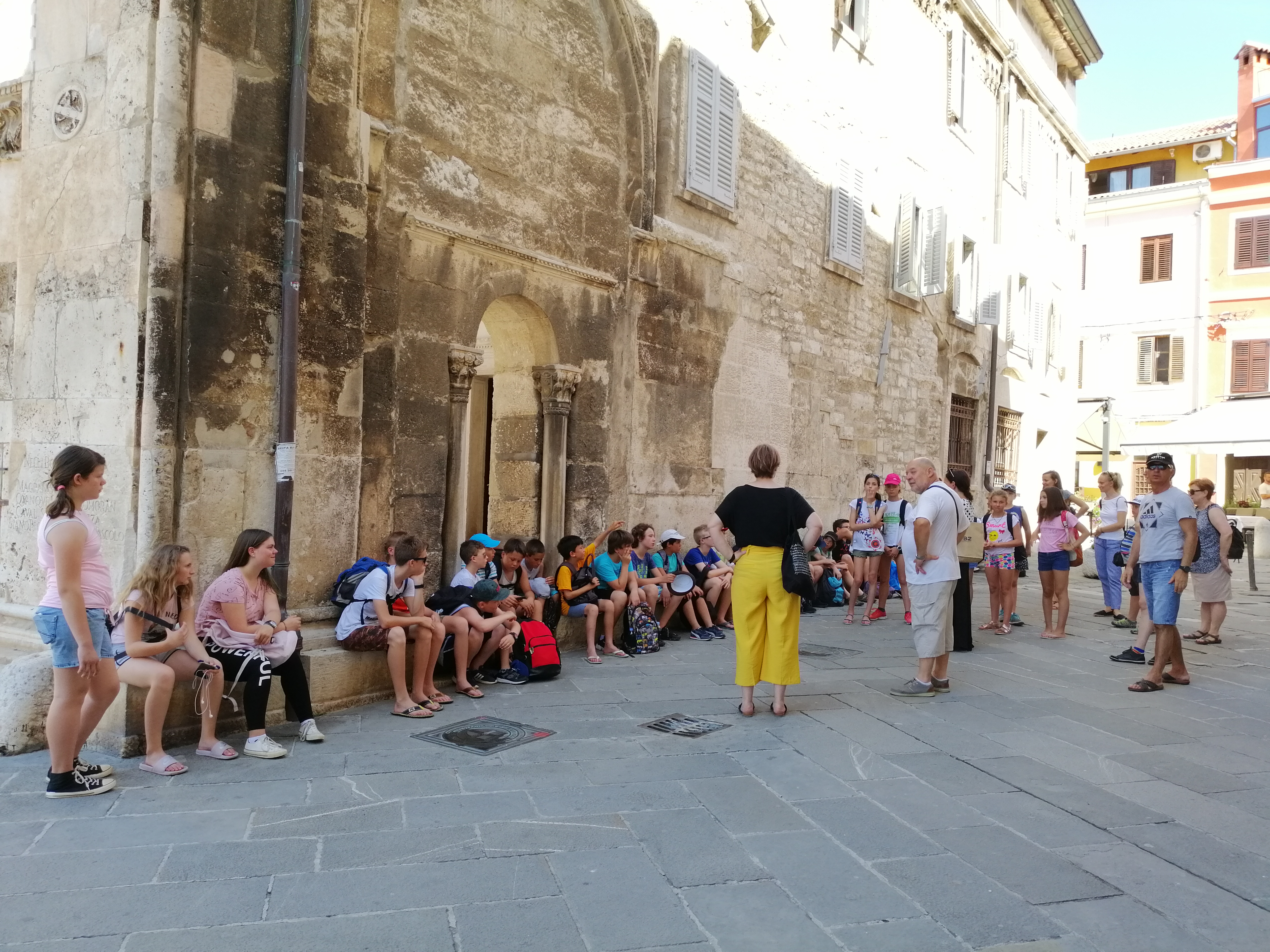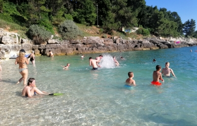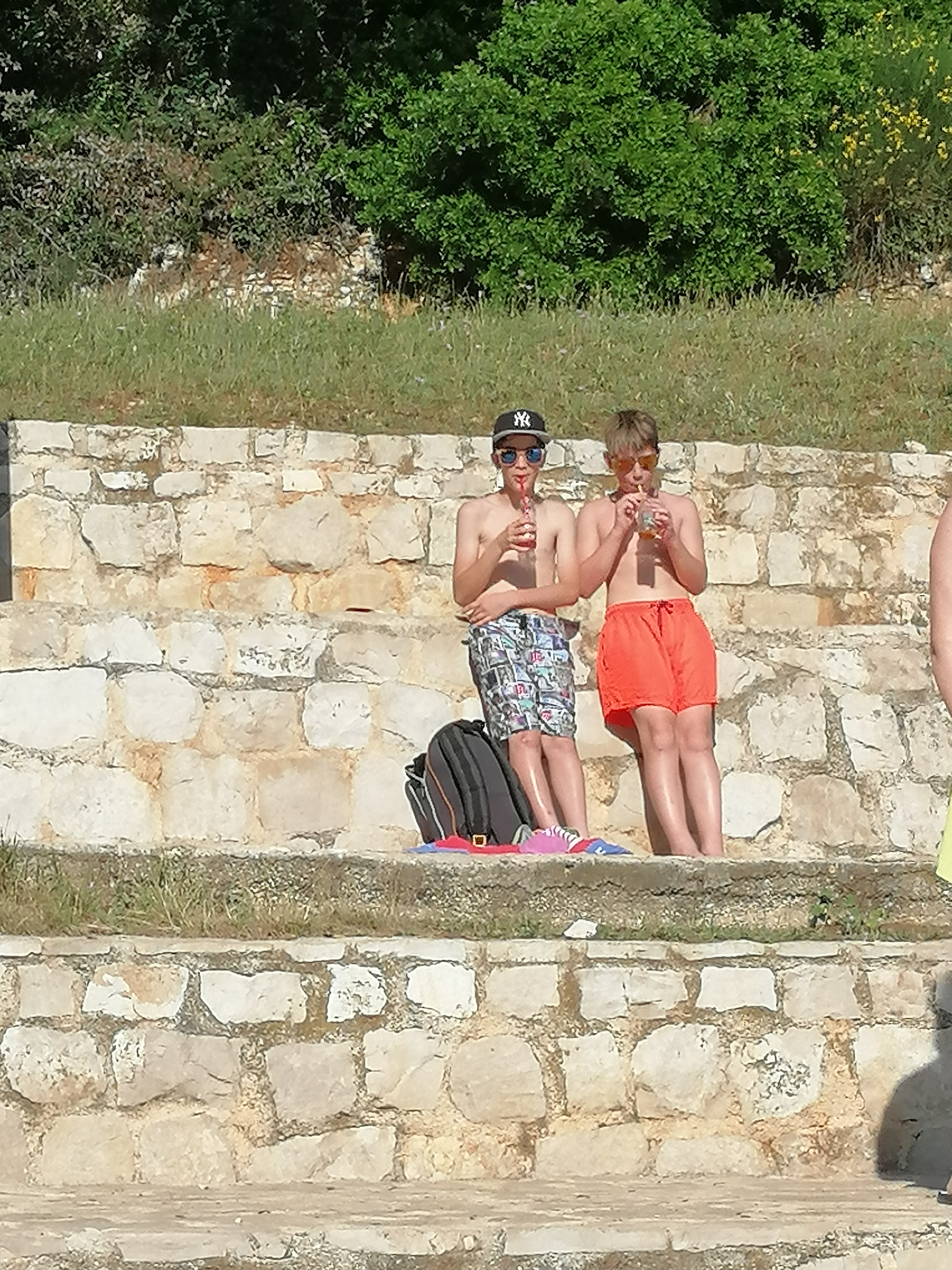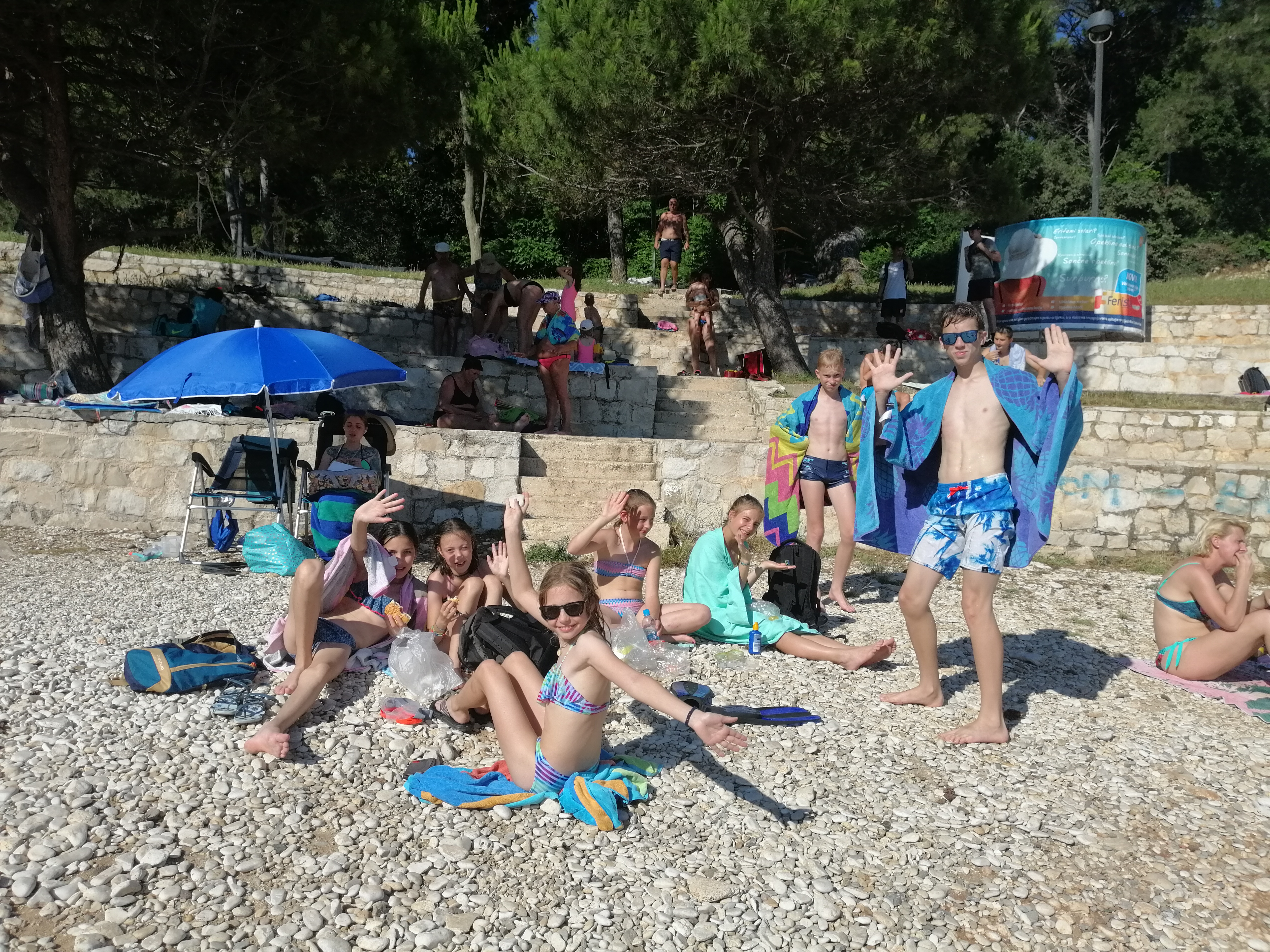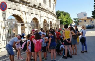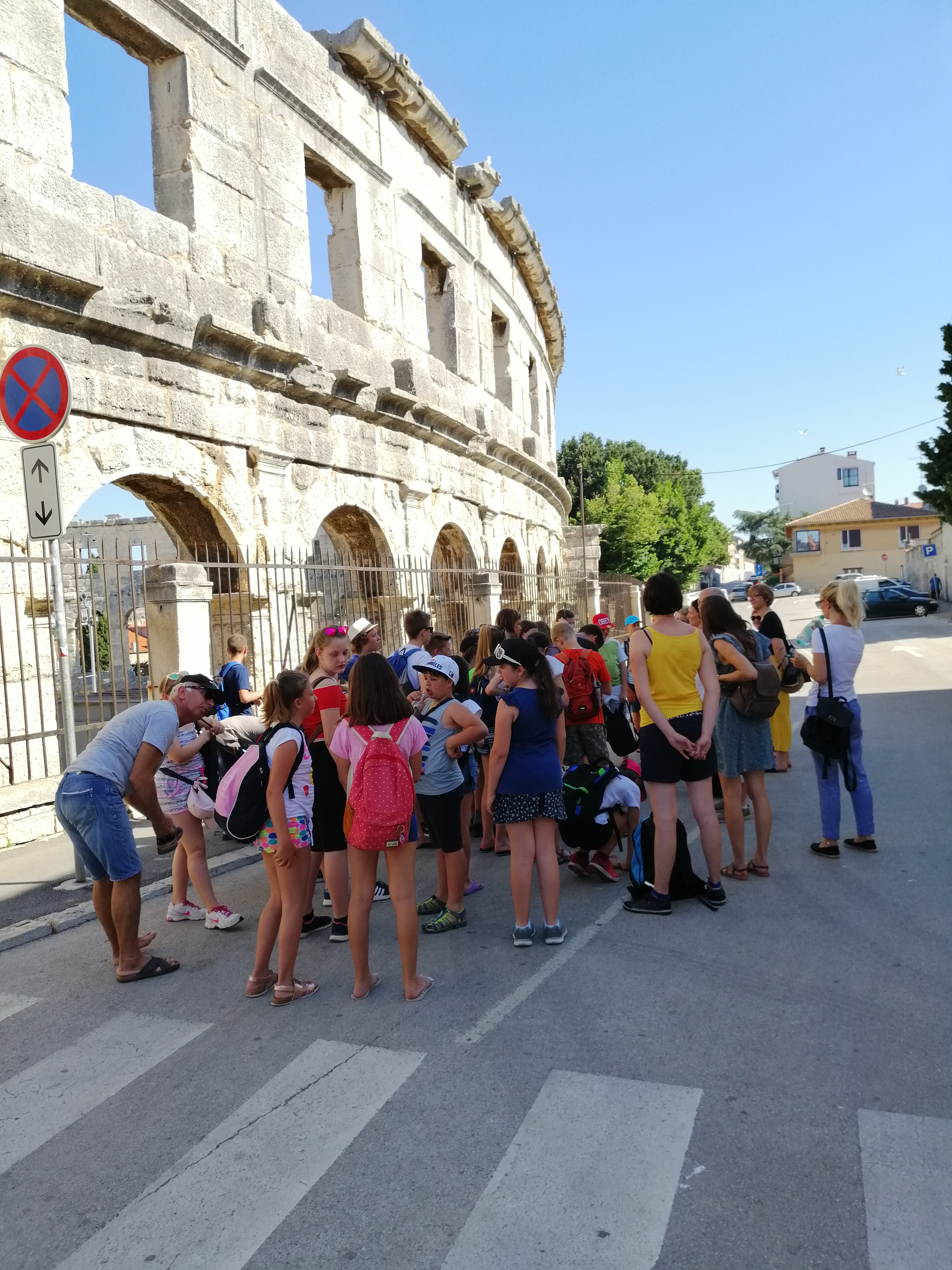 Drugi dan našega druženja v Puli je za nami. Učenci in učitelji so nas lepo sprejeli. Zjutraj smo odšli v mesto, kjer smo si ogledali obzidje gradu, areno in mestno hišo. V sejni sobi nas je sprejela namestnica župana, nam namenila nekaj prijaznih besed in vsakemu podarila nahrbtnik občine Pula. Popoldne pa je sledil težko pričakovan skok v morje. Komaj že čakamo jutrijšnji dan, ko se bomo odpravili kampirat na Fratarski otok.