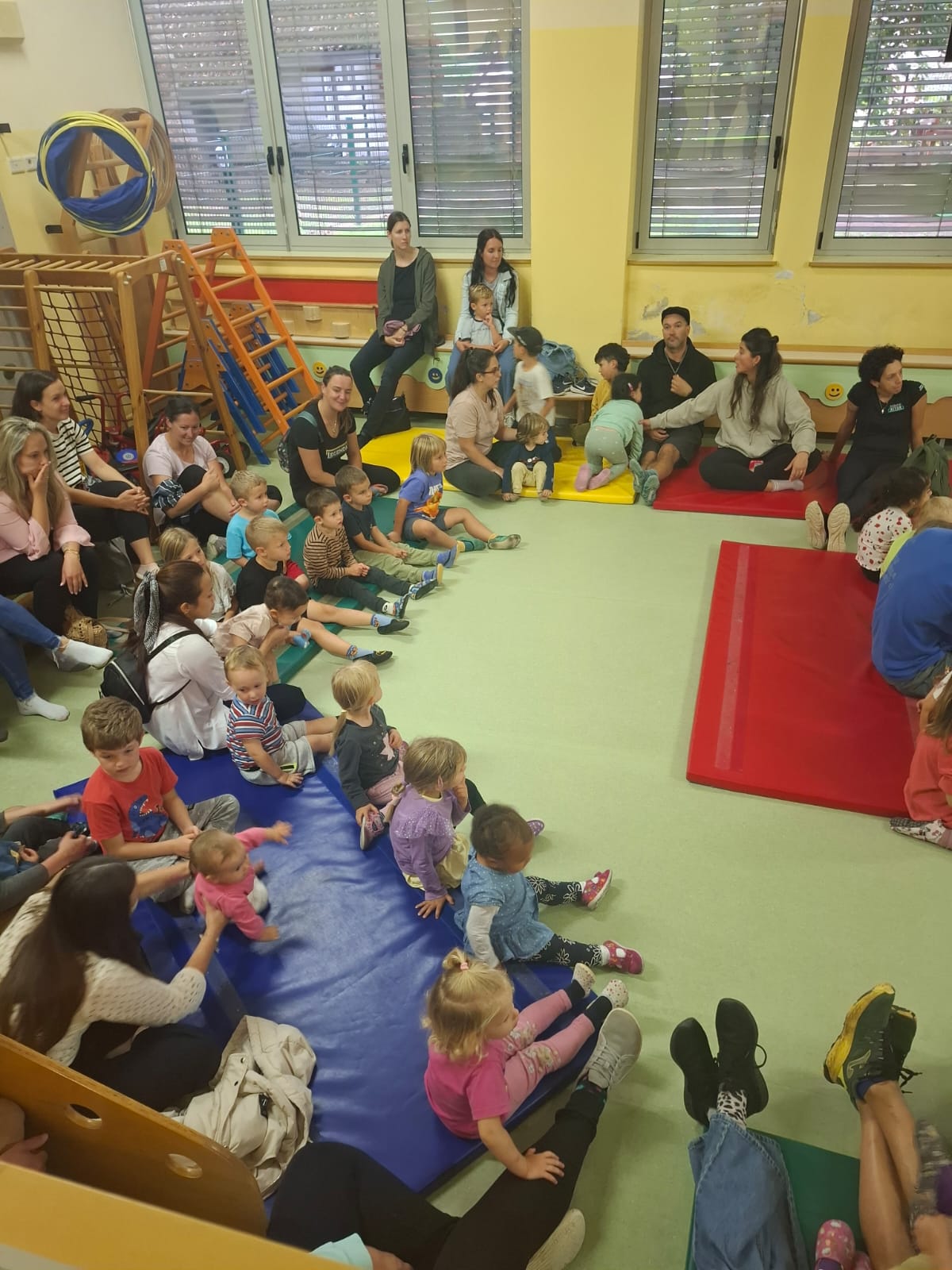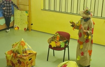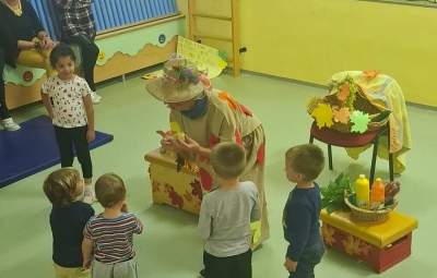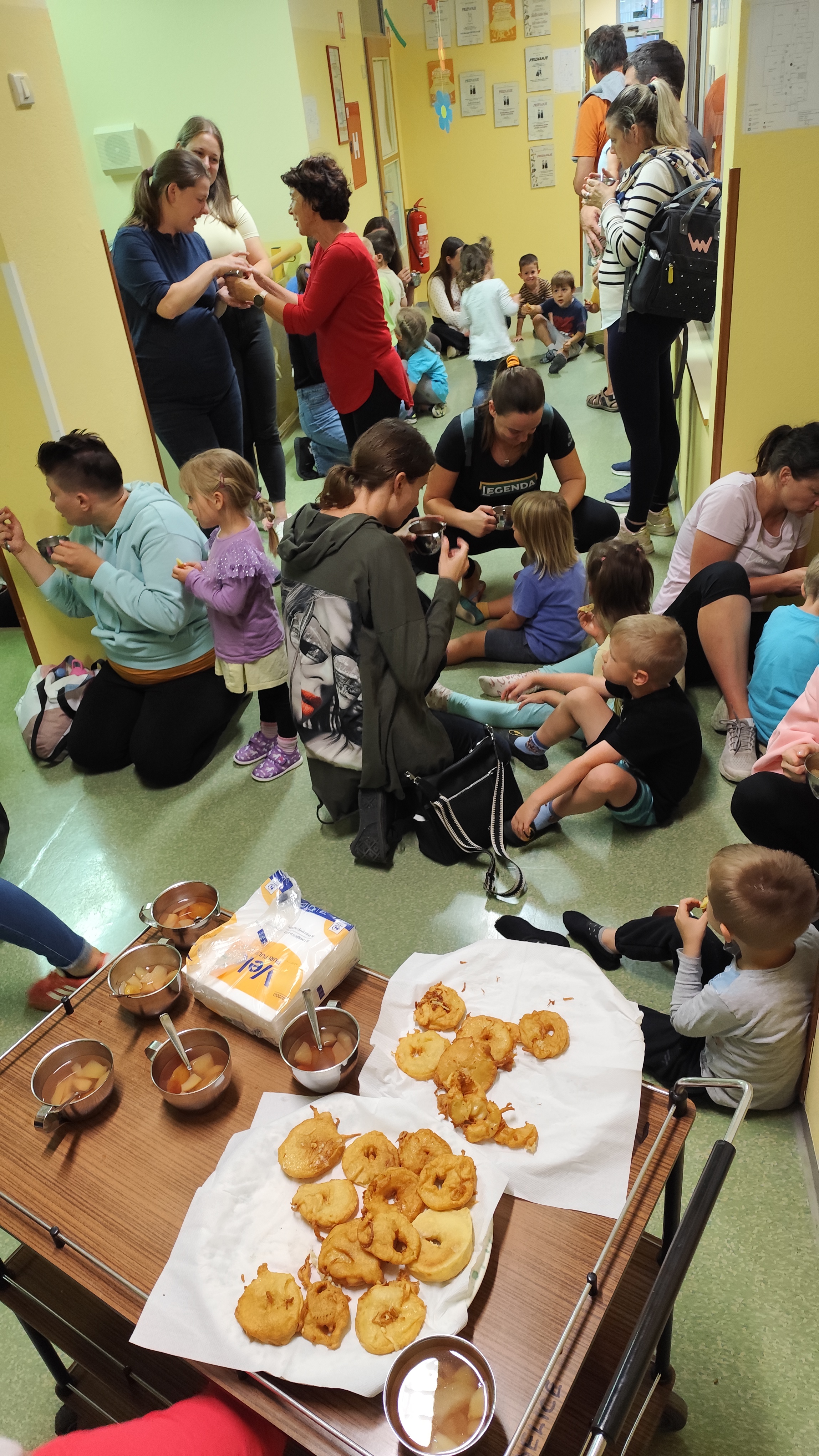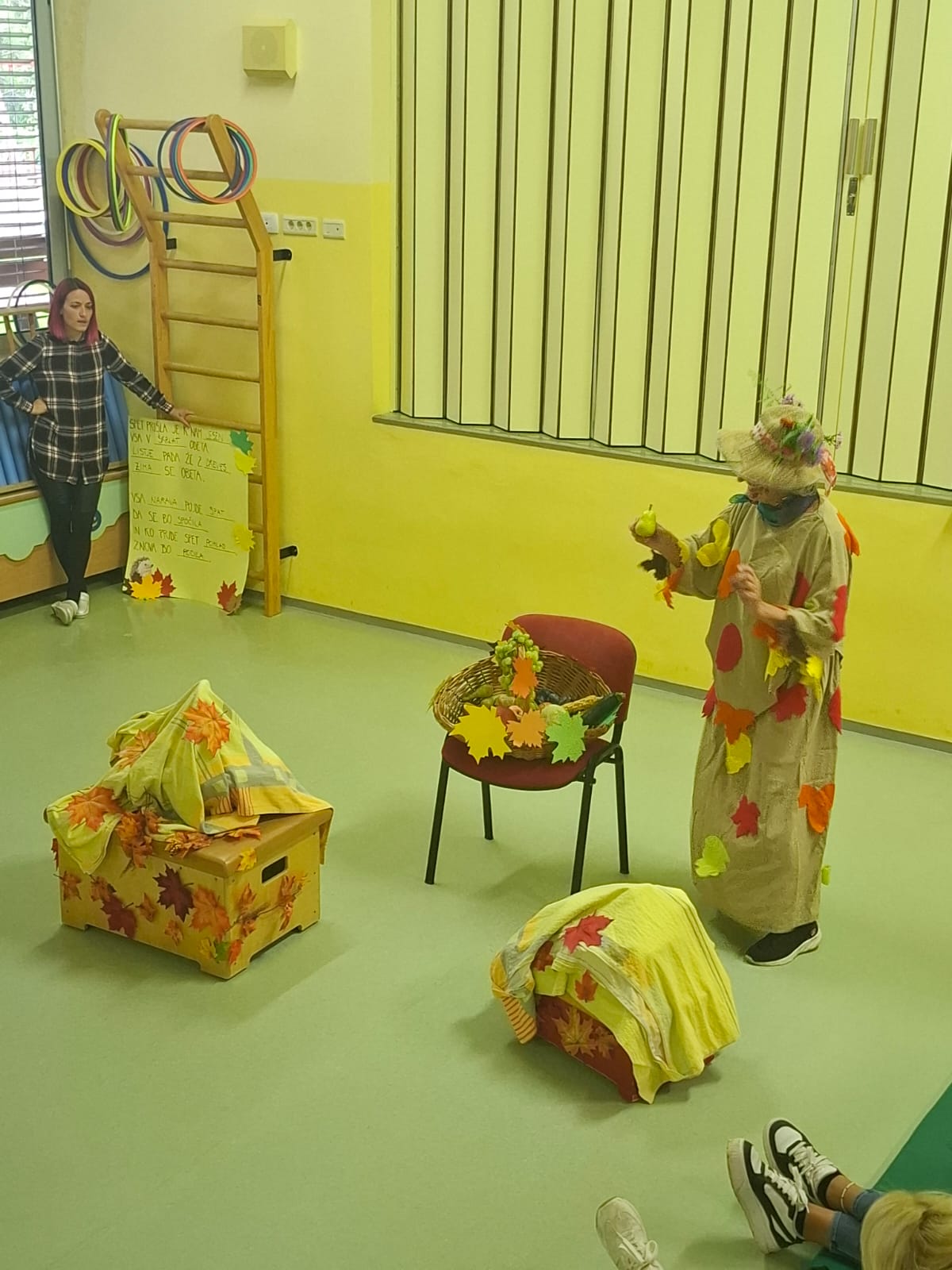 Tako smo začeli ponedeljkovo jesensko druženje, na katerega smo povabili naše starše. Skozi pesem, ki smo jo brez težav prepoznali in ujeli vse besede nazaj v stavke, smo priklicali še tetko Jesen, ki se je mudila v okolici našega vrtca. Prisluhnila je našemu petju, s seboj prinesla zvrhano košaro dobrot, sadja in zelenjave, ter nekaj pripravkov, s katerimi bomo še dodatno krepili naše zdravje. Po pogovoru in prepevanju smo se od nje poslovili, močno zavihali rokave, ter se podali v igralnice, kjer smo se lotili ustvarjati jesensko dekoracijo. Vsaka skupina je ustvarjala svoje, na koncu pa smo vse izdelke združili v eno čudovito dekoracijo, ki krasi hodnike našega vrtca. Ko smo se že skoraj poslovili drug od drugega, so nas presenetili starši, otroci in vzgojiteljice skupine Medvedki in Barvic. Združili so moči in poskrbeli za sladko presenečenje, ki so se ga otroške oči še bolj razveselile. Za otroke in vse starše so pripravili slasten kompot iz jesenskih dobrot, ter jabolka v srajčki. Turoben in z dežjem prepleten ponedeljek je tako dobil drug pomen, dan je bil zaključen v najlepši luči, skozi katerega smo ustvarili čudovit spomin.