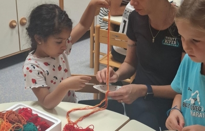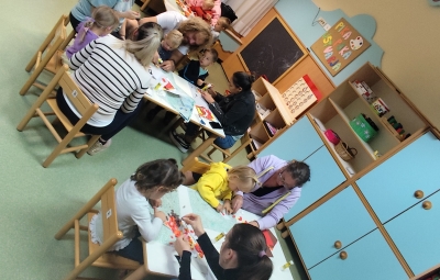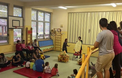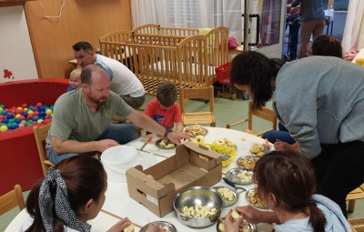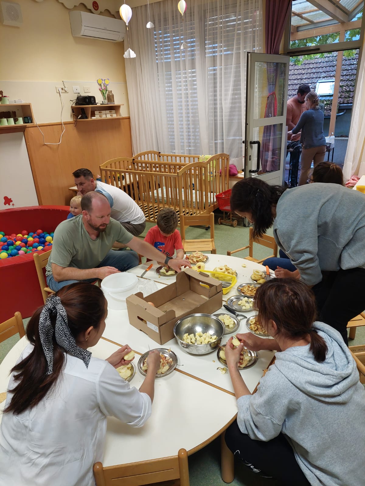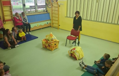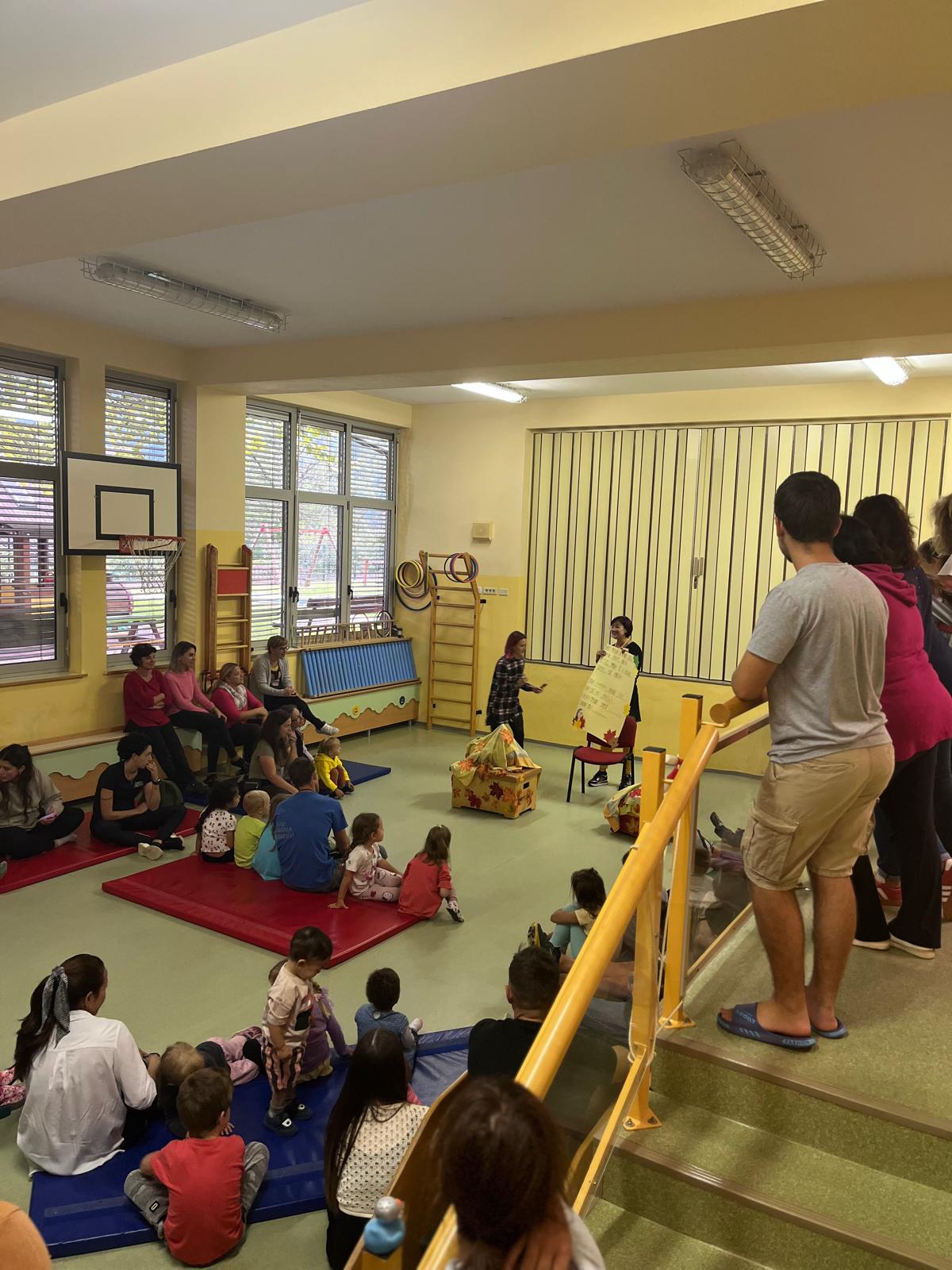 Tako smo začeli ponedeljkovo jesensko druženje, na katerega smo povabili naše starše. Skozi pesem, ki smo jo brez težav prepoznali in ujeli vse besede nazaj v stavke, smo priklicali še tetko Jesen, ki se je mudila v okolici našega vrtca. Prisluhnila je našemu petju, s seboj prinesla zvrhano košaro dobrot, sadja in zelenjave, ter nekaj pripravkov, s katerimi bomo še dodatno krepili naše zdravje. Po pogovoru in prepevanju smo se od nje poslovili, močno zavihali rokave, ter se podali v igralnice, kjer smo se lotili ustvarjati jesensko dekoracijo. Vsaka skupina je ustvarjala svoje, na koncu pa smo vse izdelke združili v eno čudovito dekoracijo, ki krasi hodnike našega vrtca. Ko smo se že skoraj poslovili drug od drugega, so nas presenetili starši, otroci in vzgojiteljice skupine Medvedki in Barvic. Združili so moči in poskrbeli za sladko presenečenje, ki so se ga otroške oči še bolj razveselile. Za otroke in vse starše so pripravili slasten kompot iz jesenskih dobrot, ter jabolka v srajčki. Turoben in z dežjem prepleten ponedeljek je tako dobil drug pomen, dan je bil zaključen v najlepši luči, skozi katerega smo ustvarili čudovit spomin.