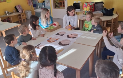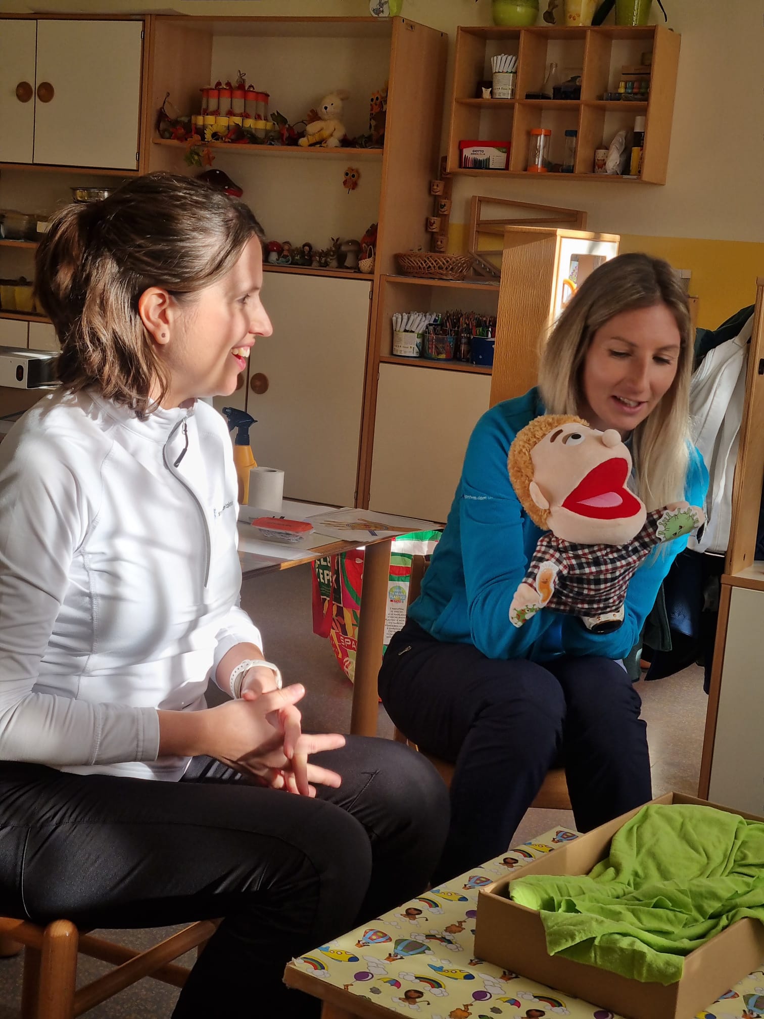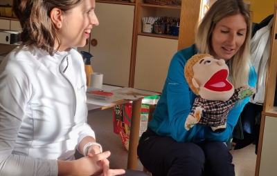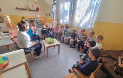 V vrtcu sta nas v skupinah "Zajčki" in "Ptički" obiskali medicinski sestri Špela Čujec in Tina Fon, skupaj z maskoto Maticem, ki je prišel ves prehlajen in bolan.