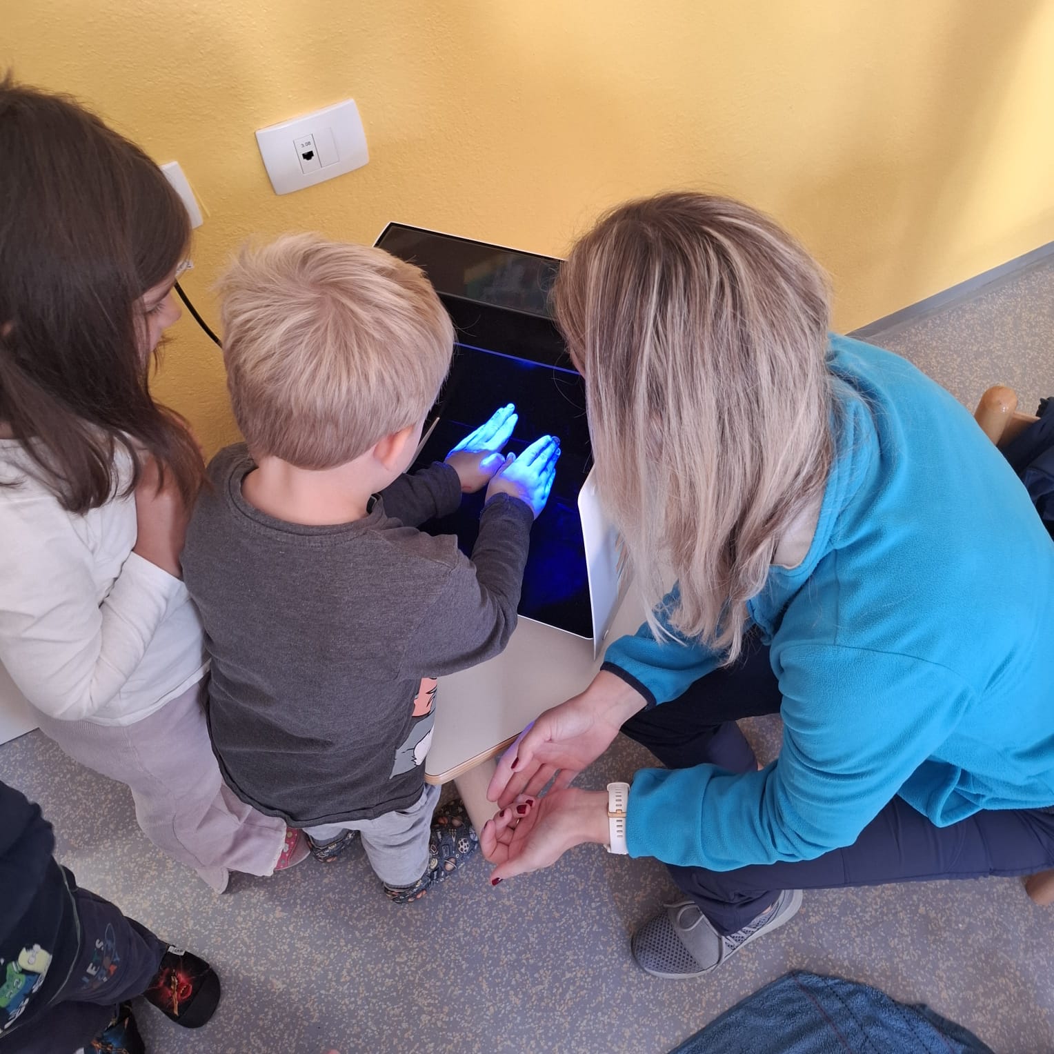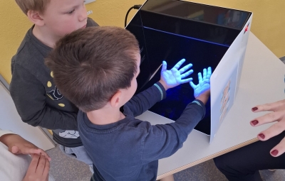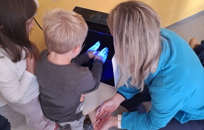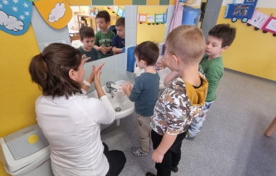 Zato je pomembno umivanje rok. Povedali smo, kdaj vse jih umivamo. Z zgodbico o vožnji traktorja smo se naučili, kako pravilno umivamo roke, nato smo to preizkusili še v praksi in pod lučko preverili, kako dobro smo si jih umili - koliko škratov je ostalo na naših rokah.