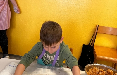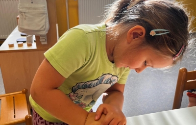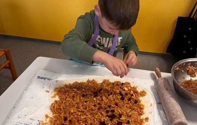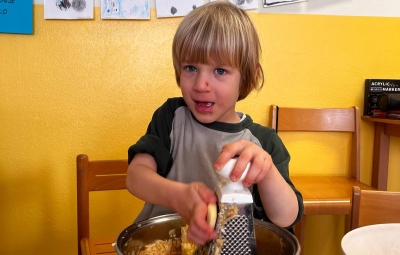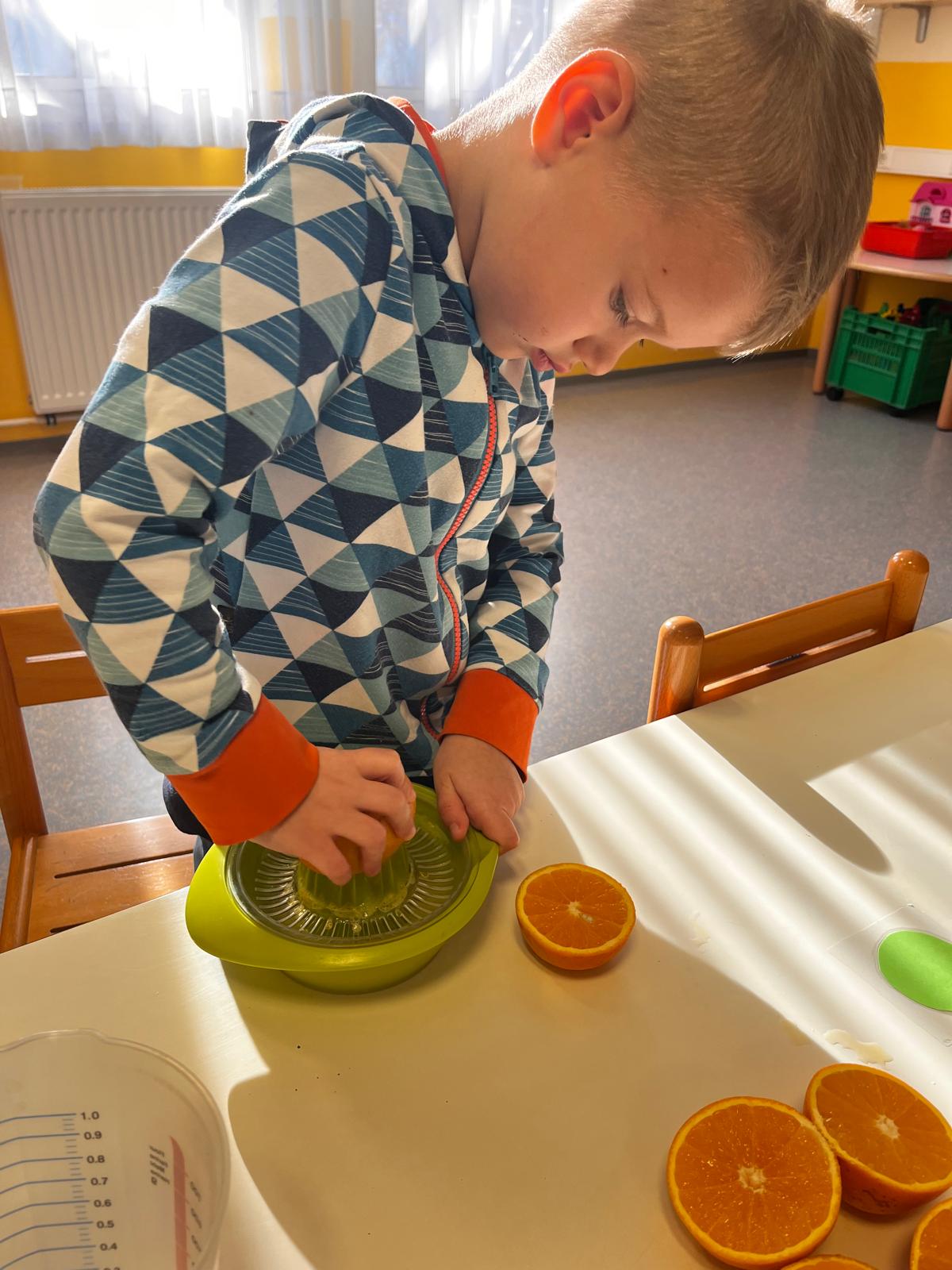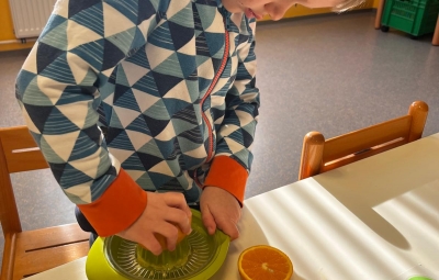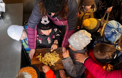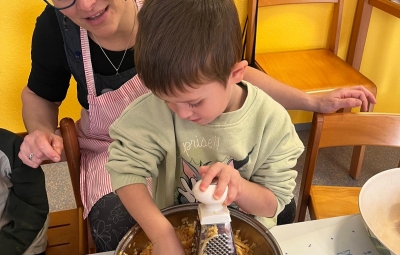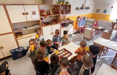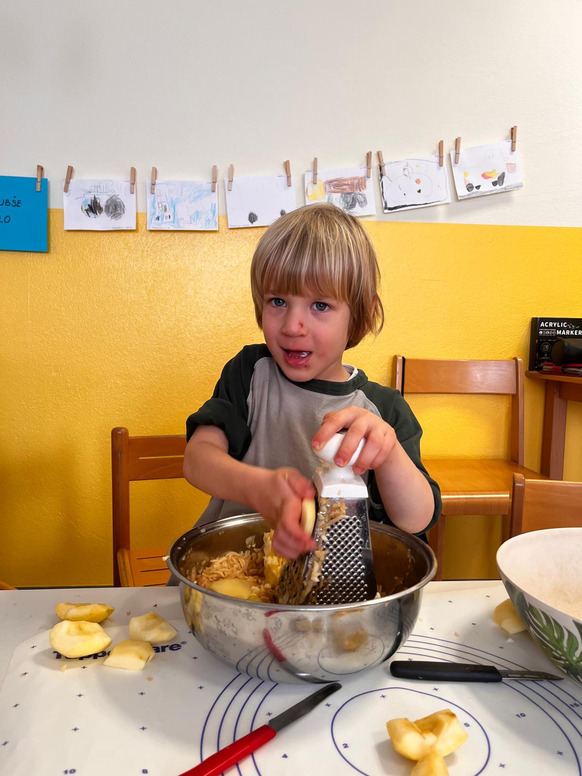 V skupini "Zajčki" smo se v tem tednu pogovarjali o domači, tradicionalni slovenski in zdravi prehrani. Šolarji so nam pripravili kar nekaj okusnih obrokov: sadno kupo, pica kruhke, smoothie iz kakija, tunine zavitke, hokaido bučno juho, brokolijevo juho, jabolčno pito ter še kaj. Vse smo z veseljem poskusili in tudi pojedli. Pozitivna spodbuda in zgled vzgojiteljic je pri tem ključnega pomena in me smo bile pri tem zelo uspešne. Tudi mi smo v tem tednu poleg raznolikega sadja, ki ga uživamo vsakodnevno, stiskali pomarančni sok, naredili štrudenj, pri tem pa poizkusili še sok jabolk, ki smo ga stisnili med samim delom. Otroci so se sami preizkusili v lupljenju, ribanju jabolk, kasneje pa tudi pri valjanju testa in dodajanju sestavin v jabolčni zavitek. Vsi otroci so ga poskusili in brez zadržkov pojedli. Ostale vzgojiteljice, vodjo vrtca in kuharico, ki nam ga je skrbno spekla, smo razveselili s koščkom le tega. Po vrtcu nam je prav prijetno dišalo. Prepričana sem, da bodo otroci v kratkem tudi doma delali in pekli štrudelj.