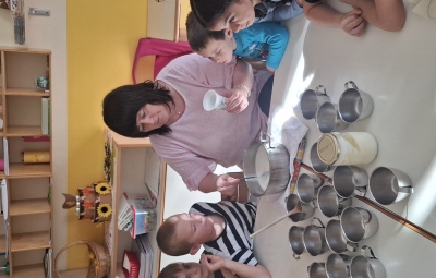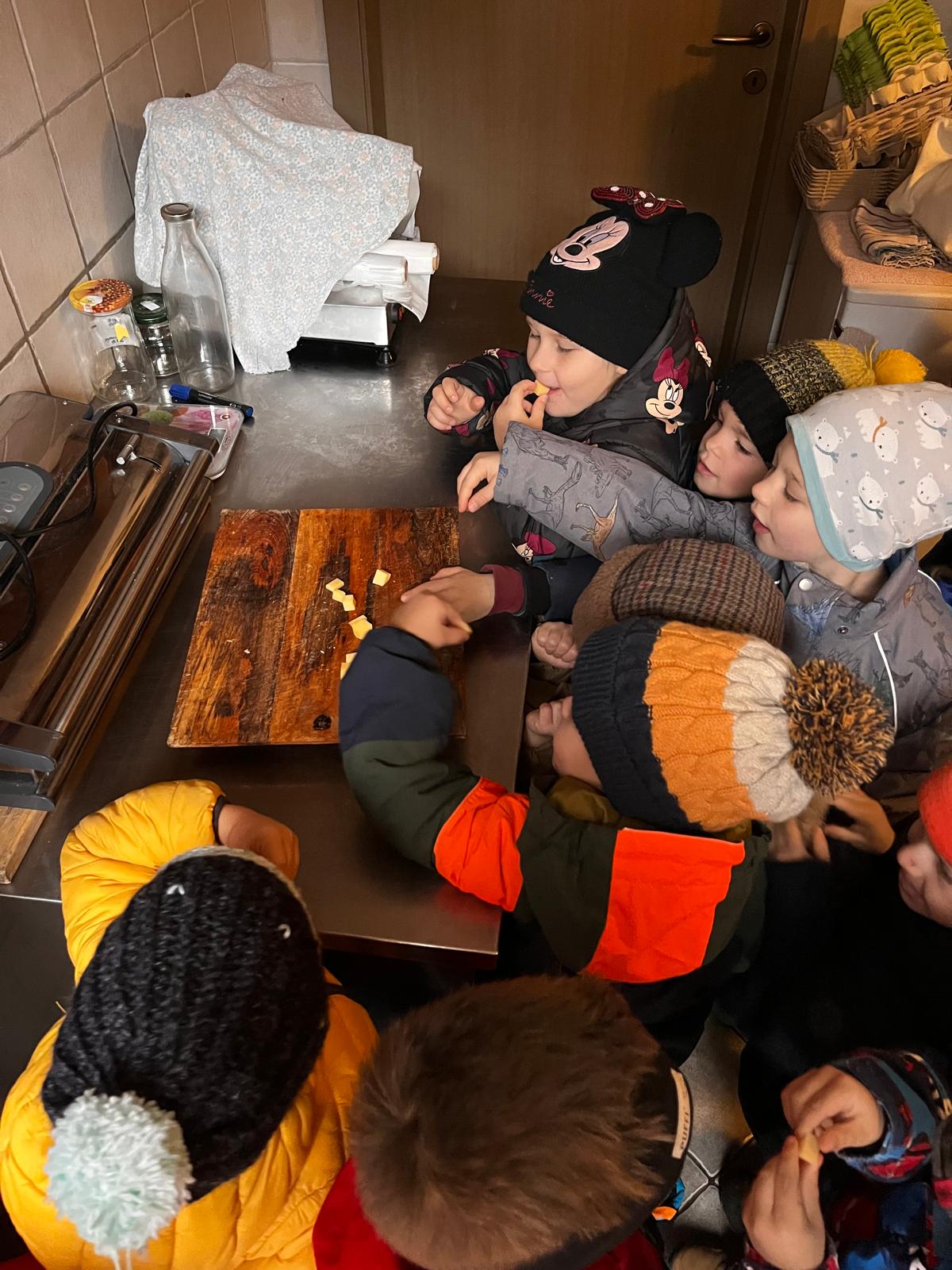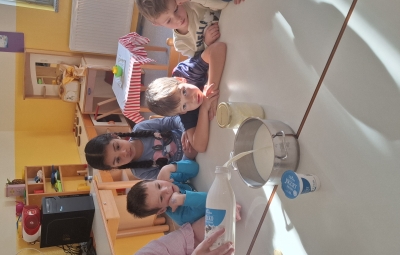 V skupini "Ptički" se že nekaj časa pogovarjamo o zdravi, lokalni, slovenski hrani. Veliko smo se pogovarjali o zajtrku, kako je pomemben in kakšen je zdrav zajtrk. Ta teden nas čaka tudi tradicionalni slovenski zajtrk, ko na ta dan jemo kruh, maslo, med, mleko in jabolko. V naši skupini smo letos posvetili pozornost mleku in mlečnim izdelkom. Spoznali smo pravljico Bela pot, ki govori, katere mlečne izdelke lahko izdelamo iz mleka. Tudi sami smo v tem tednu izdelali domače maslo in domač jogurt. Naslednji dan pa smo skupaj z otroki iz skupine "Zajčki" obiskali sirarno pri kmetu Blažu Kravanja v Mali vasi. Kmet Blaž nam je pokazal, kako se naredita sir in skuta. Naredil je kar 3 sire in 7 kg skute. Poskusili smo obrezke svežega, mladega sira in nato še že zorjeni in osoljeni sir. Bil je slasten.