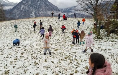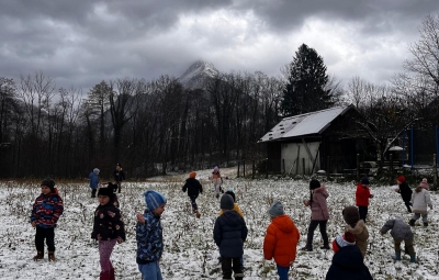 Pot pa nas je popeljala še na zasnežen travnik, saj je prvi sneg pobelil polje. Hodili smo po snegu, se lovili, kepali in občutili kakšen je. Bilo je nepopisno zimsko veselje otrok in vzgojiteljic. Lica so bila jabolka rdeča, noski pa ledena sveča. V vrtcu pa nas je čakal že topel čaj z medom.