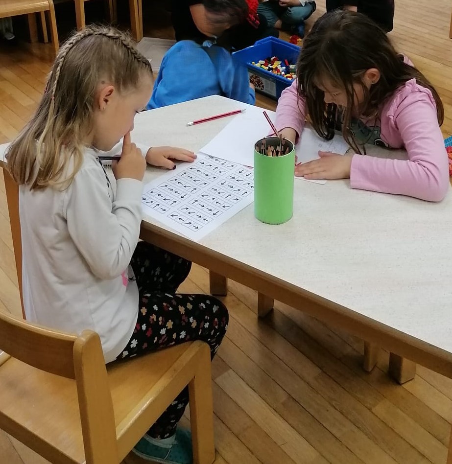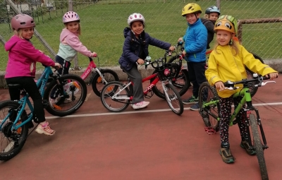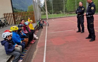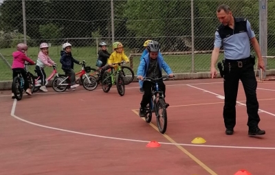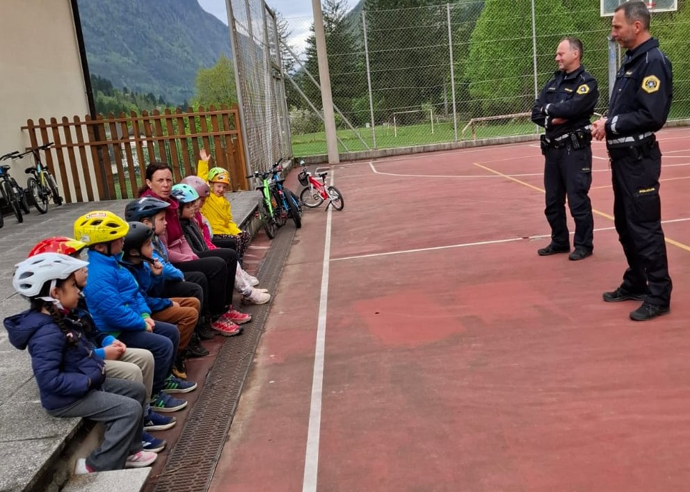 Po malici sta se jim najprej pridružila policista Valter Čarga in Ambrož Skočir in skupaj so spoznavali pravila in varnost pešcev in kolesarjev v prometu. Nato sta jim pripravila kolesarski poligon, ki so ga vsi otroci odlično opravili.