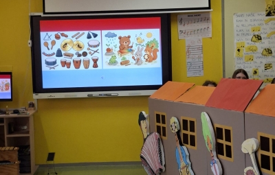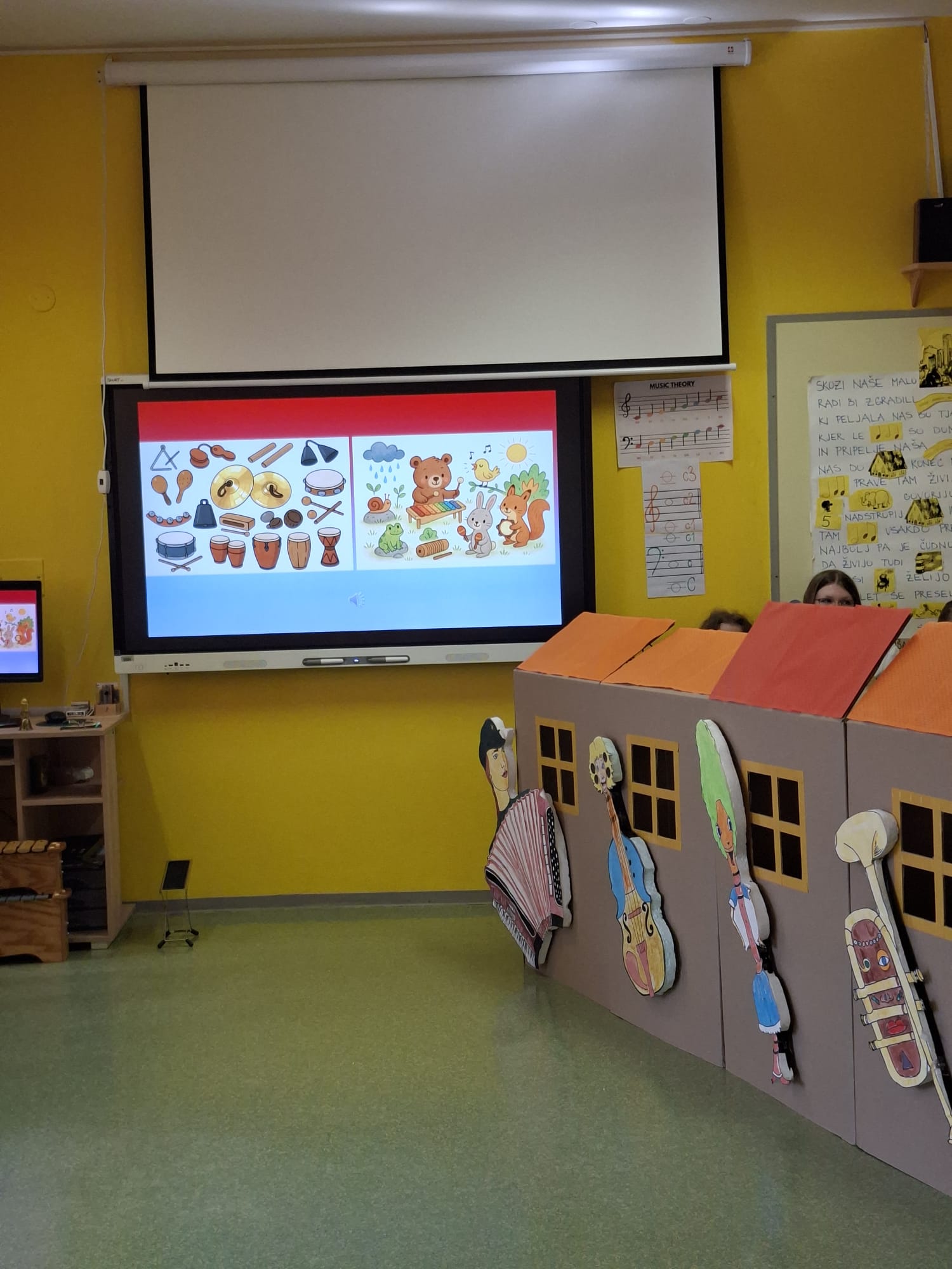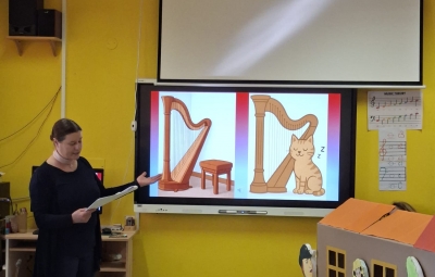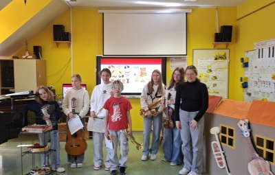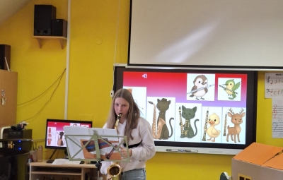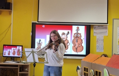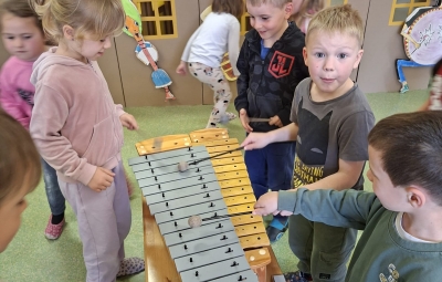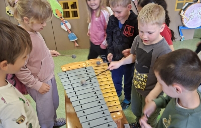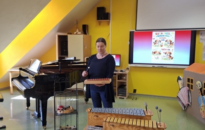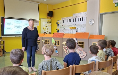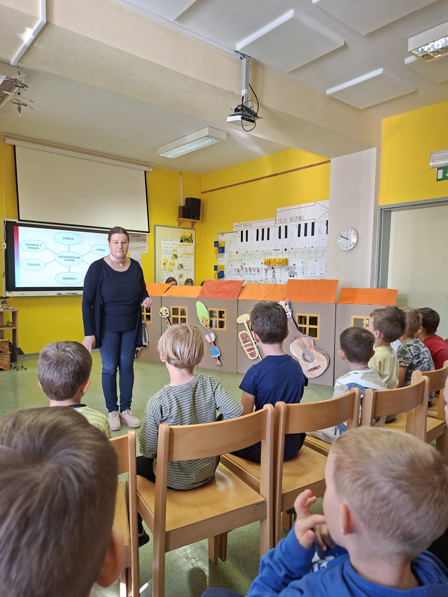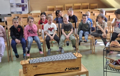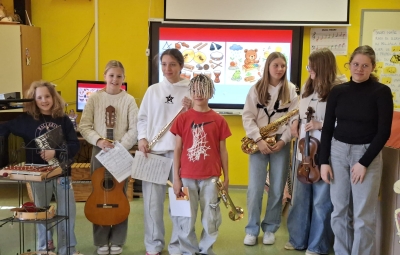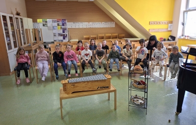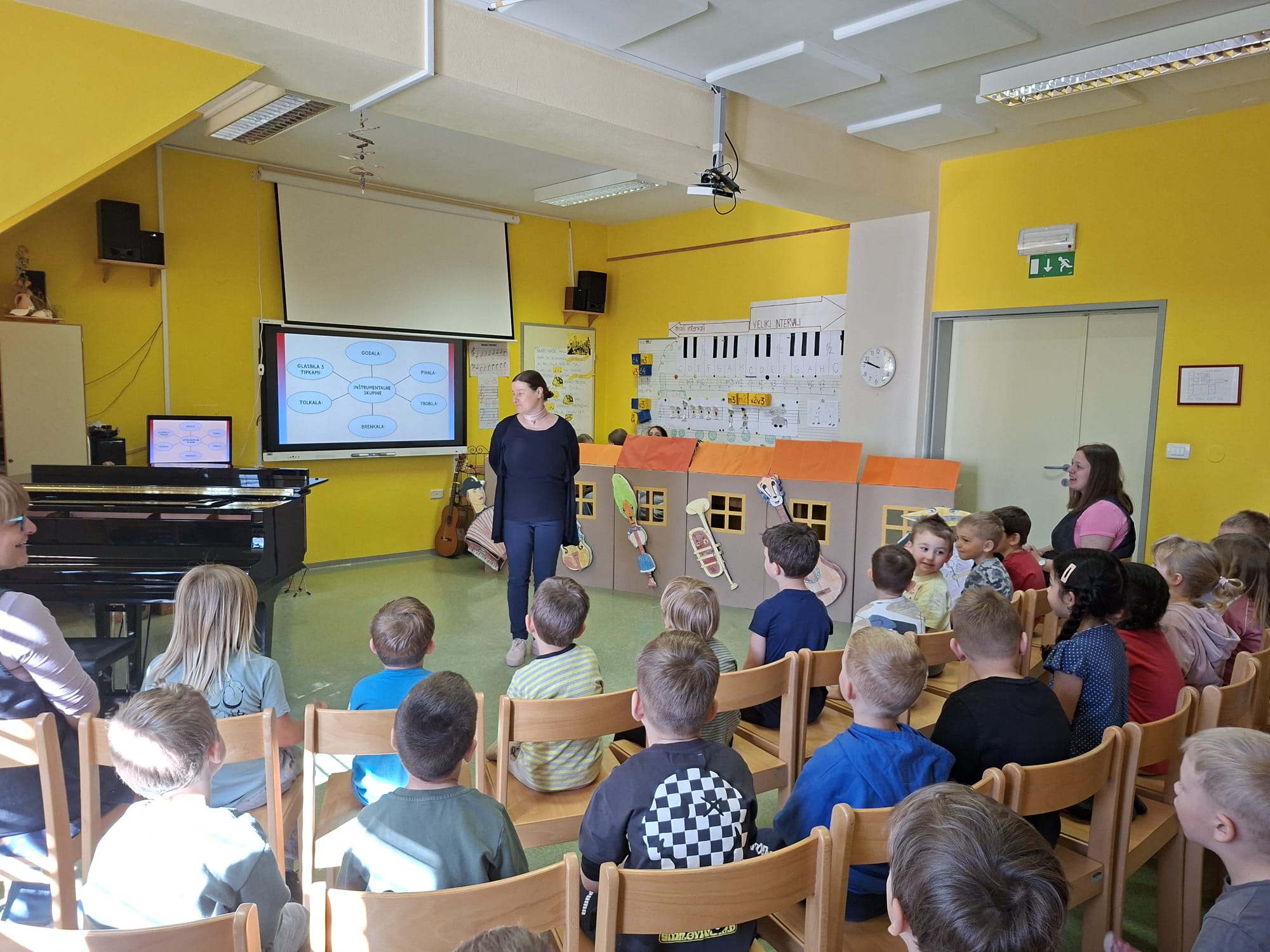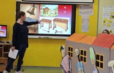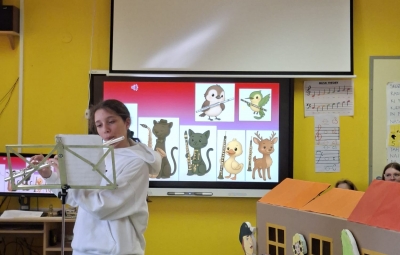 V sredo, 8.4.2026, je otroke iz skupin "Ptički" in " Zajčki" učiteljica glasbe, Katja Skočir, povabila v glasbeno šolo v Bovcu. Pripravila nam je predstavitev instrumentalnih skupin. Vsaka vrsta instrumentov je bila v svoji hišici. V eni hišici so bila predstavljena godala, v drugi pihala, tretji trobila, četrti brenkala, v peti tolkala in v šesti glasbila s tipkami. Na zabaven in igriv način nam je predstavila vse instrumente. Vsakega nam je v obliki rime opisala. Nekatere instrumente nam je predvajala na računalniku, da smo jih slišali in poslušali, nekaterim smo prisluhnili v živo, ko so nanje zaigrali učenci osnovne šole Bovec, ki obiskujejo glasbeno šolo. Igrali so kitaro, violino, prečno flavto, klavir, saksofon, trobento...
