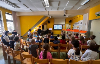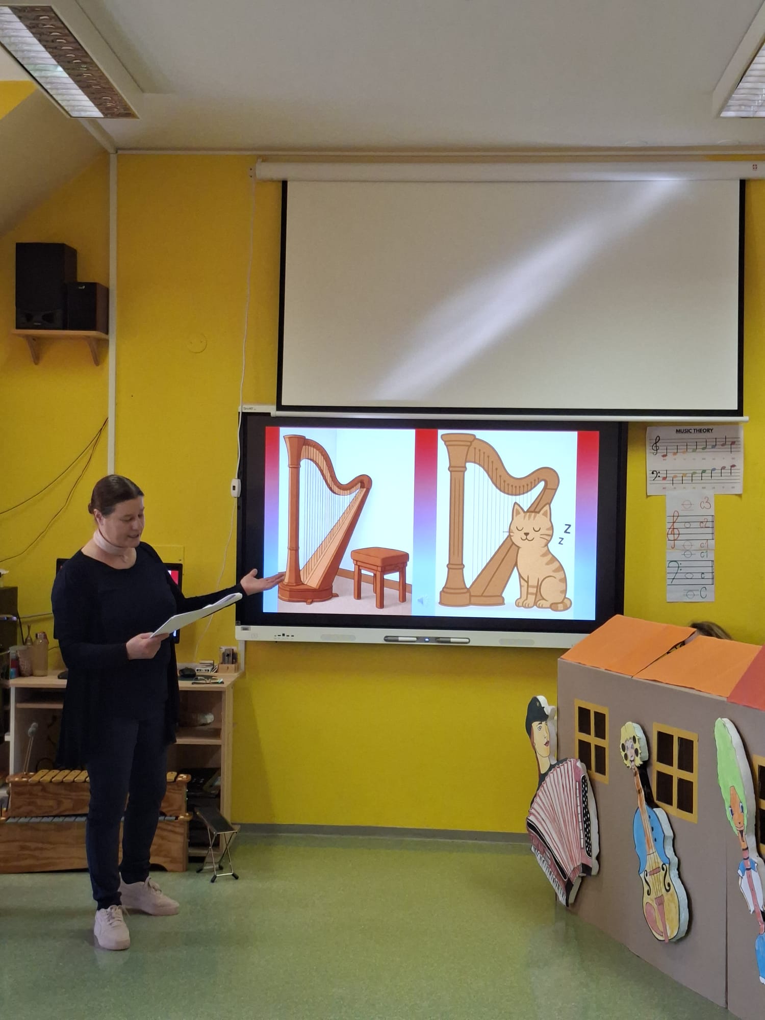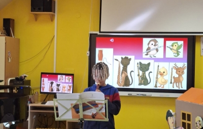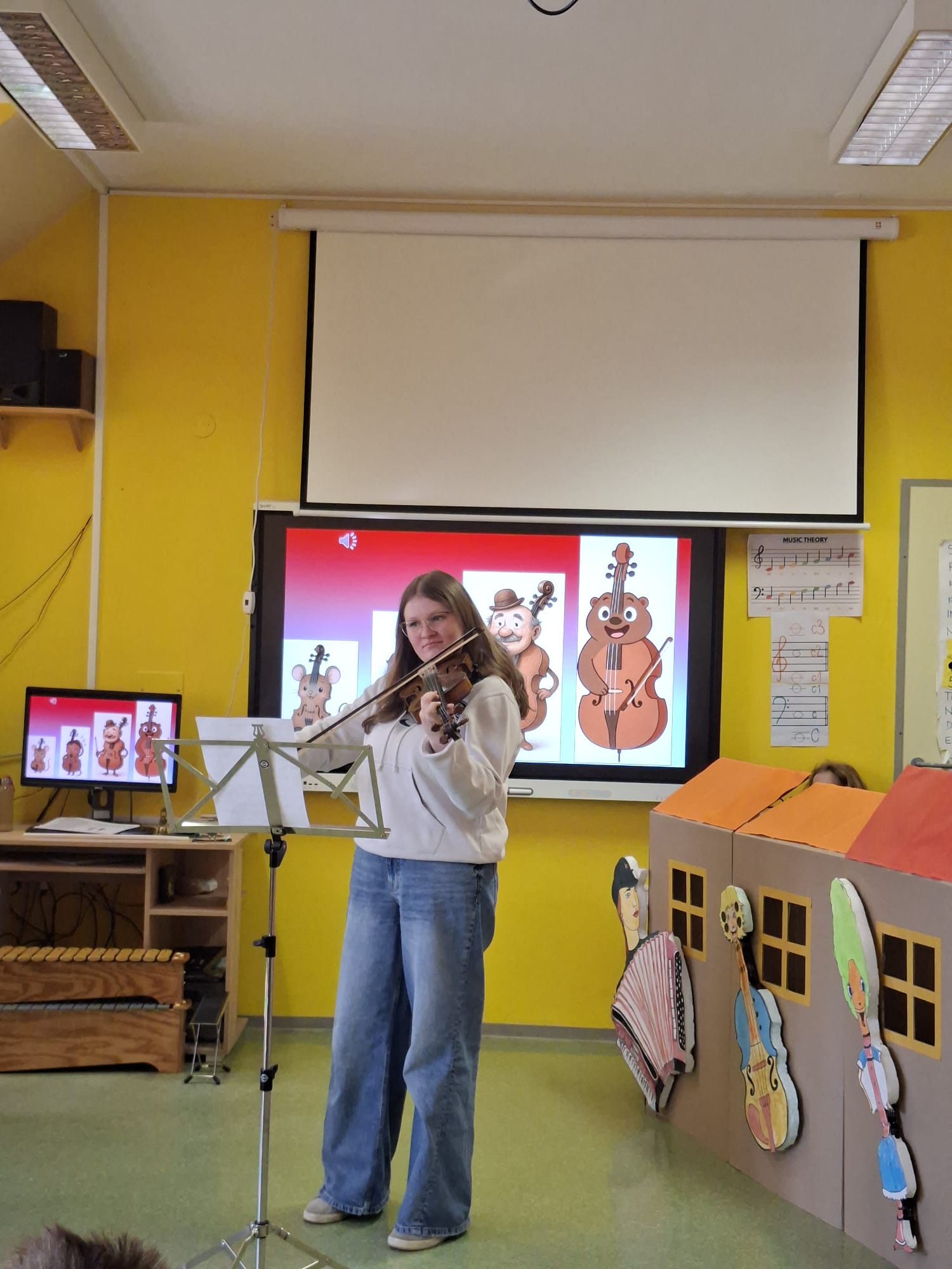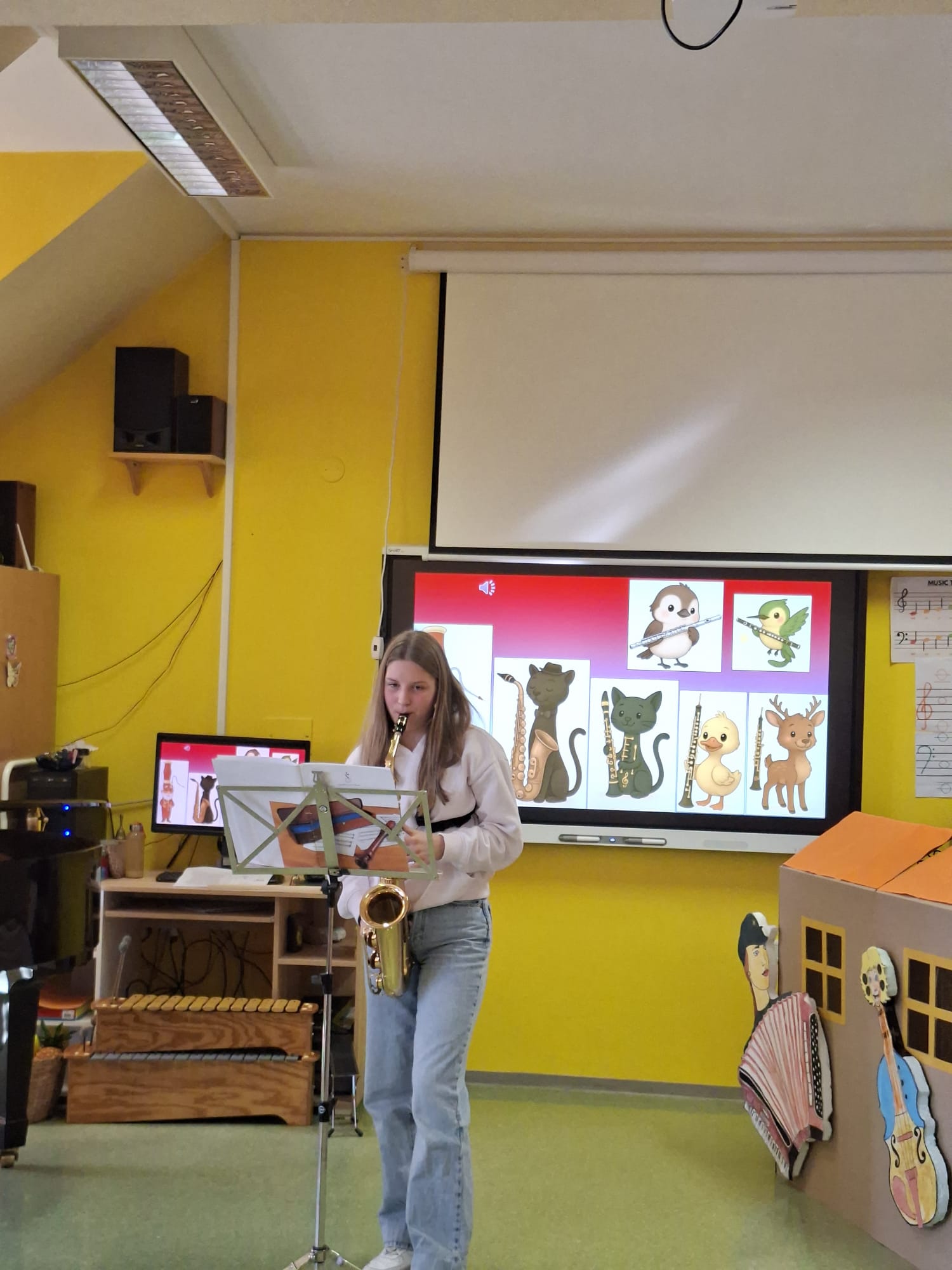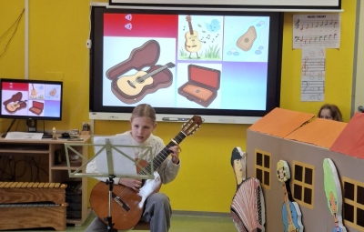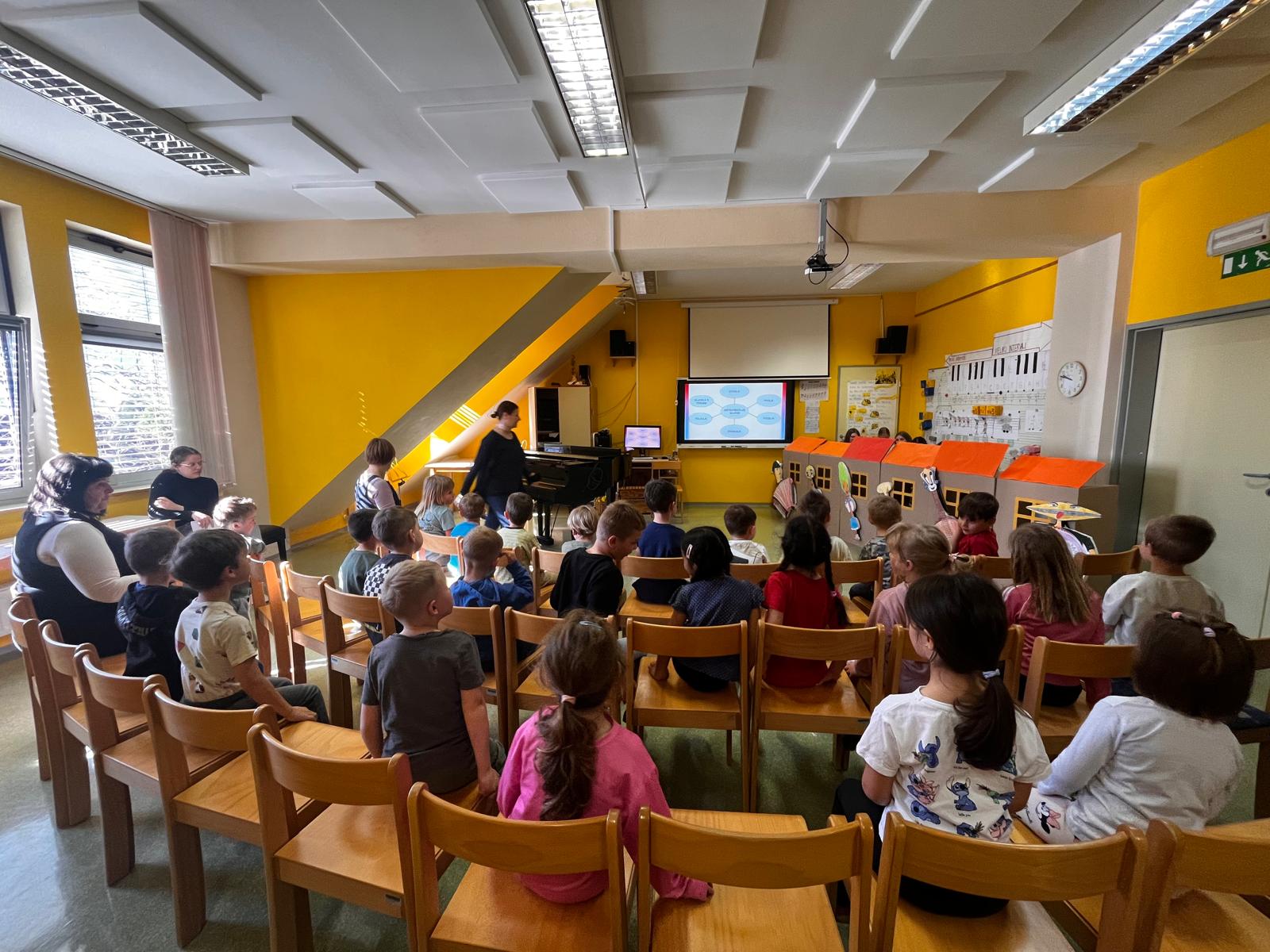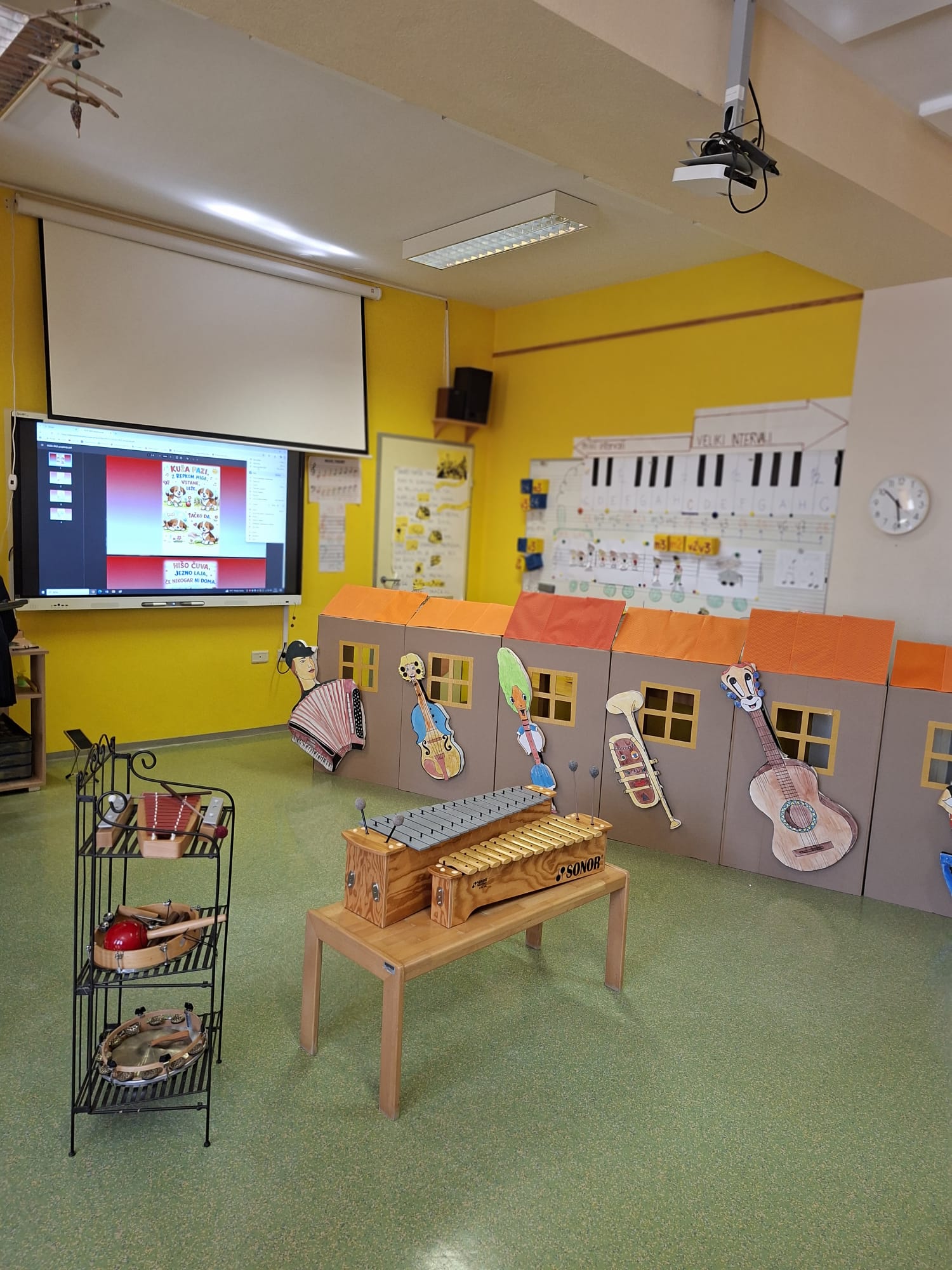 V sredo, 8.4.2026, je otroke iz skupin "Ptički" in " Zajčki" učiteljica glasbe, Katja Skočir, povabila v glasbeno šolo v Bovcu. Pripravila nam je predstavitev instrumentalnih skupin. Vsaka vrsta instrumentov je bila v svoji hišici. V eni hišici so bila predstavljena godala, v drugi pihala, tretji trobila, četrti brenkala, v peti tolkala in v šesti glasbila s tipkami. Na zabaven in igriv način nam je predstavila vse instrumente. Vsakega nam je v obliki rime opisala. Nekatere instrumente nam je predvajala na računalniku, da smo jih slišali in poslušali, nekaterim smo prisluhnili v živo, ko so nanje zaigrali učenci osnovne šole Bovec, ki obiskujejo glasbeno šolo. Igrali so kitaro, violino, prečno flavto, klavir, saksofon, trobento...