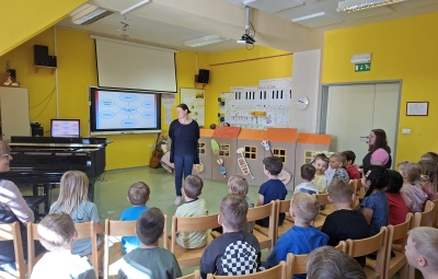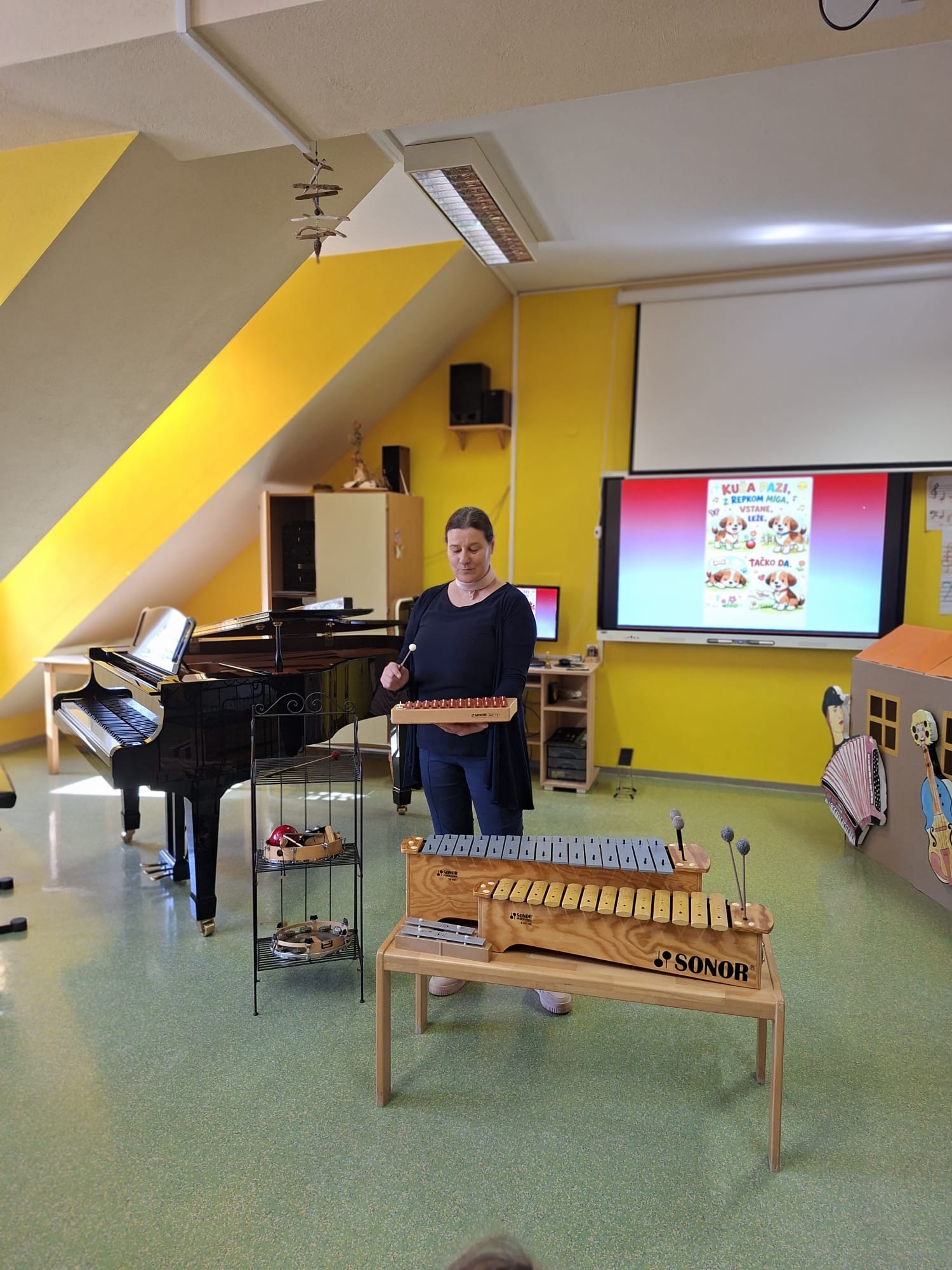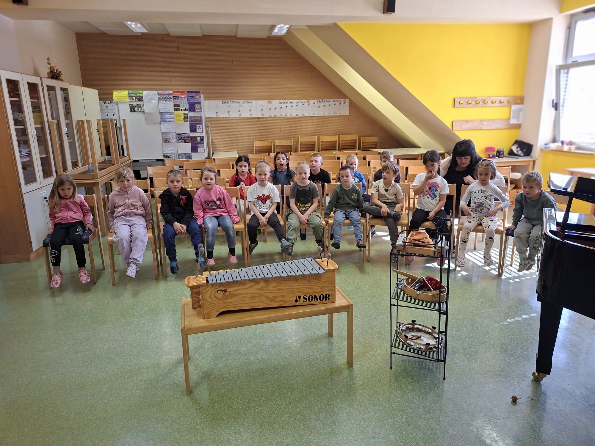 Spoznali smo še male ritmične instrumente, veliko jih poznamo ze tudi mi, saj jih uporabljamo v vrtcu. Za lep zaključek dneva, smo ob spremljavi učiteljice Katje, ki se je s svojimi prsti sprehajala čez klavirske tipke, zapeli še nekaj poznanih pesmic, ki jih pojemo v vrtcu ter smo z njimi nastopili na festivalu in naši prireditvi za mamice.