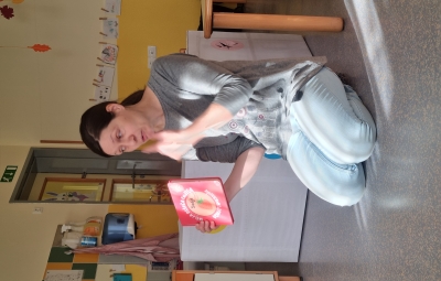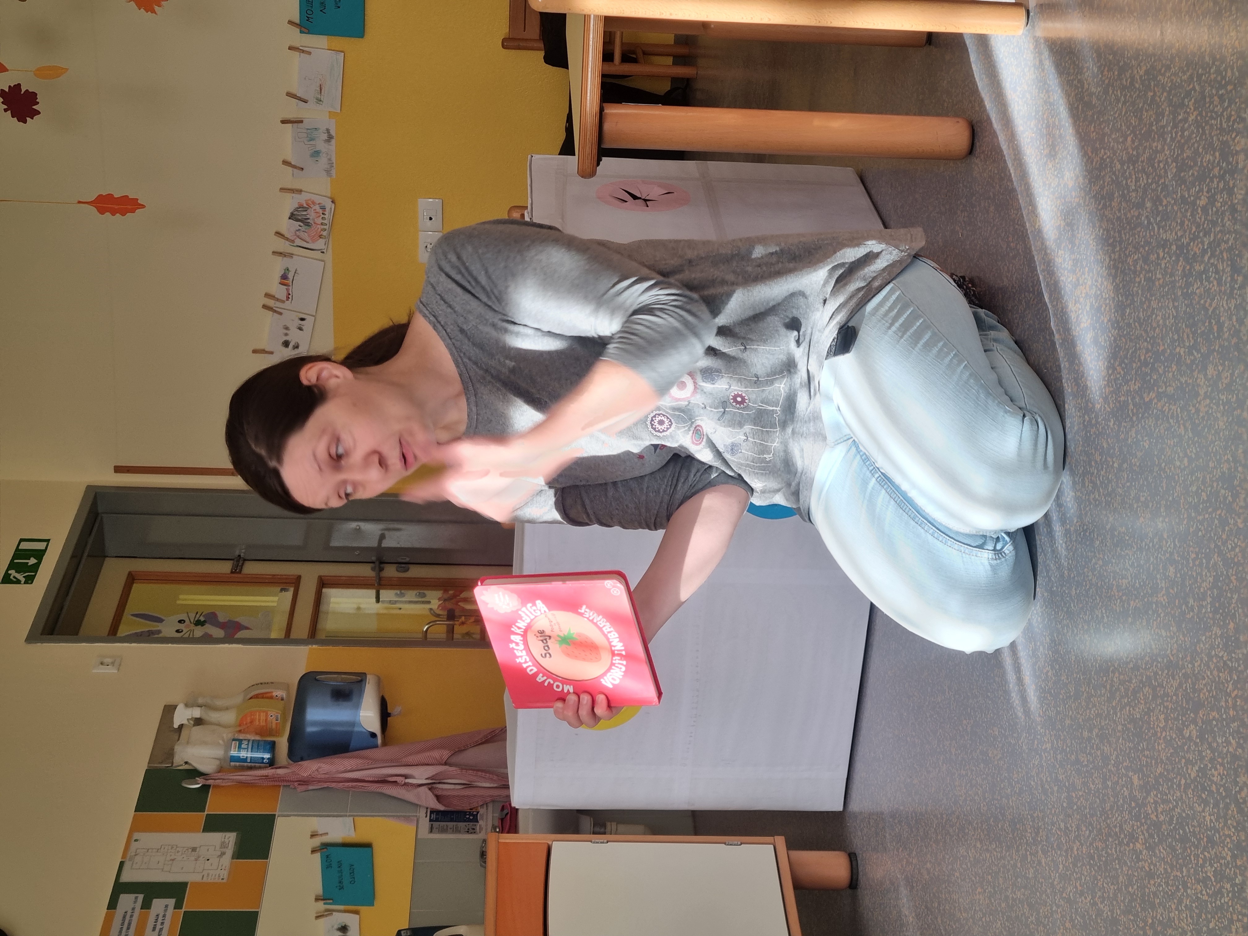 Na zanimiv način nam je približala knjigo " Moji dišeči okusi - sadje", kjer smo se spomnili imena, barve, okusa in vonja različnih vrst sadja, zraven pa je dodala še gibanje in spretnosti fine motorike.