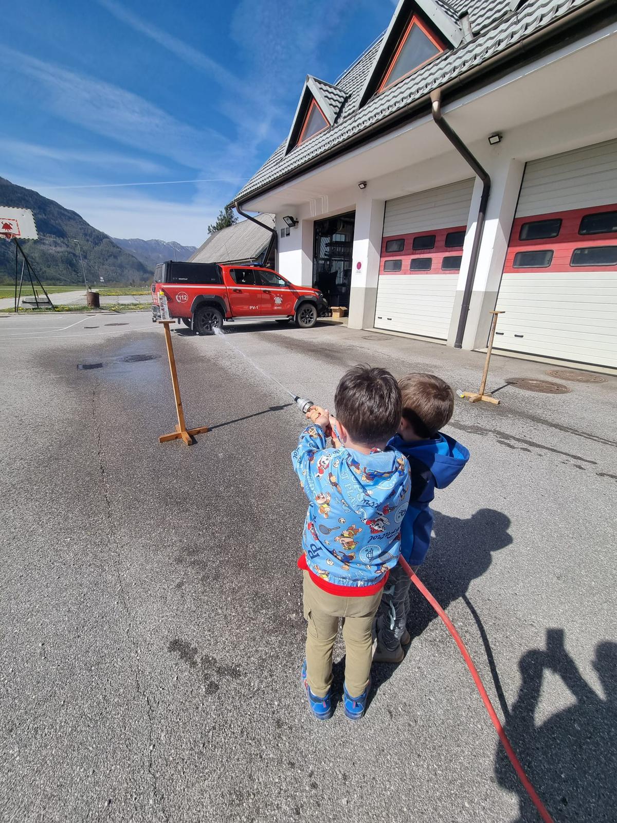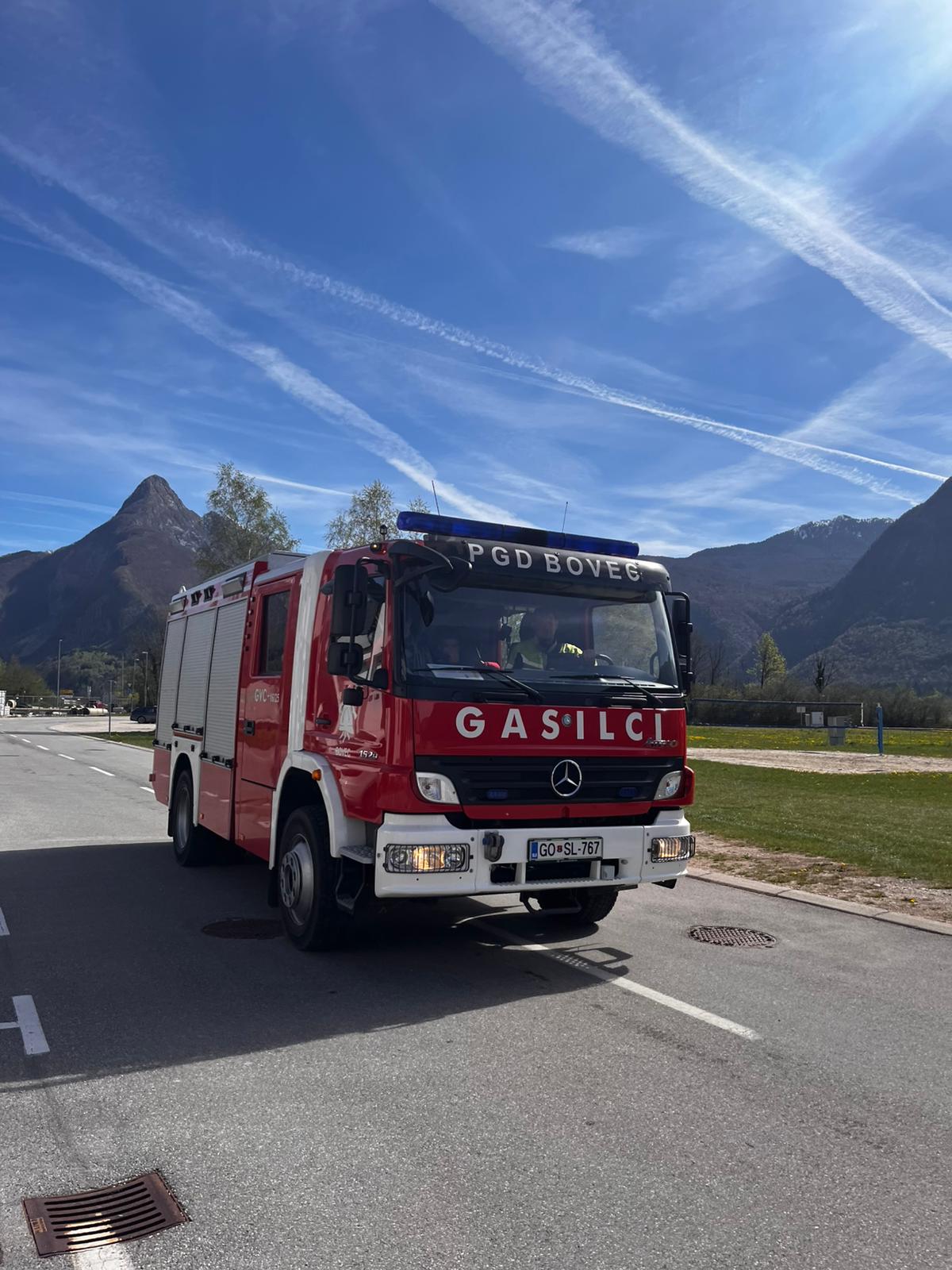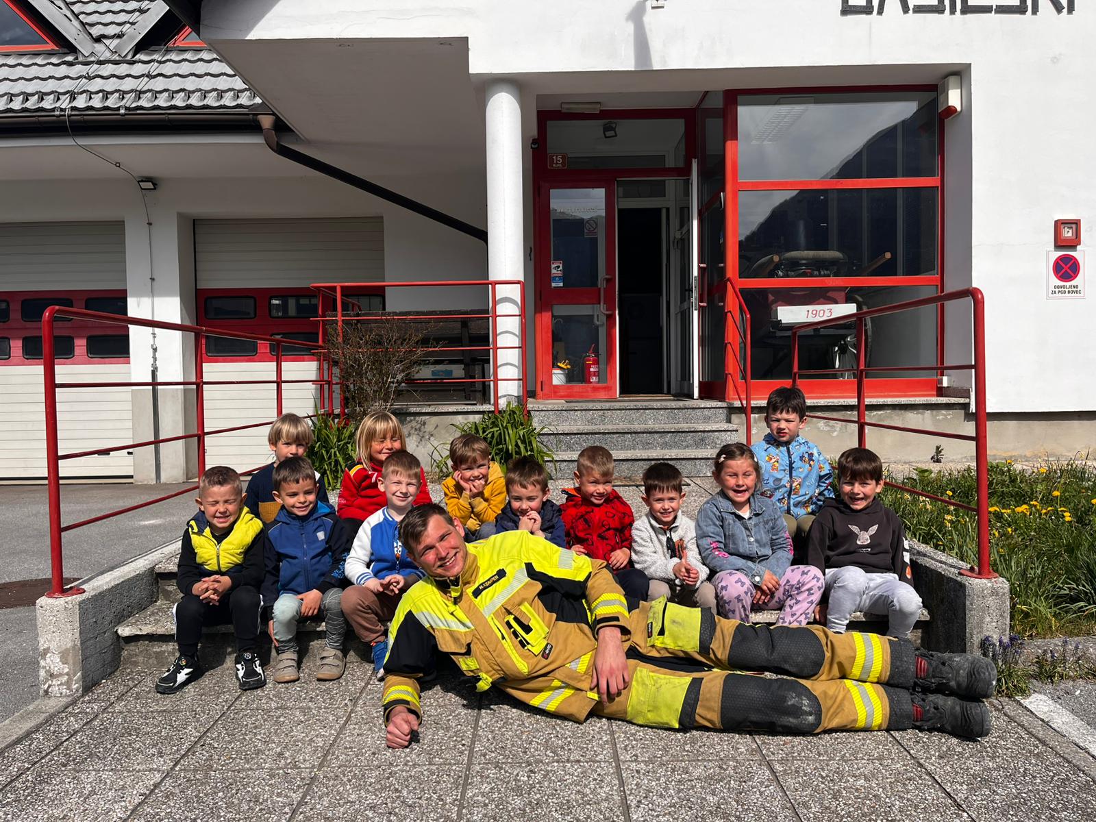 V četrtek, 9. aprila 2026, smo se otroci iz skupine Zajčki odpravili na prav posebno doživetje. Po krajšem sprehodu po Rupi nas je pot vodila do gasilskega doma PGD Bovec, kjer nas je prijazno sprejel prostovoljni gasilec Nejc Kemper. Gasilec Nejc nas je toplo pozdravil in nas popeljal na zanimiv ogled gasilnega doma. Najprej nam je predstavil prostor, namenjen izobraževanju in spremljanju intervencij, kjer smo opazili računalnike, kamere in veliko tablo. Nato smo si ogledali garderobo z gasilsko opremo. Otroci so spoznali različne vrste gasilskih oblek – lažje za vsakodnevno delo in težje, ki gasilce ščitijo pri zahtevnejših intervencijah. Z zanimanjem so si ogledali tudi zaščitno opremo, kot so škornji, čelade in walkie talkie, nekateri pa so se v opremi tudi preizkusili. Sledil je ogled gasilskih in reševalnih vozil. Otroci so spoznali njihovo opremo ter način organizacije, ki gasilcem omogoča hitro in učinkovito ukrepanje. Posebno zanimanje je pritegnil prikaz orodja v vozilih ter razlaga njegove uporabe. Za dodatno popestritev je gasilec Nejc pripravil zabavno in poučno igro, pri kateri so otroci s curkom vode ciljali tarčo, vzgojiteljici pa sta poskrbeli za pogon vode. Navdušenje otrok je bilo neizmerno, saj so vsi uspešno zadeli tarčo oziroma »pogasili ogenj«. Za vrhunec obiska je sledila še vožnja z gasilskim vozilom, ki je bila za mnoge prav posebno in nepozabno doživetje.Po končanem obisku smo se gostitelju zahvalili za prijaznost in nepozabno izkušnjo ter skupaj naredili pravo gasilsko fotografijo. Nato smo se odpravili na bližnje nogometno igrišče, kjer so se otroci še sproščeno razgibali. Dejavnosti smo zaključili z umirjenim počitkom na travi in poslušanjem zvokov narave.