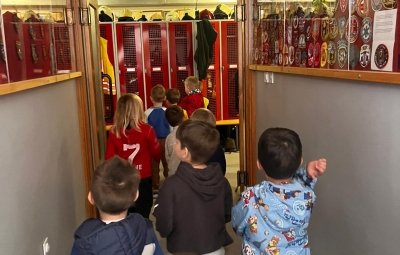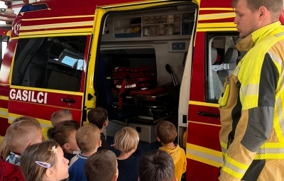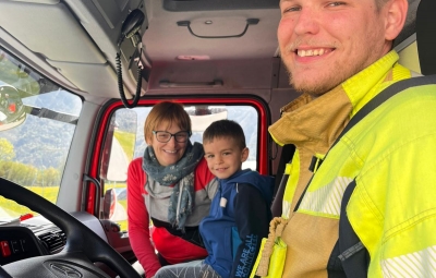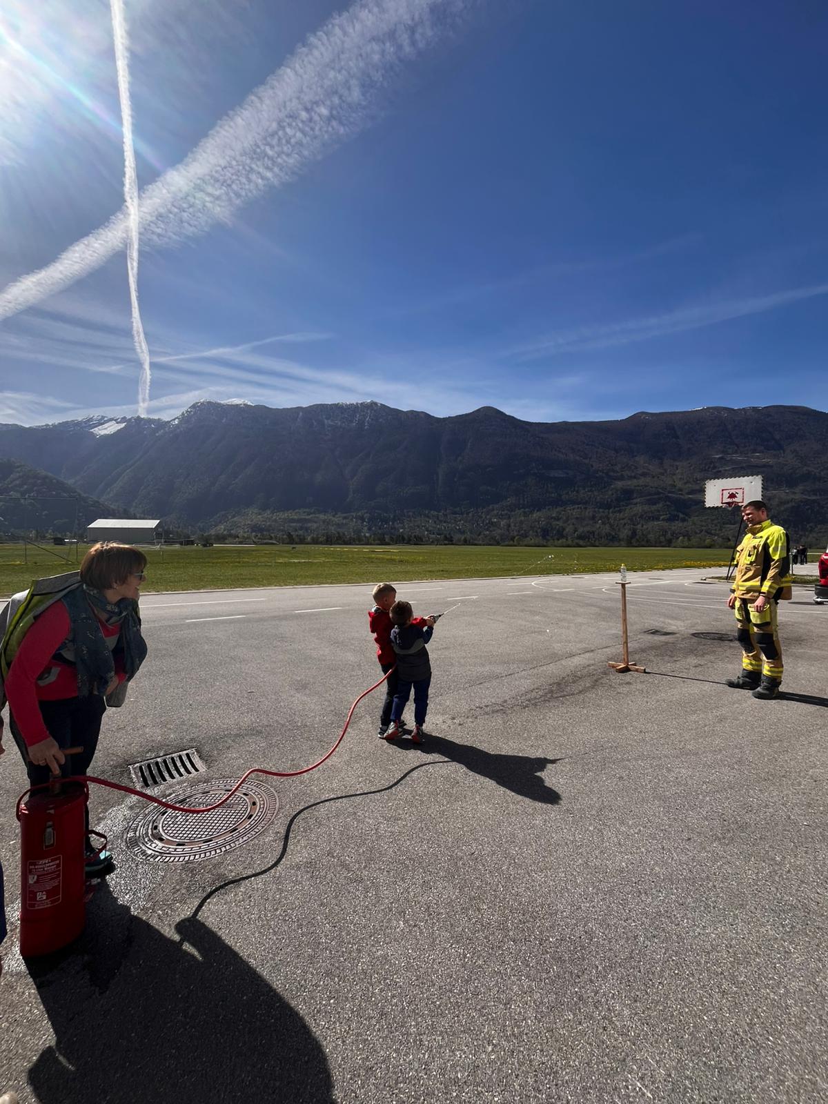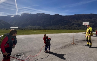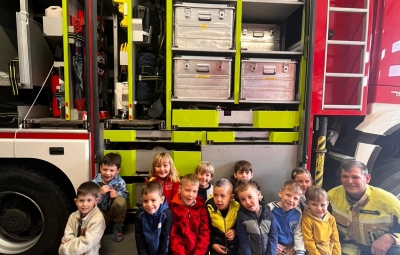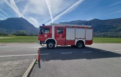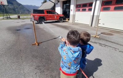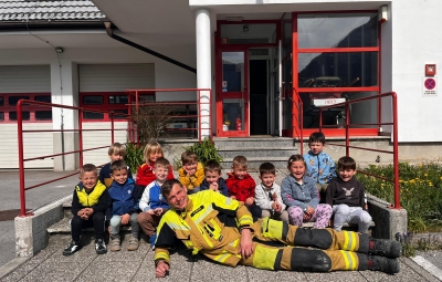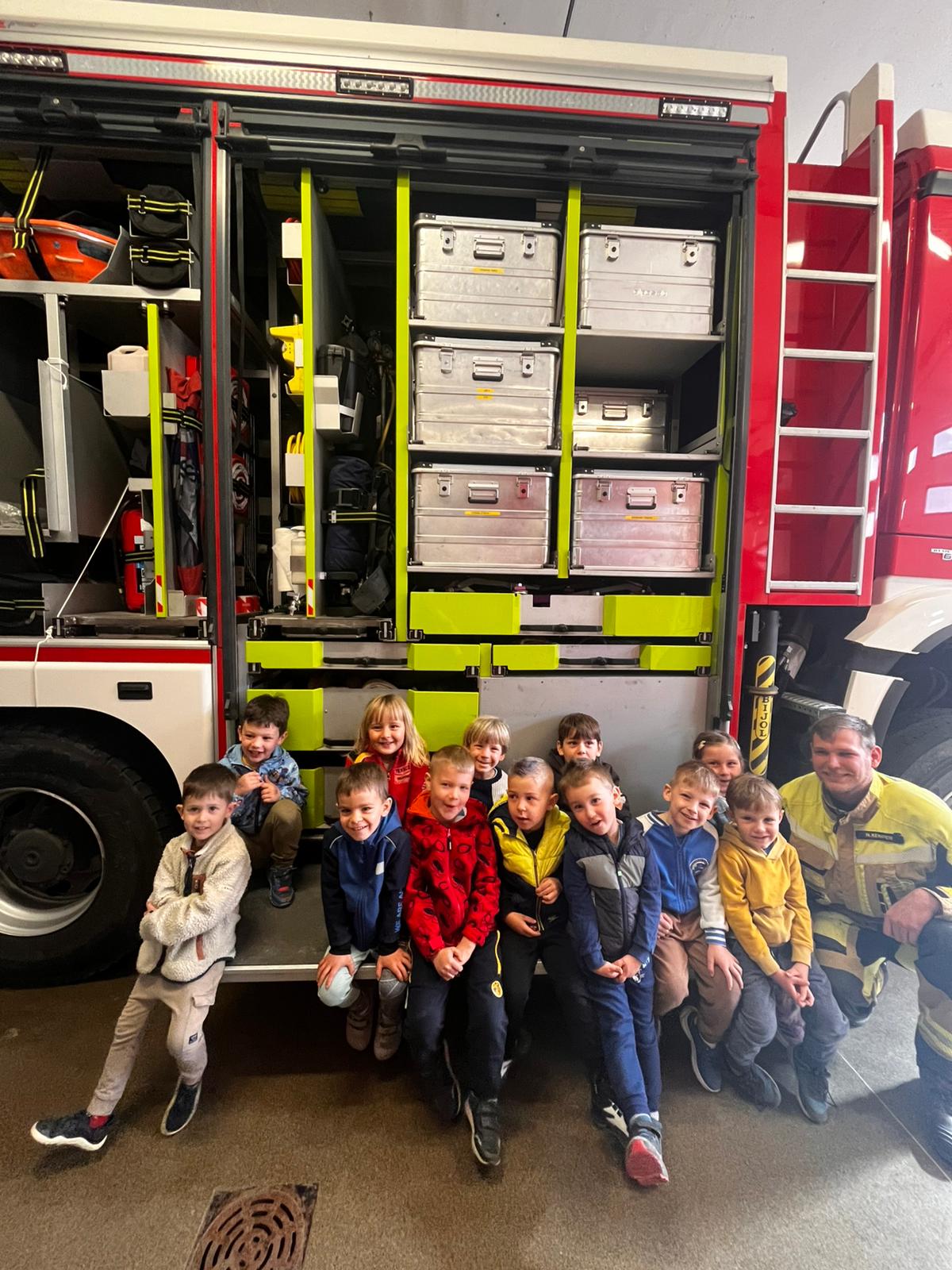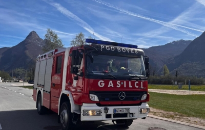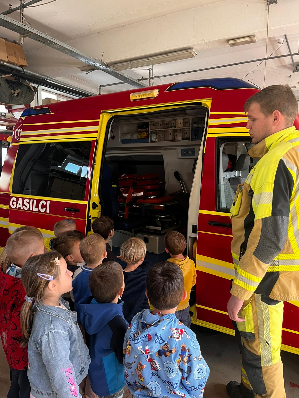 V četrtek, 9. aprila 2026, smo se otroci iz skupine Zajčki odpravili na prav posebno doživetje. Po krajšem sprehodu po Rupi nas je pot vodila do gasilskega doma PGD Bovec, kjer nas je prijazno sprejel prostovoljni gasilec Nejc Kemper. Gasilec Nejc nas je toplo pozdravil in nas popeljal na zanimiv ogled gasilnega doma. Najprej nam je predstavil prostor, namenjen izobraževanju in spremljanju intervencij, kjer smo opazili računalnike, kamere in veliko tablo. Nato smo si ogledali garderobo z gasilsko opremo. Otroci so spoznali različne vrste gasilskih oblek – lažje za vsakodnevno delo in težje, ki gasilce ščitijo pri zahtevnejših intervencijah. Z zanimanjem so si ogledali tudi zaščitno opremo, kot so škornji, čelade in walkie talkie, nekateri pa so se v opremi tudi preizkusili. Sledil je ogled gasilskih in reševalnih vozil. Otroci so spoznali njihovo opremo ter način organizacije, ki gasilcem omogoča hitro in učinkovito ukrepanje. Posebno zanimanje je pritegnil prikaz orodja v vozilih ter razlaga njegove uporabe. Za dodatno popestritev je gasilec Nejc pripravil zabavno in poučno igro, pri kateri so otroci s curkom vode ciljali tarčo, vzgojiteljici pa sta poskrbeli za pogon vode. Navdušenje otrok je bilo neizmerno, saj so vsi uspešno zadeli tarčo oziroma »pogasili ogenj«. Za vrhunec obiska je sledila še vožnja z gasilskim vozilom, ki je bila za mnoge prav posebno in nepozabno doživetje.Po končanem obisku smo se gostitelju zahvalili za prijaznost in nepozabno izkušnjo ter skupaj naredili pravo gasilsko fotografijo. Nato smo se odpravili na bližnje nogometno igrišče, kjer so se otroci še sproščeno razgibali. Dejavnosti smo zaključili z umirjenim počitkom na travi in poslušanjem zvokov narave.