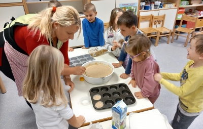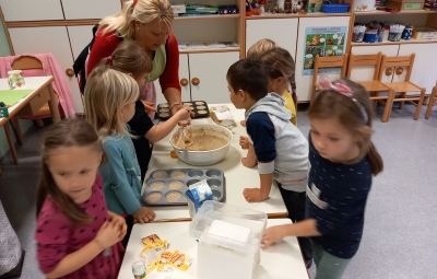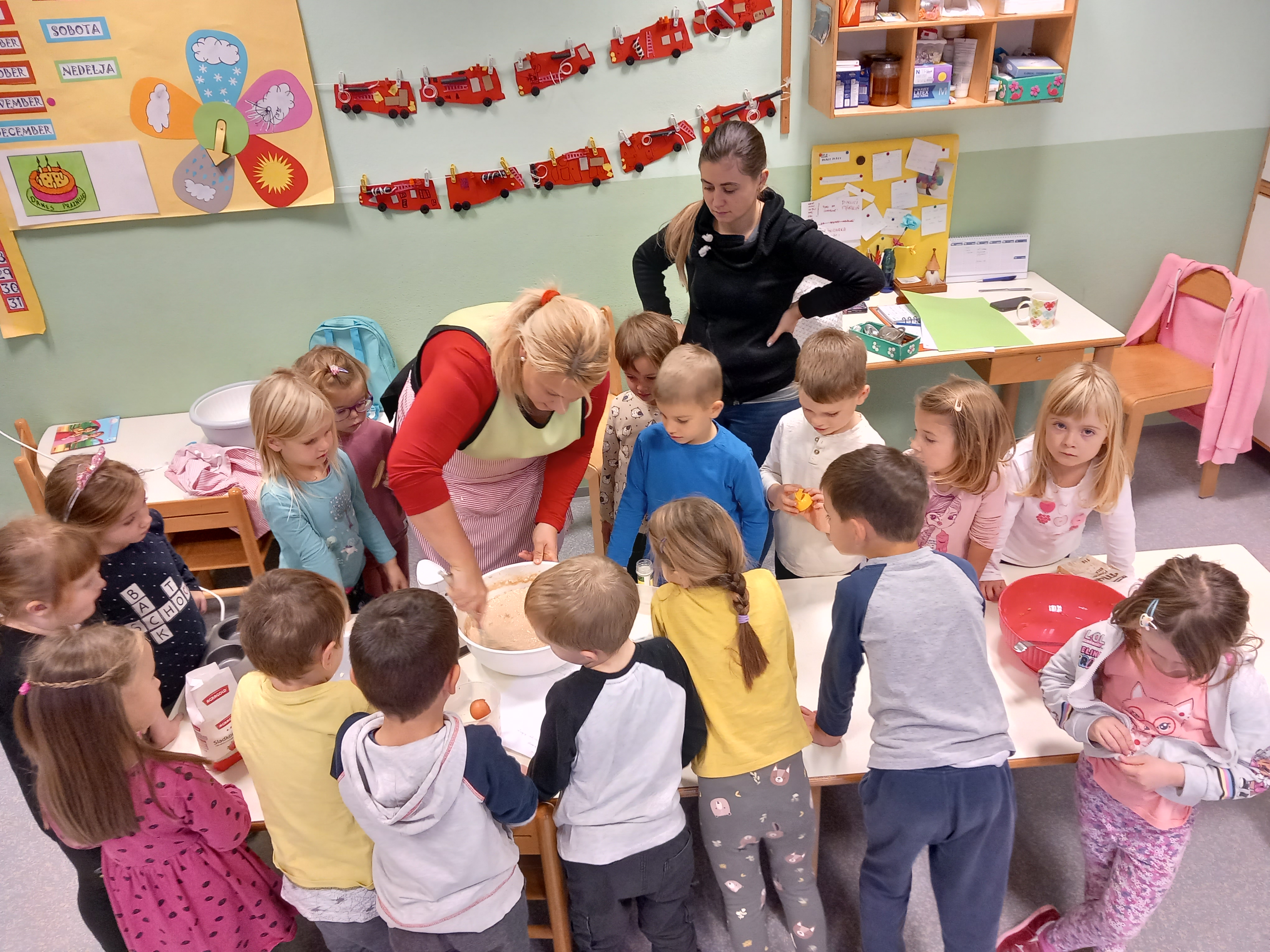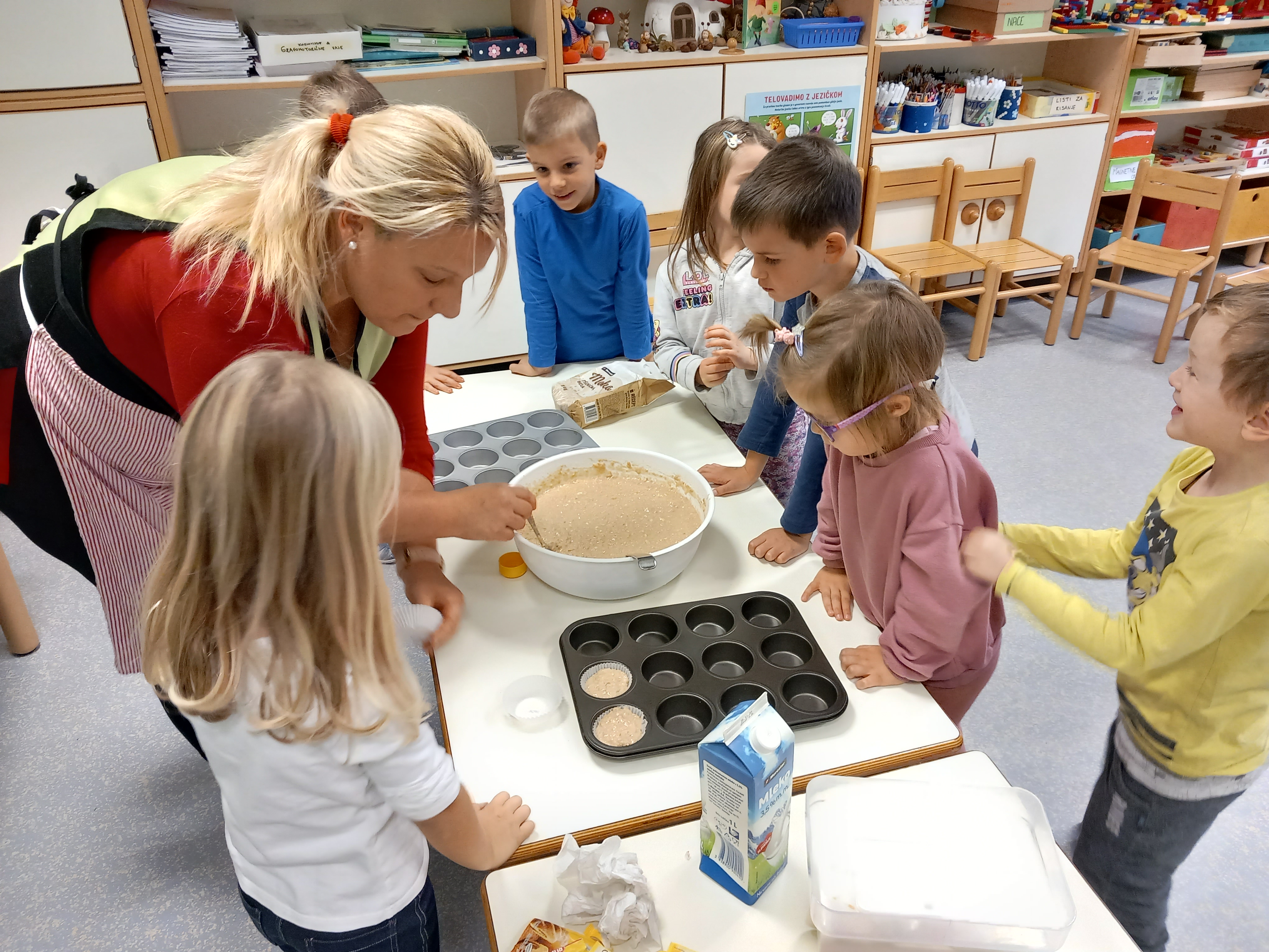 Pri Škratkih je v torek,15.11., zadišalo po domači peki. Spekli smo mafine z jabolki in cimetom. Otroci so pomagali pri pripravi, tehtanju, mešanju sestavin in z maso napolnile modelčke. Otrokom je bila peka v veliko veselje. Najbolj ponosni so bili na svoj mafin, saj so ga odnesli domov za pokušino svojim staršem.