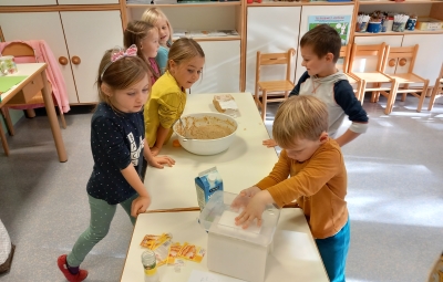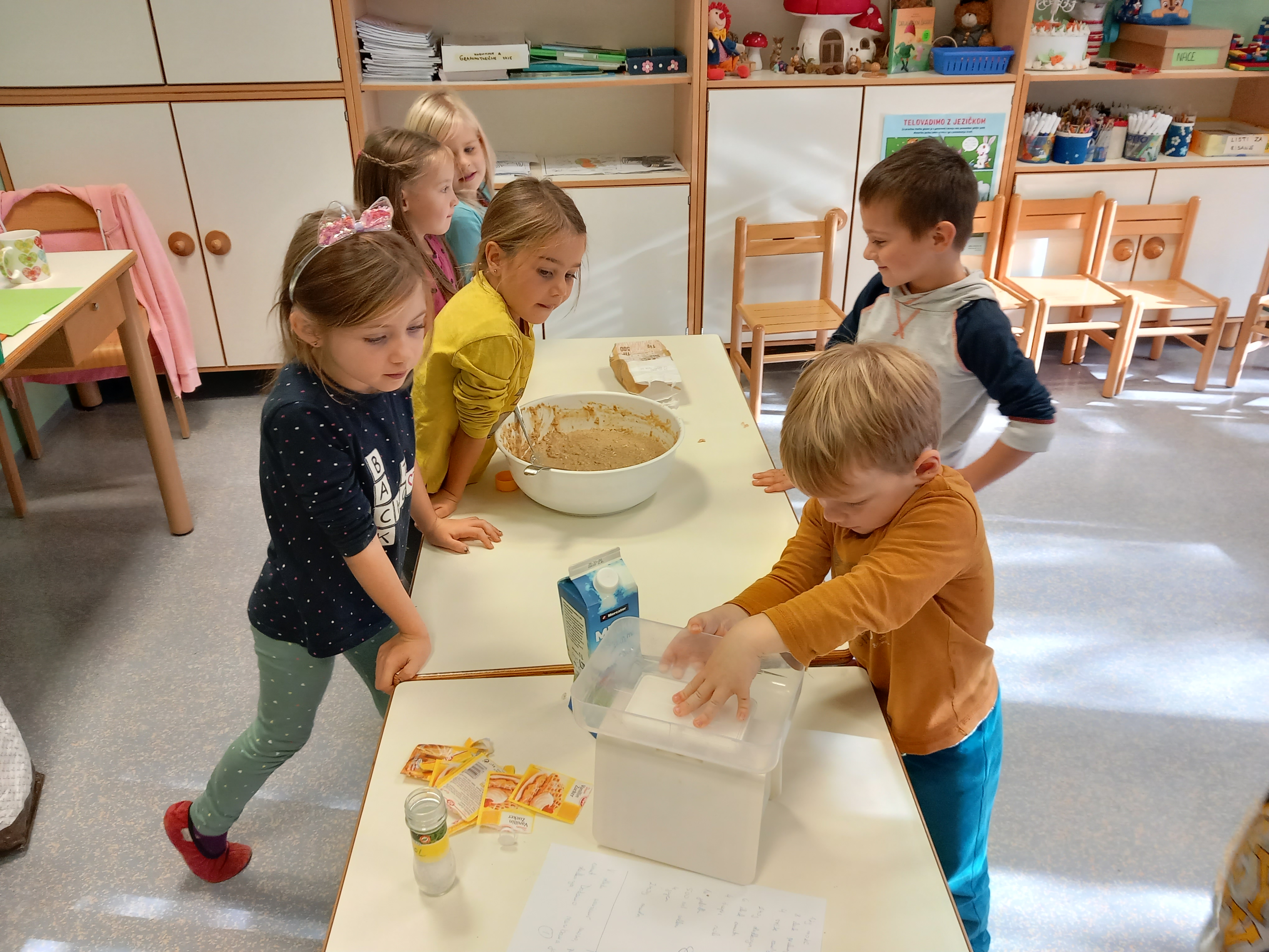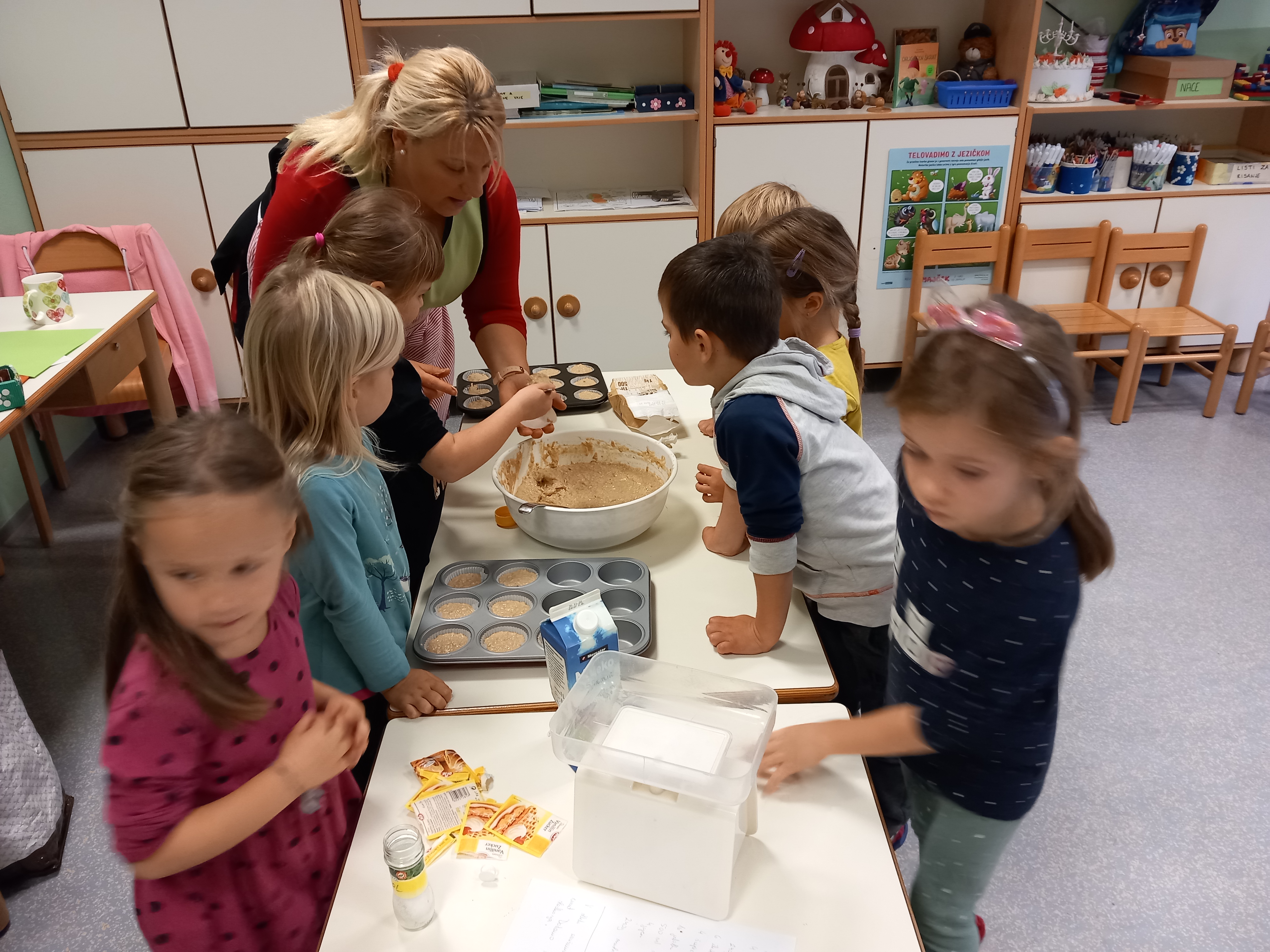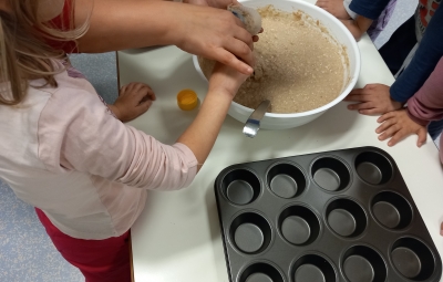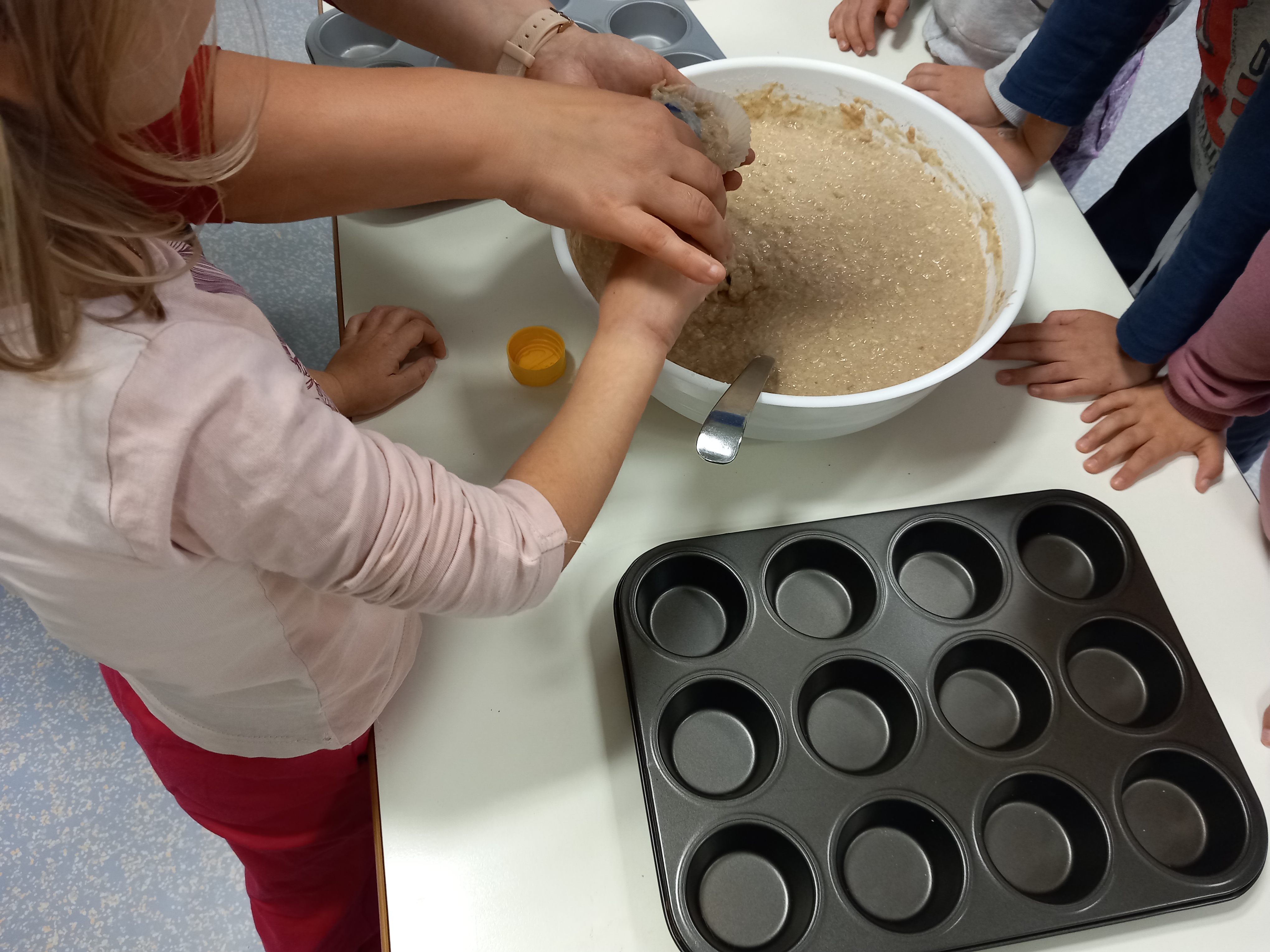 Pri Škratkih je v torek,15.11., zadišalo po domači peki. Spekli smo mafine z jabolki in cimetom. Otroci so pomagali pri pripravi, tehtanju, mešanju sestavin in z maso napolnile modelčke. Otrokom je bila peka v veliko veselje. Najbolj ponosni so bili na svoj mafin, saj so ga odnesli domov za pokušino svojim staršem.