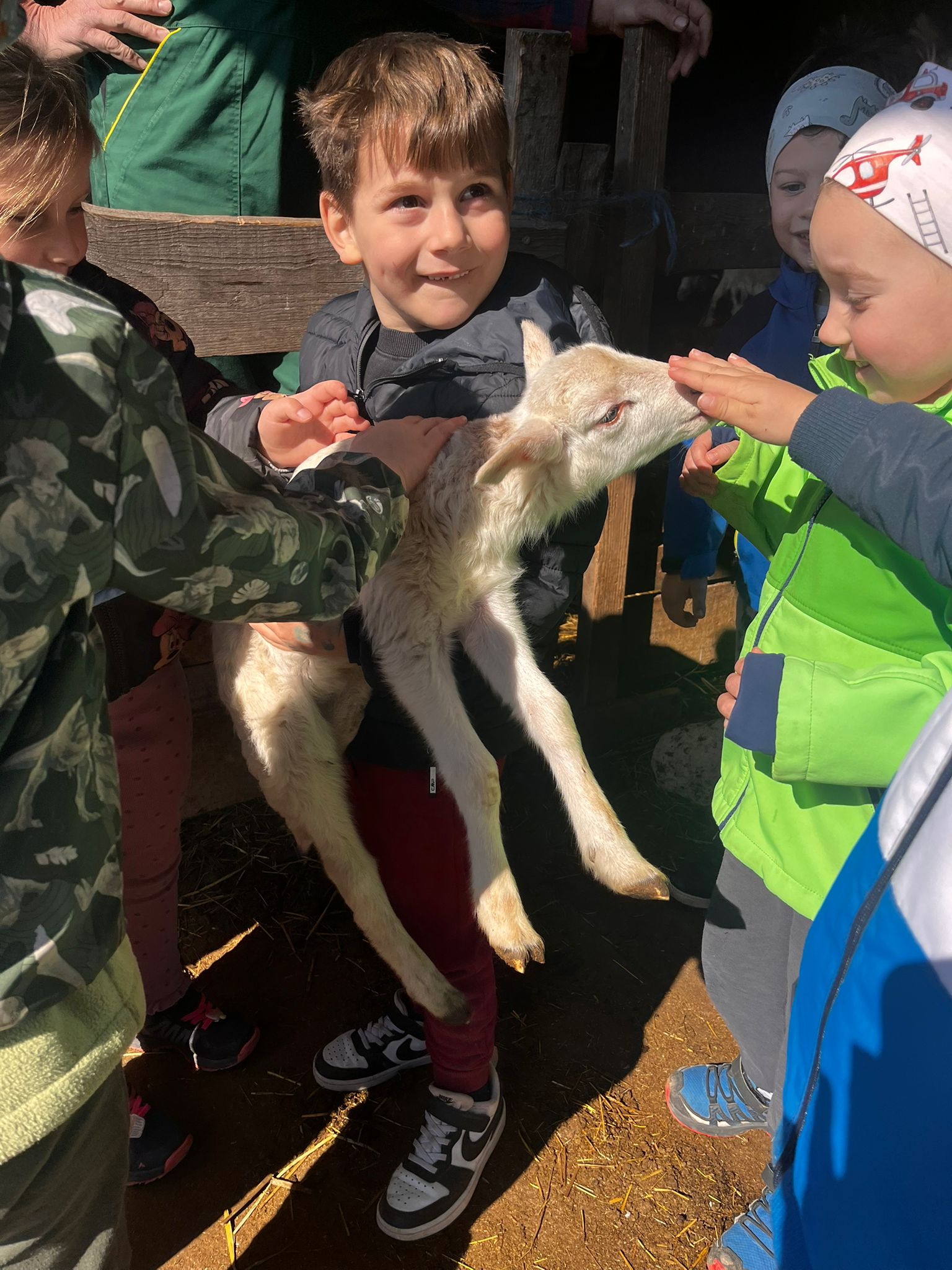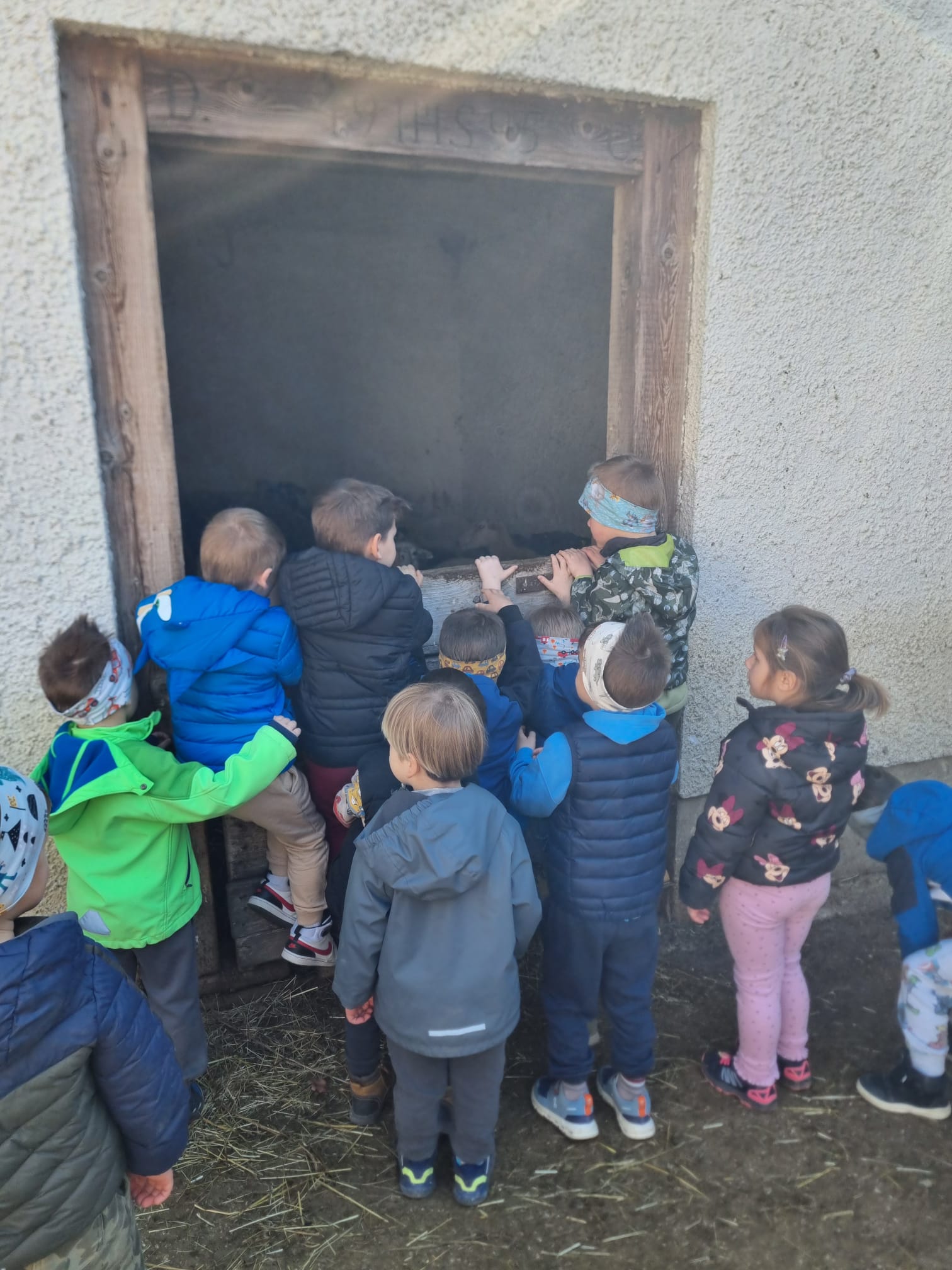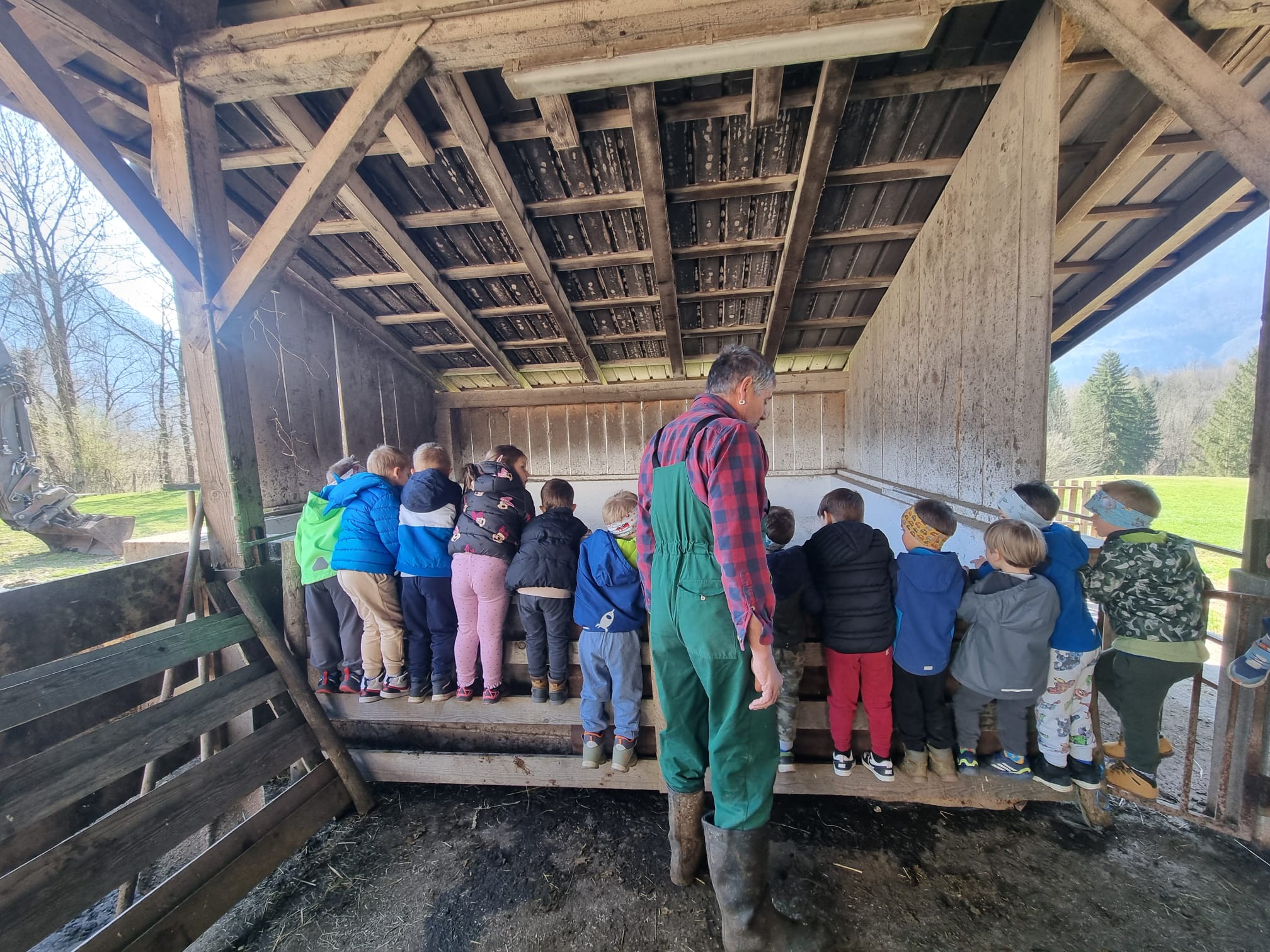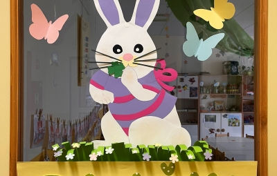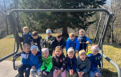 V skupini »Zajčki« smo igralnico spremenili v zelen travnik, odet v cvetlice, posut z metuljčki ter visečim zajčkom na gugalnici, hodnik ter panoje pa obogatili s spomladanskimi rožami, številnimi vrstami ptic ter barvitimi, pisanimi packami, slikami naših poizkusov ob mešanju različnih snovi ter barv. Skozi naša okna odmevajo številne lepe, pomladne melodije, tako od našega ubranega petja, kot od plesa, saj smo zaplesali pravi pomladni ples, s prebujanjem vseh pomladnih rožic. Poskočni koraki pa so nas na topel dan odnesli do Ostanove kmetije v Šijo, da bi presenetili našega "Zajčka" iz skupine. Tu nam je oče našega Danijela Rubna, David Ostan, prijazno pokazal svojo kmetijo. Popeljal nas je od hleva do hleva, nam razkazal vse živali, nam omogočil pristen stik s kokošmi, petelinom, pujsi, ovcami in številnimi jagnjeti, katere smo tudi pestovali ter božali. Kmet David nam je povedal nekaj o kmetovanju in o ovcah, Danijel Ruben pa nas je prijazno povabil v svoj mali raj ter nesebično vsem otrokom posodil svoji gugalnici. Ob razigrani igri na travniku, sadni malici ter zvonjenju pri cerkvici ob lepih željah, smo se ob poslušanju ptičjega petja, brenčanju čebel skozi gozd in čez travnik odpravili nazaj proti vrtcu. Hvala G. Davidu Ostanu za prijazen in prijeten sprejem na kmetiji, kot že vsa ta leta, ko skupaj sodelujemo.