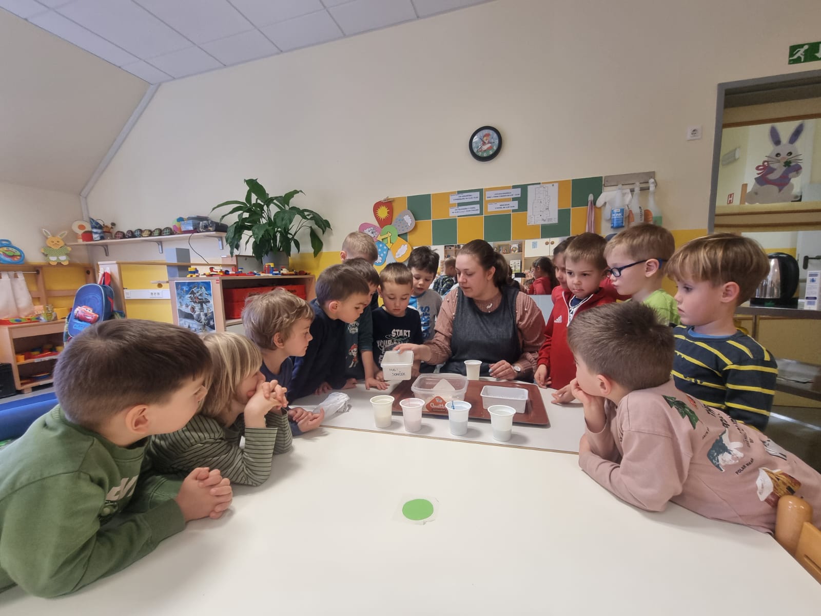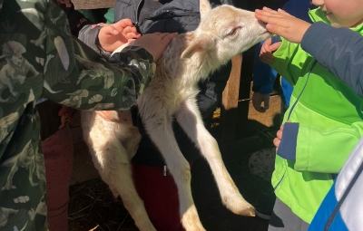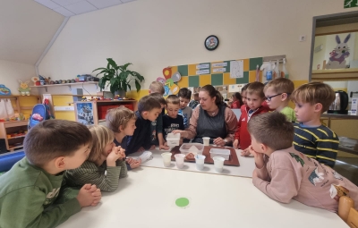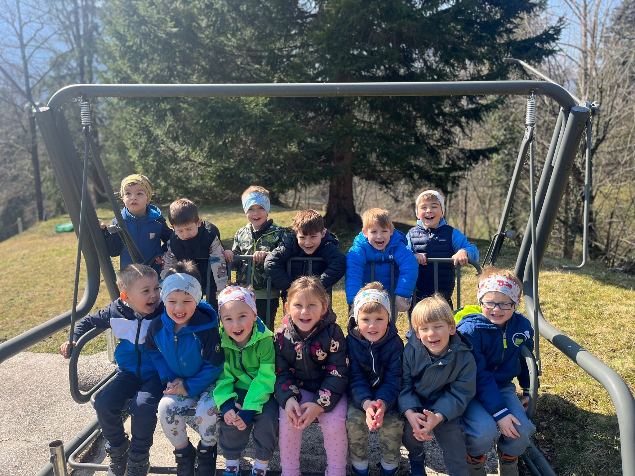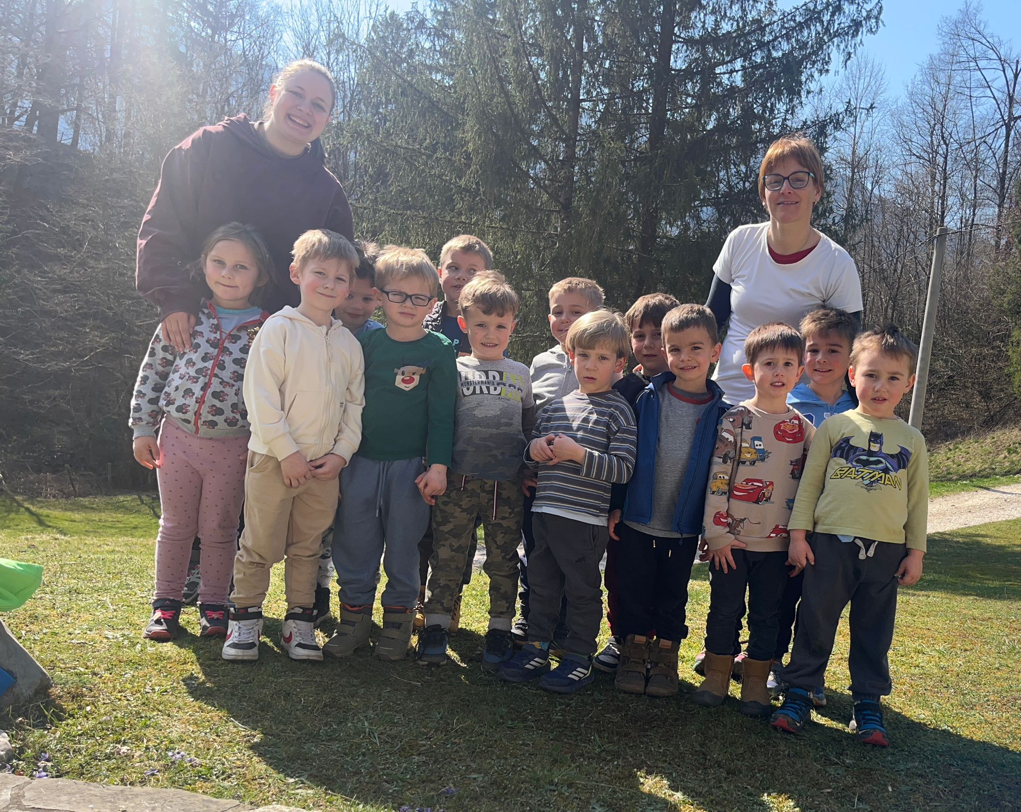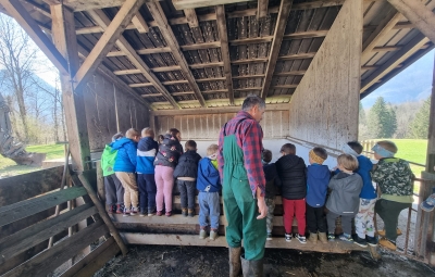 V skupini »Zajčki« smo igralnico spremenili v zelen travnik, odet v cvetlice, posut z metuljčki ter visečim zajčkom na gugalnici, hodnik ter panoje pa obogatili s spomladanskimi rožami, številnimi vrstami ptic ter barvitimi, pisanimi packami, slikami naših poizkusov ob mešanju različnih snovi ter barv. Skozi naša okna odmevajo številne lepe, pomladne melodije, tako od našega ubranega petja, kot od plesa, saj smo zaplesali pravi pomladni ples, s prebujanjem vseh pomladnih rožic. Poskočni koraki pa so nas na topel dan odnesli do Ostanove kmetije v Šijo, da bi presenetili našega "Zajčka" iz skupine. Tu nam je oče našega Danijela Rubna, David Ostan, prijazno pokazal svojo kmetijo. Popeljal nas je od hleva do hleva, nam razkazal vse živali, nam omogočil pristen stik s kokošmi, petelinom, pujsi, ovcami in številnimi jagnjeti, katere smo tudi pestovali ter božali. Kmet David nam je povedal nekaj o kmetovanju in o ovcah, Danijel Ruben pa nas je prijazno povabil v svoj mali raj ter nesebično vsem otrokom posodil svoji gugalnici. Ob razigrani igri na travniku, sadni malici ter zvonjenju pri cerkvici ob lepih željah, smo se ob poslušanju ptičjega petja, brenčanju čebel skozi gozd in čez travnik odpravili nazaj proti vrtcu. Hvala G. Davidu Ostanu za prijazen in prijeten sprejem na kmetiji, kot že vsa ta leta, ko skupaj sodelujemo.