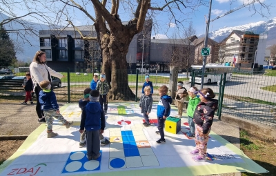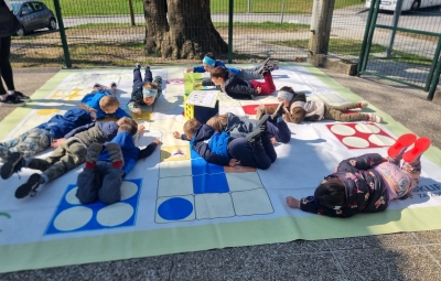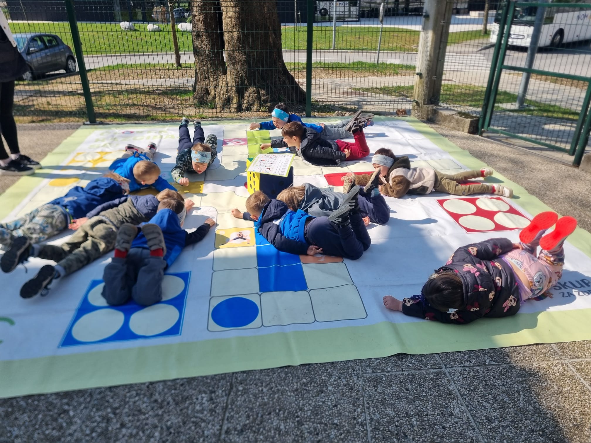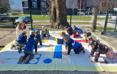 Lepo vreme smo izkoristili tudi za preizkus talne igre »Človek, razgibaj se«, ki so nam jo poslali v preizkus iz NJIZ-ja, saj smo včlanjeni v projekt Zdravje v vrtcu. Igrali smo se jo pred vrtcem, na asfaltni površini in se dobro natelovadili.