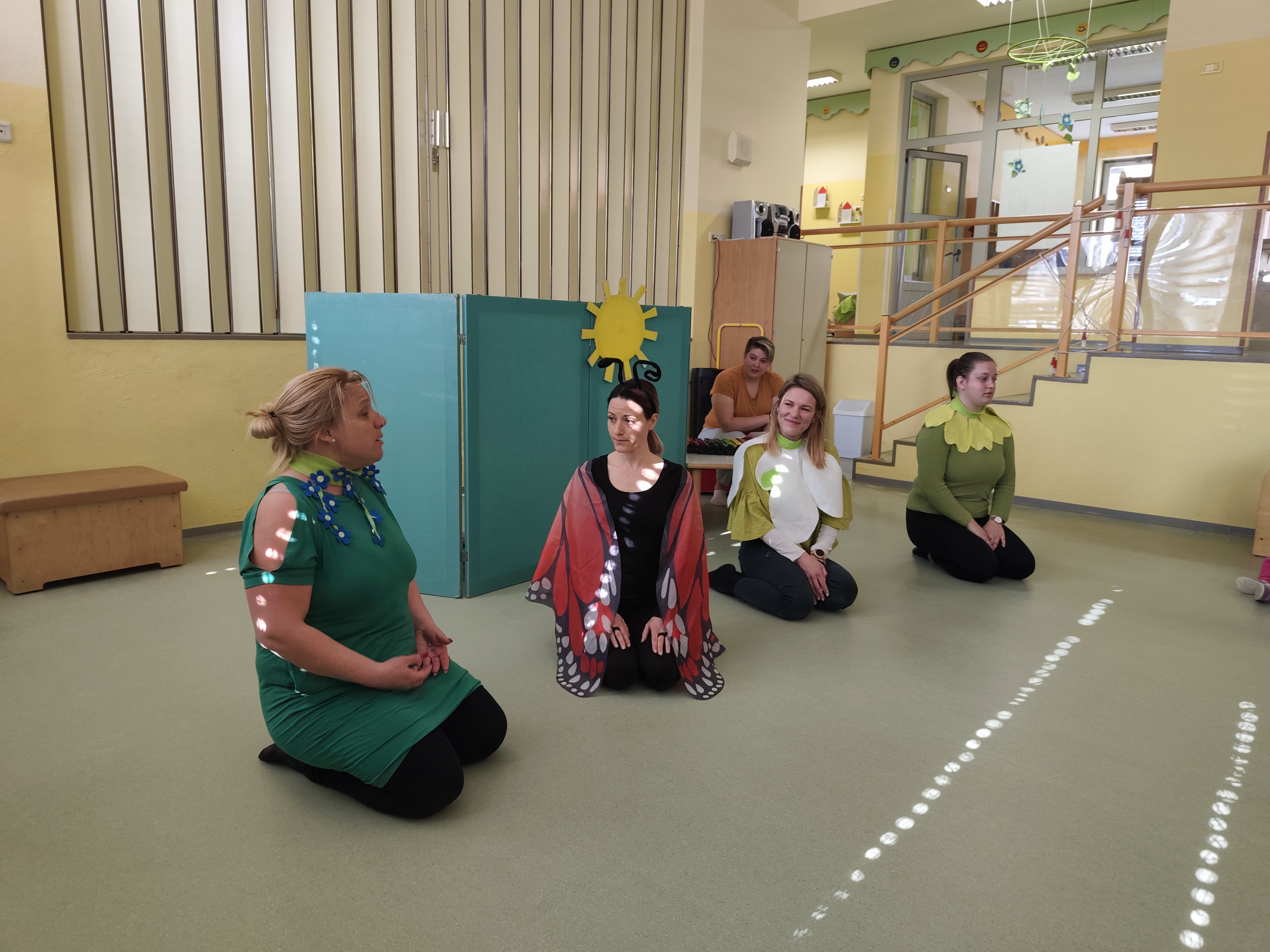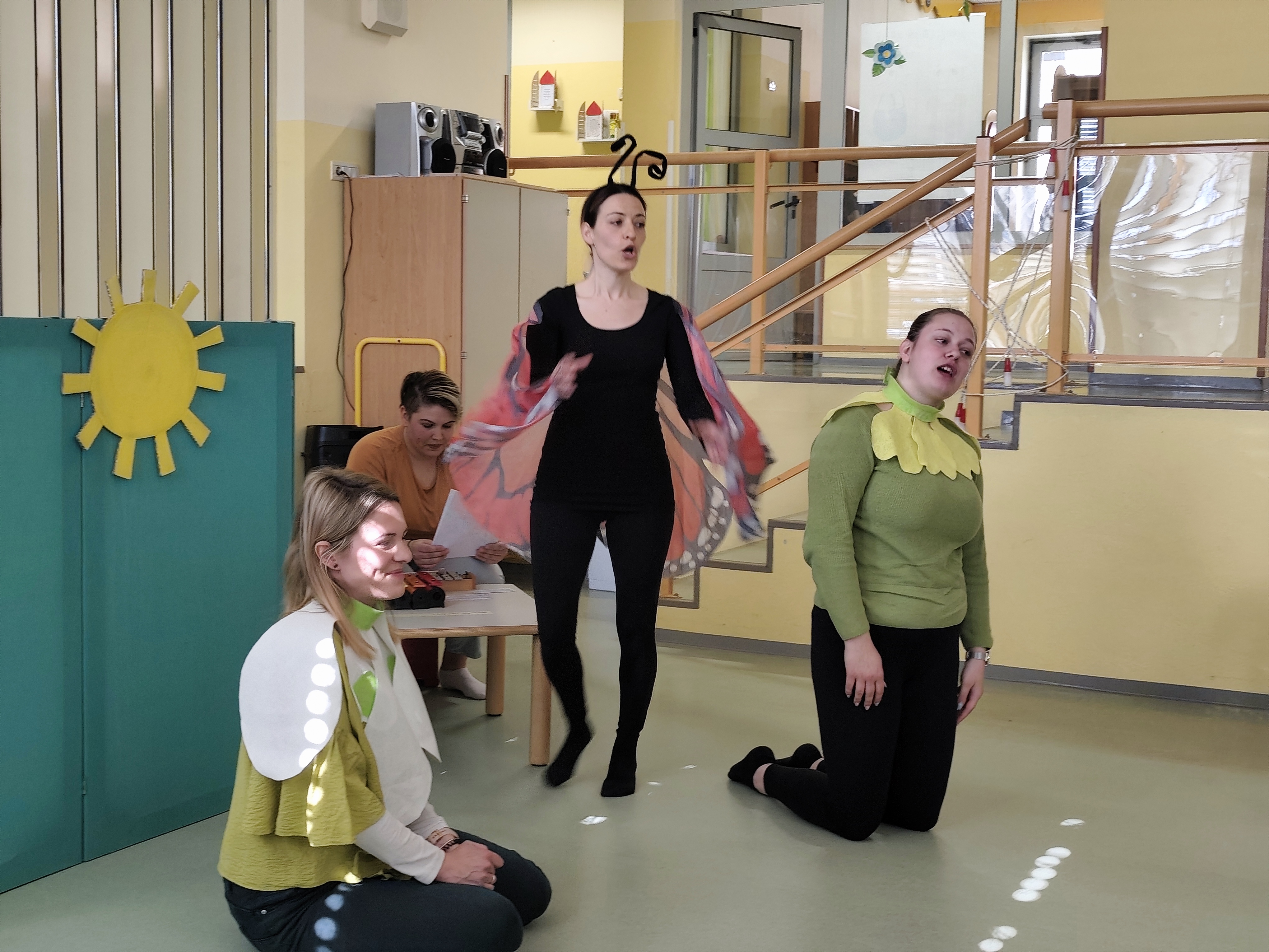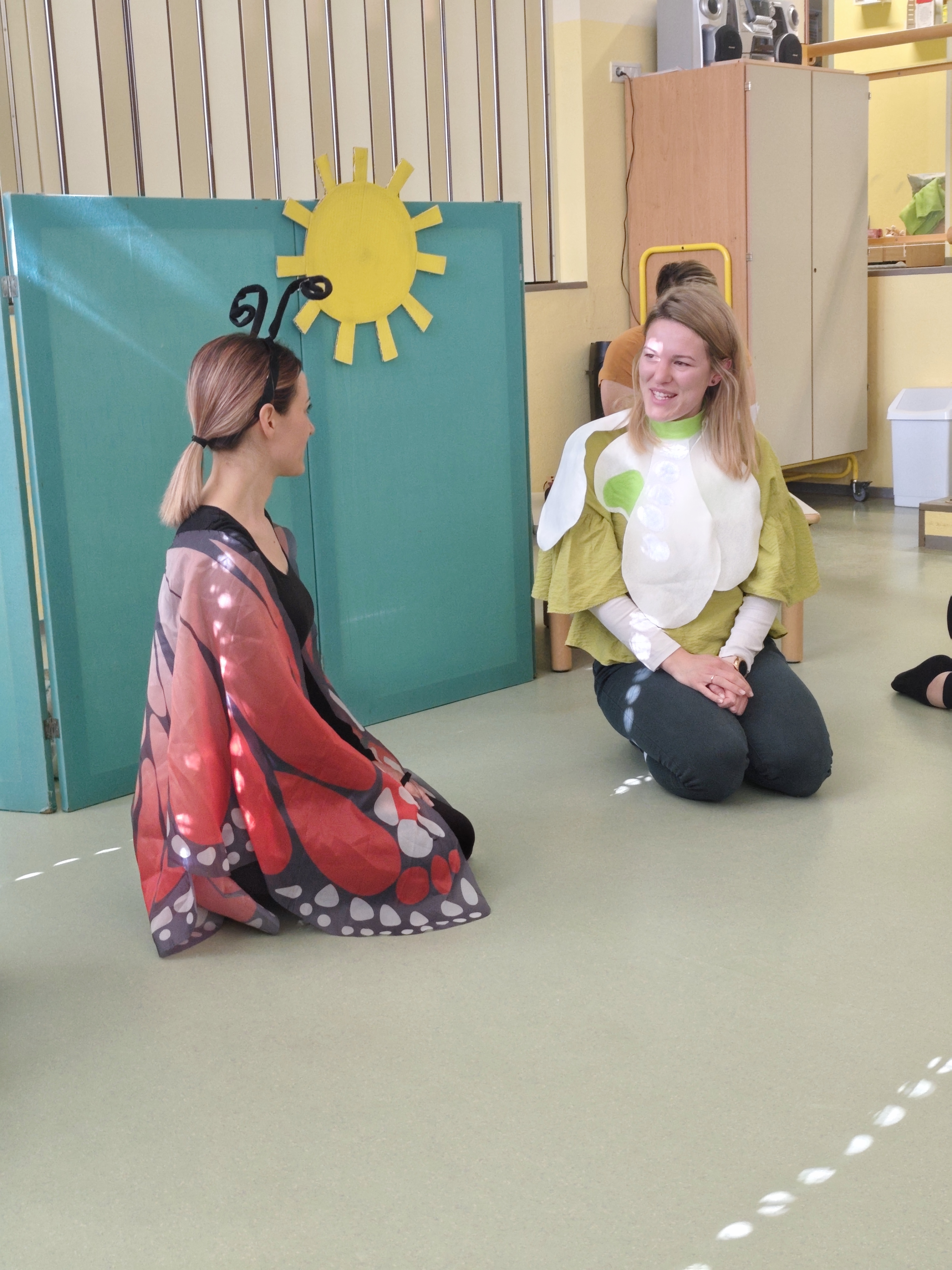 Na prvi pomladni dan je v vrtcu zavladalo prav posebno vzdušje, saj so vzgojiteljice za otroke pripravile spomladansko obarvano gledališko predstavo z naslovom Metuljček išče pomlad. Ko so se otroci vrtca zbrali, so v prijetno okrašenem prostoru, vzgojiteljice stopile v vloge pravljičnih likov ter otroke popeljale v zgodbo o zaspanem travniku, ki ga je po dolgi zimi prebudil nežni metulj. S svojim lahkotnim plesom je najprej zbudil zvonček, ki je sramežljivo pokukal iz zemlje, nato še trobentico, ki je pogumno razprla svoje rumene cvetove, in nazadnje še nežno spominčico, ki je travnik obarvala v modro. Otroci so z navdušenjem spremljali dogajanje, prisluhnili zgodbi o metulju, ter vsaki odpeti pesmi. Vsem otrokom je metulj še dodatno pričaral nasmeh na obraz, ko je poletel med njih in jih pobožal z nežnimi krili. Ob koncu smo še skupaj zapeli in tako obeležili prvi pomladni dan, v duhu ustvarjalnosti, igre in povezanosti z naravo.