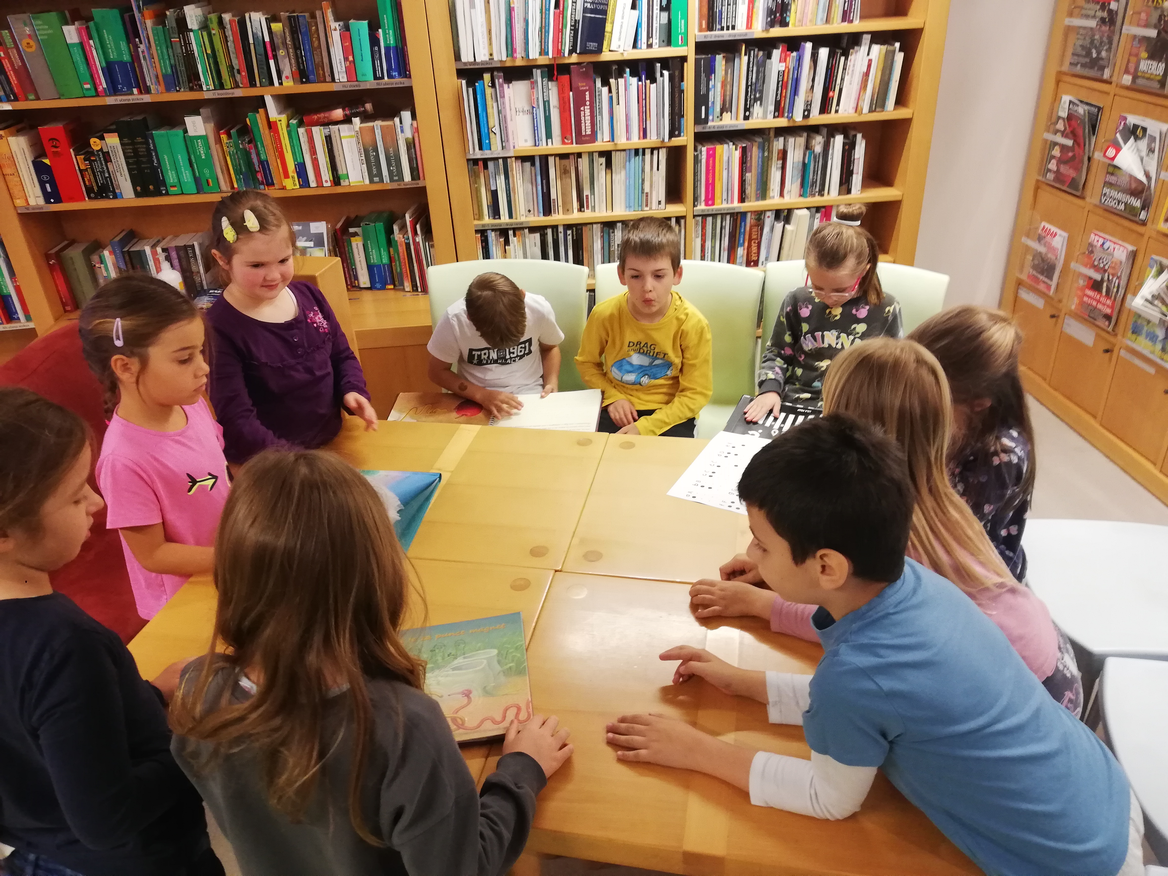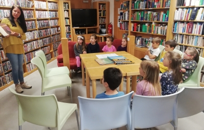 Knjižničarka Danjela nas je prijazno povabila v knjižnico, kjer nam je pokazala knjige v znakovnem jeziku ter Braillovi pisavi. Ena takih knjig je tudi zgodba Žiga Špageti gre v širni svet. Povedala nam je tudi, kako delujejo zvočne knjige. Otroci so z zanimanjem poslušali in tipali gradivo. Trudili smo se pokazati svoje ime v znakovnem jeziku ter se naučili še nekaj gest.