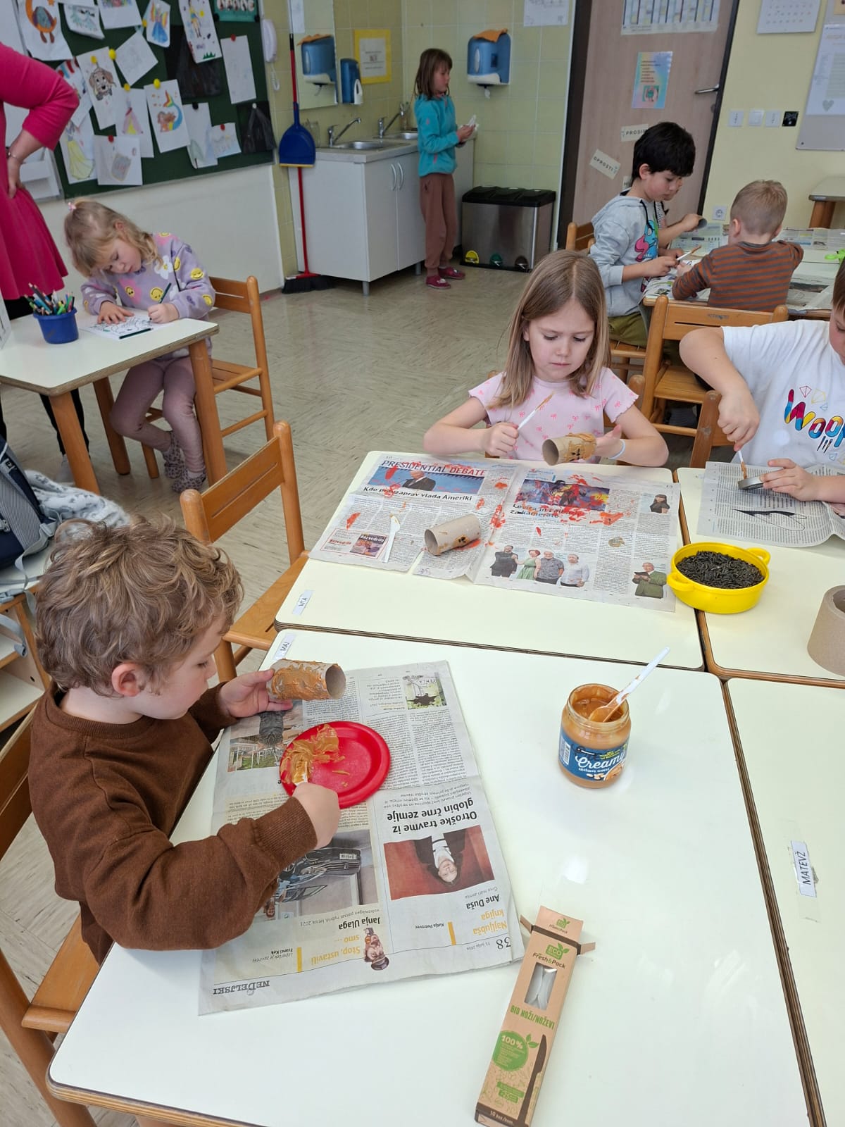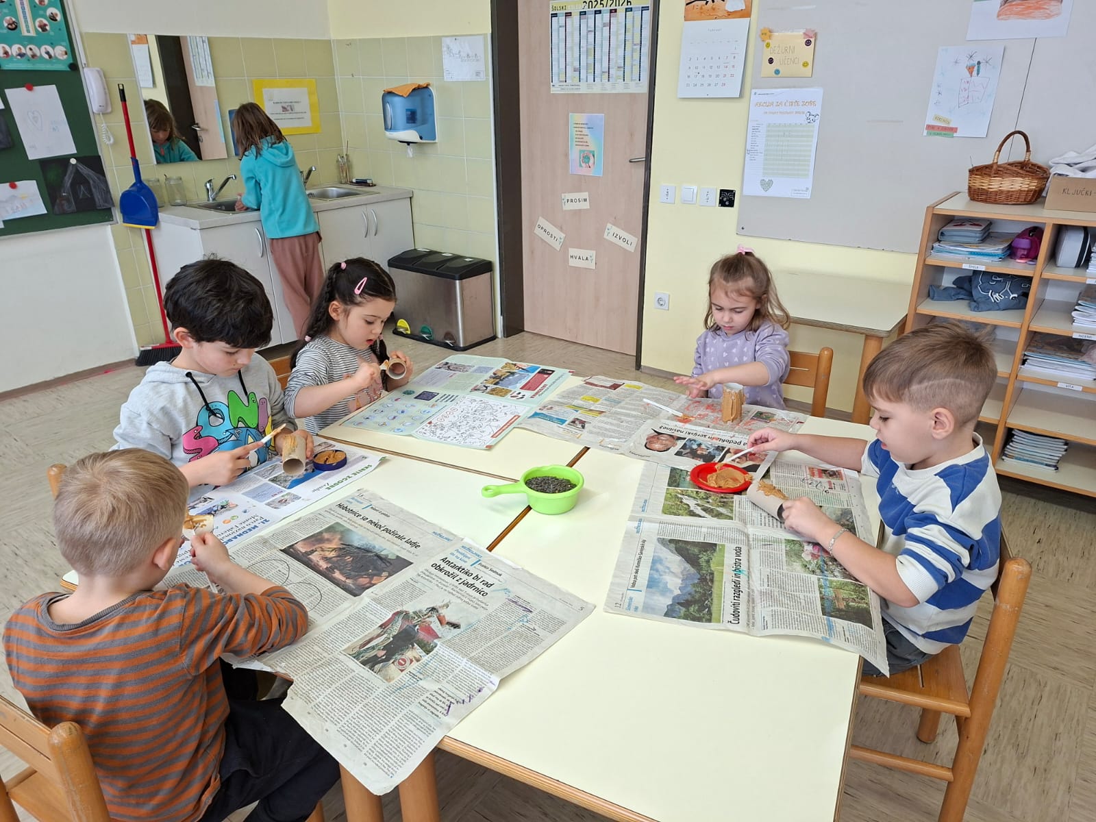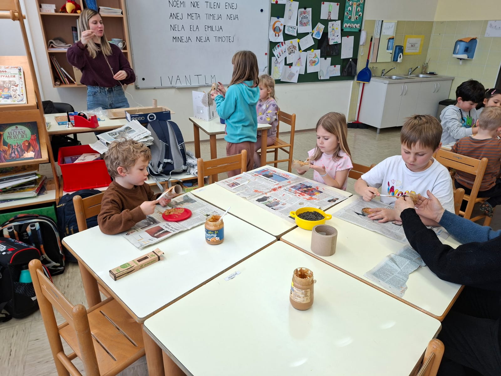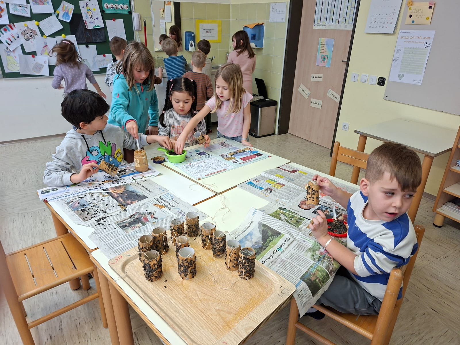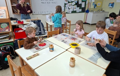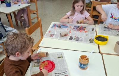 V torek, 10.2.2026, smo se odpravili na obisk v 1. razred. Komaj smo čakali, da pokukamo v razred, v učilnico, kjer imajo učenci pouk, da spoznamo učence in učiteljice. Zelo prijazno so nas sprejeli. Povabili so nas ,da se usedemo skupaj z učenci na tla in naredimo lep krog. Učiteljica Polona nam je prebrala pravljico o dečku, ki je imel rad ptičke. Z zanimanjem smo jo poslušali.Ob pravljici smo se še veliko pogovarjali. Nato nam je učiteljica Tanja pokazala in povedala, kaj bomo počeli, mi pa smo poimenovali stvari, ki jih bomo potrebovali za ustvarjanje- tulec od papirja, semena, nož, vrvico... izdelovali smo potičke za ptičke. Otroci so se posedli v manjše skupine okrog miz, kjer je vsak izdelal svojo potičko.