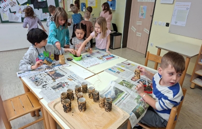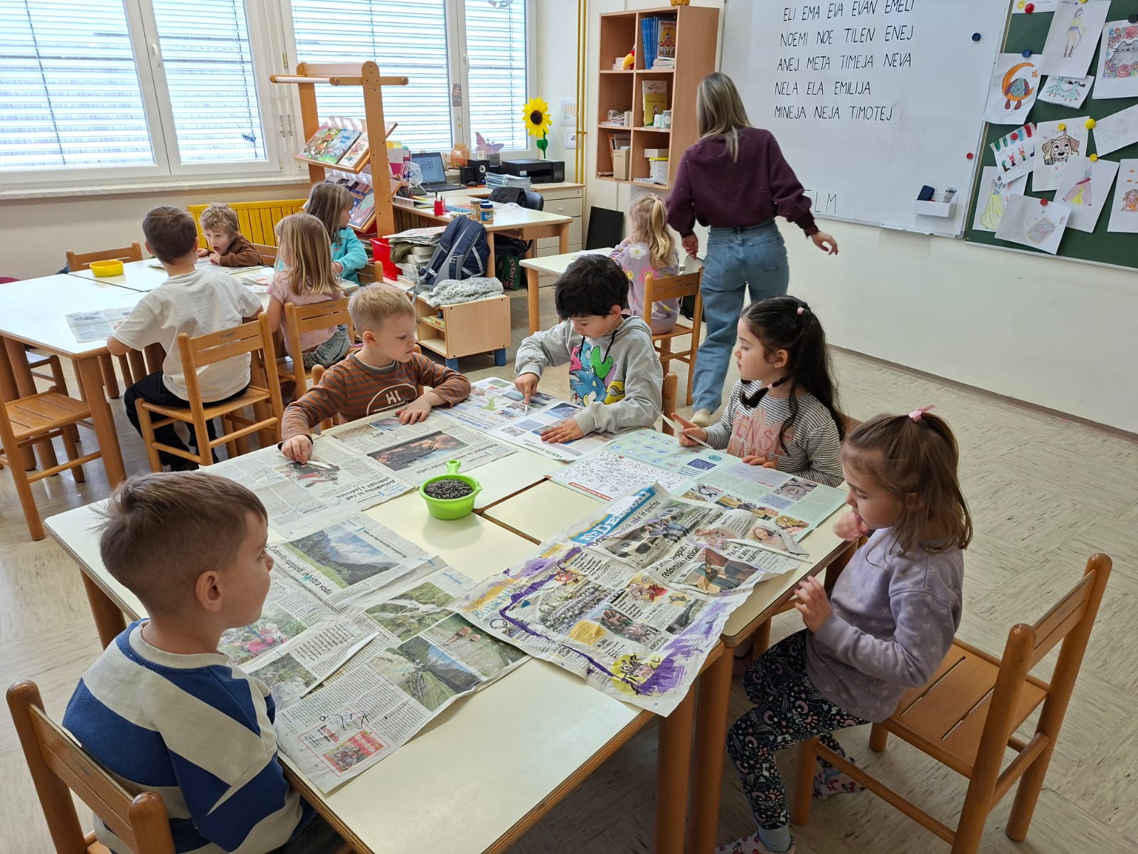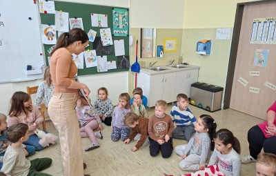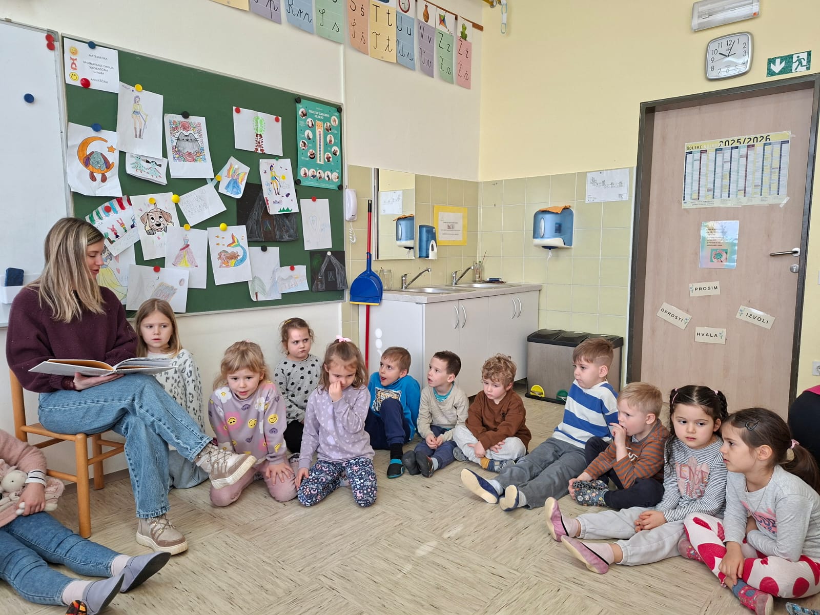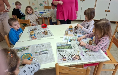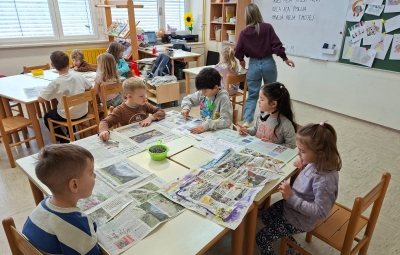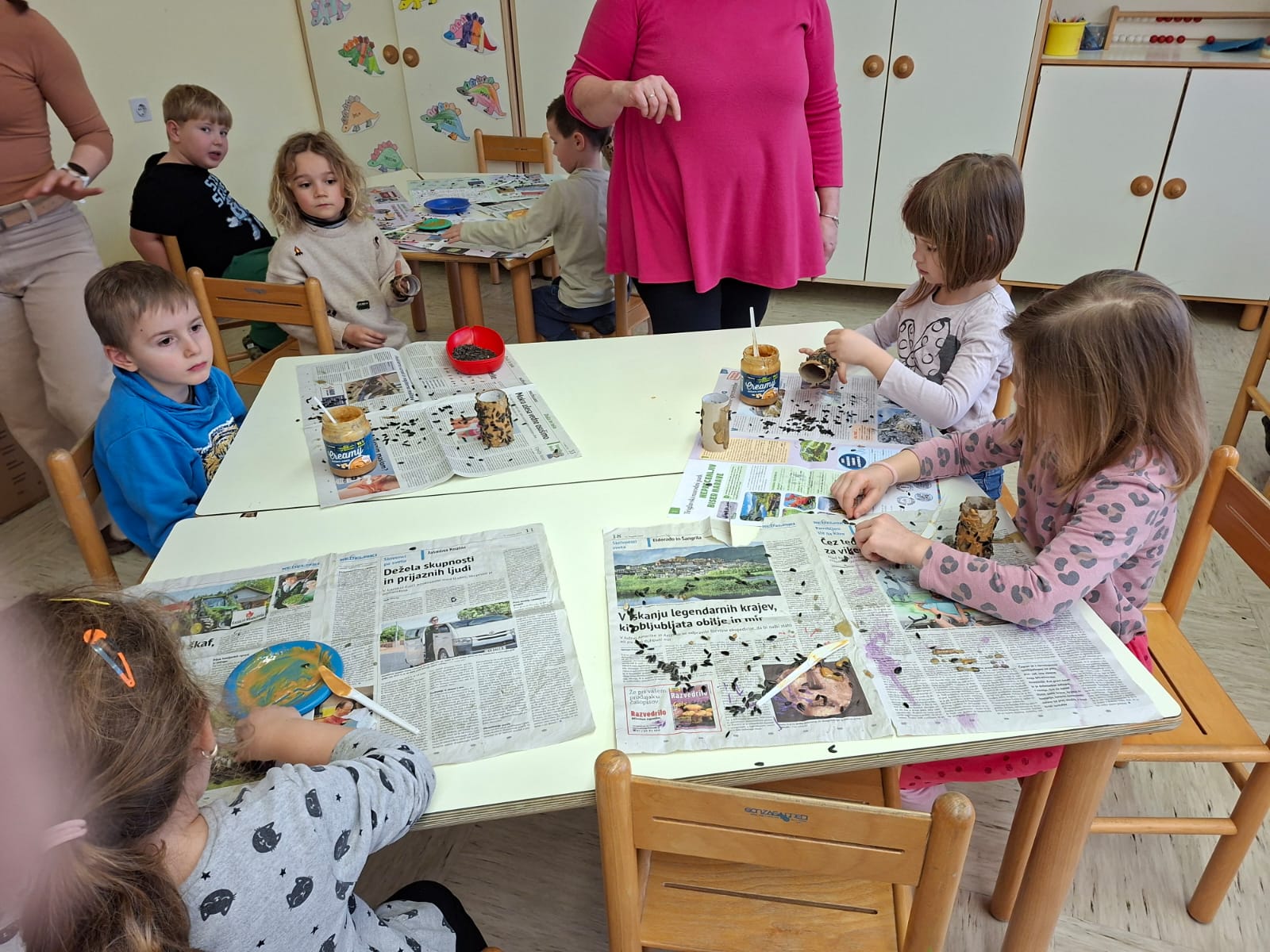 V torek, 10.2.2026, smo se odpravili na obisk v 1. razred. Komaj smo čakali, da pokukamo v razred, v učilnico, kjer imajo učenci pouk, da spoznamo učence in učiteljice. Zelo prijazno so nas sprejeli. Povabili so nas ,da se usedemo skupaj z učenci na tla in naredimo lep krog. Učiteljica Polona nam je prebrala pravljico o dečku, ki je imel rad ptičke. Z zanimanjem smo jo poslušali.Ob pravljici smo se še veliko pogovarjali. Nato nam je učiteljica Tanja pokazala in povedala, kaj bomo počeli, mi pa smo poimenovali stvari, ki jih bomo potrebovali za ustvarjanje- tulec od papirja, semena, nož, vrvico... izdelovali smo potičke za ptičke. Otroci so se posedli v manjše skupine okrog miz, kjer je vsak izdelal svojo potičko.
