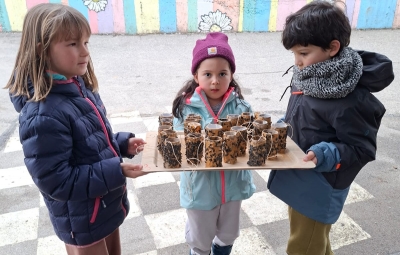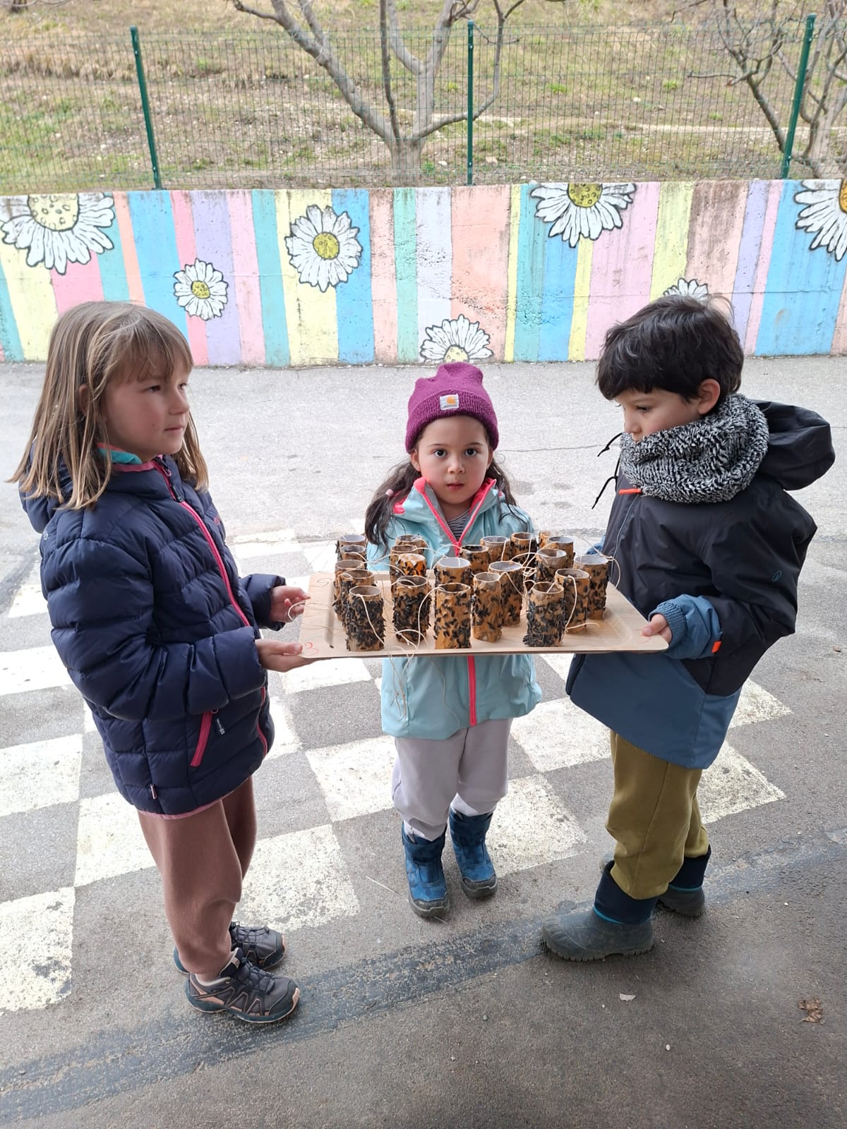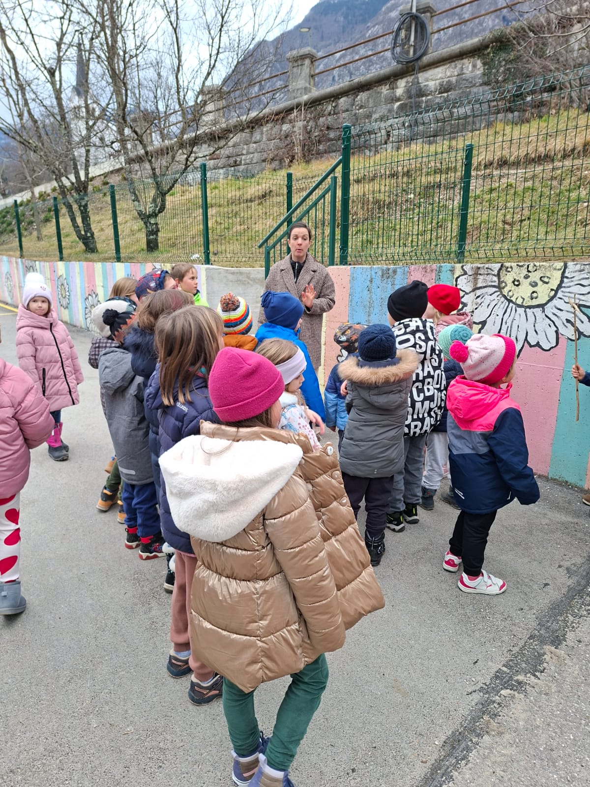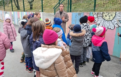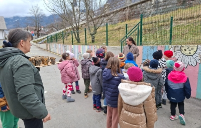 Oblekli in obuli smo se in odnesli potičke za ptičke na bližnja drevesa v bližino šole in jih obesili. Skupaj s šolarji smo se na igrišču za šolo še malo poigrali, tekli, se zabavali in pogovarjali. Nato smo se morali odpraviti počasi proti našemu vrtcu. Bilo je zelo lepo, prijazno, srčno, gostoljubno druženje s strani otrok in učiteljic. Ostalo nam bo v zelo lepem spominu. Hvala vsem otrokom in učiteljicam, da ste si vzeli čas za nas.