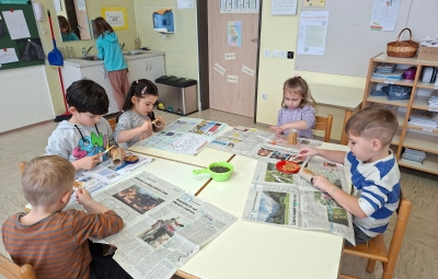 Po ustvarjanju smo se z učiteljico Tanjo naučili tudi novo pesmico o kukavici, pesmico smo tudi gibalno uprizorili. Zelo nam je bila všeč. Mi, " Ptički " pa smo šolarjem zapeli Žabjo svatbo.