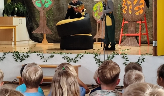 V ponedeljek, 16. 6. 2025, smo z gledališko skupino gostovali na OŠ Simona Gregorčiča Kobarid. Otrokom iz vrtca in učencem 1.-4. razreda smo zaigrali Nenavadno poroko.