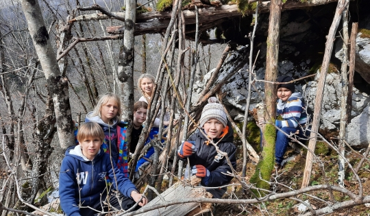Gozdna pedagogika-ustvarjalnost in kreativnost pri izdelavi gozdne hišice iz naravnih materialov.