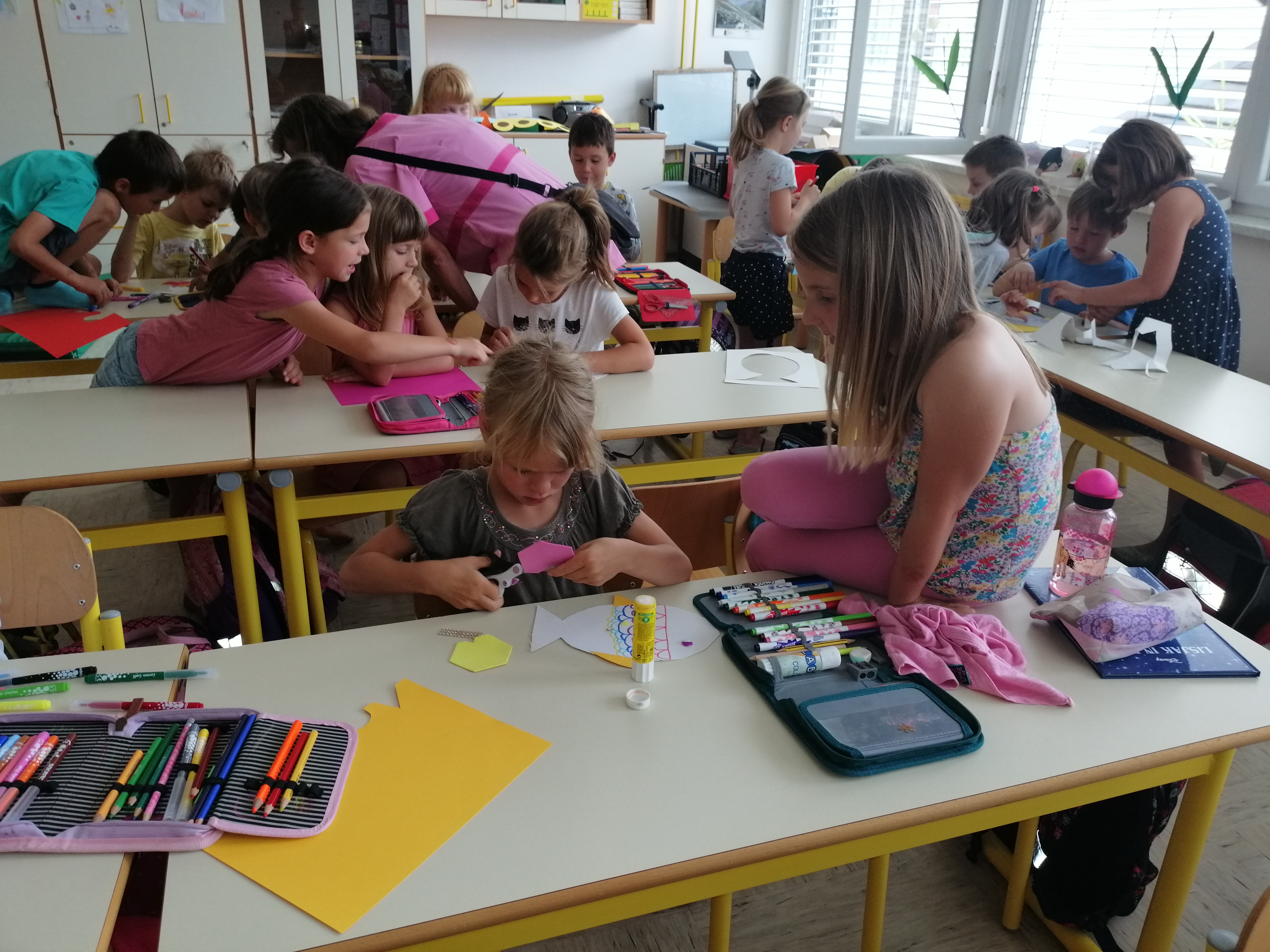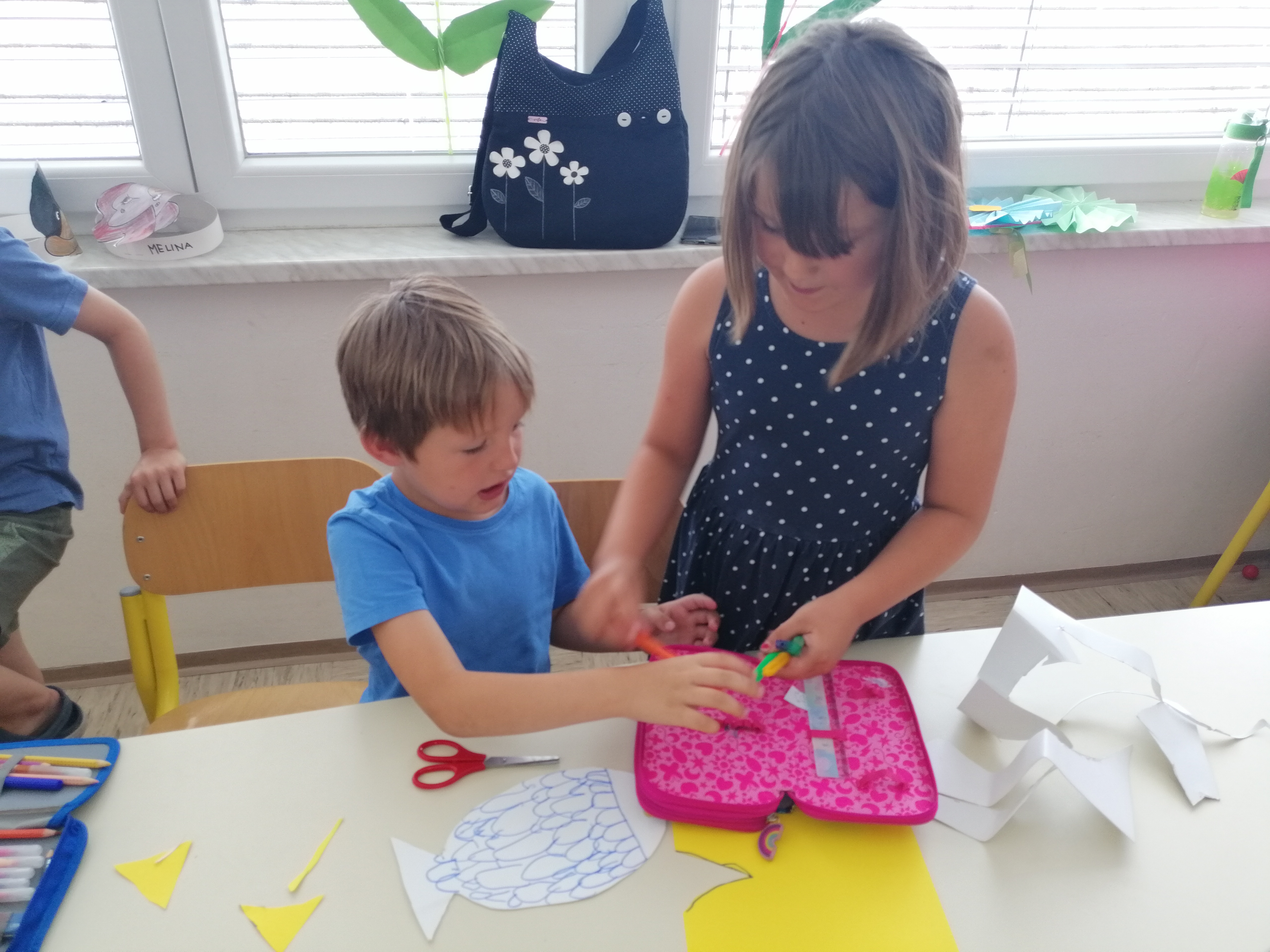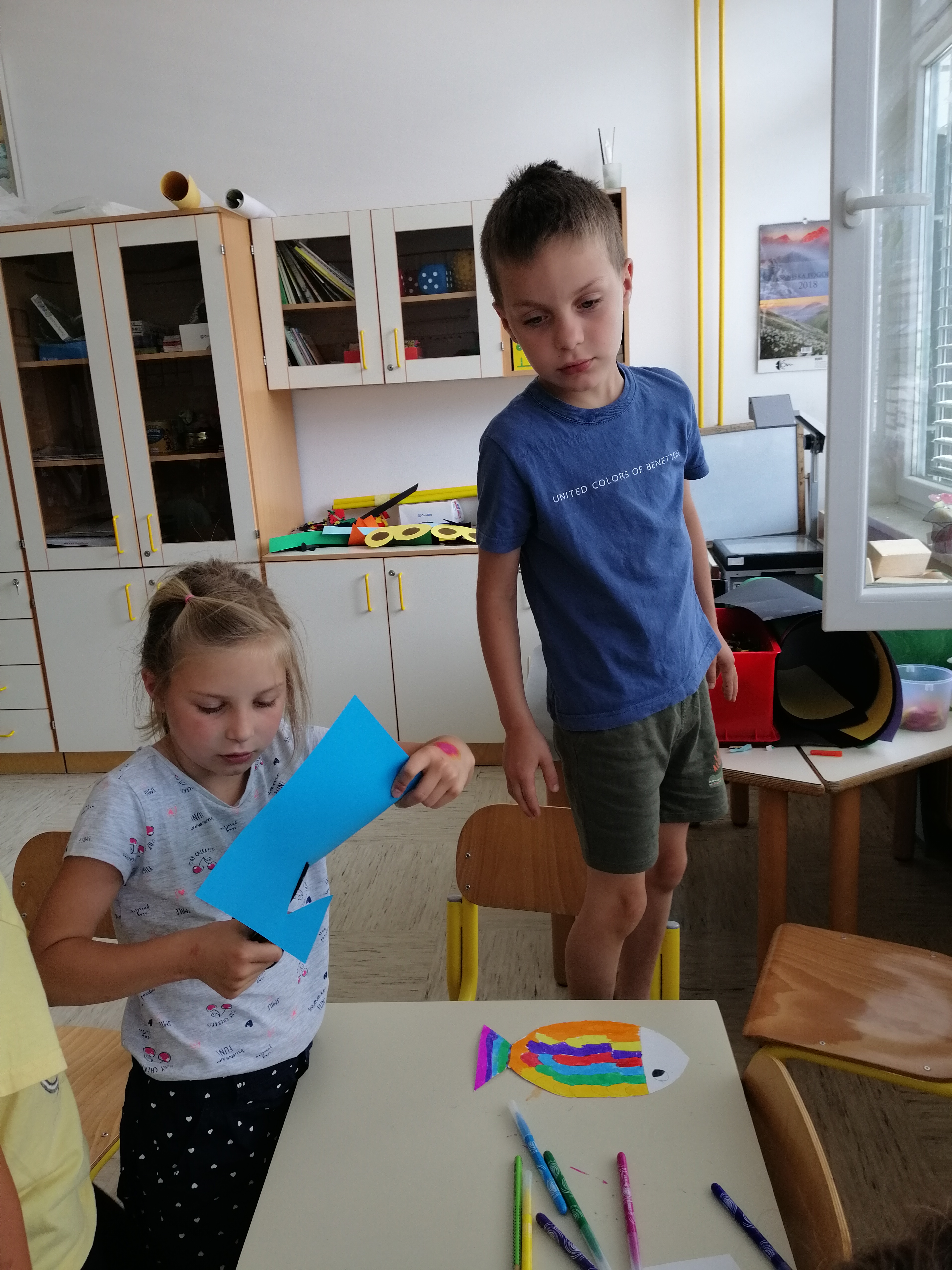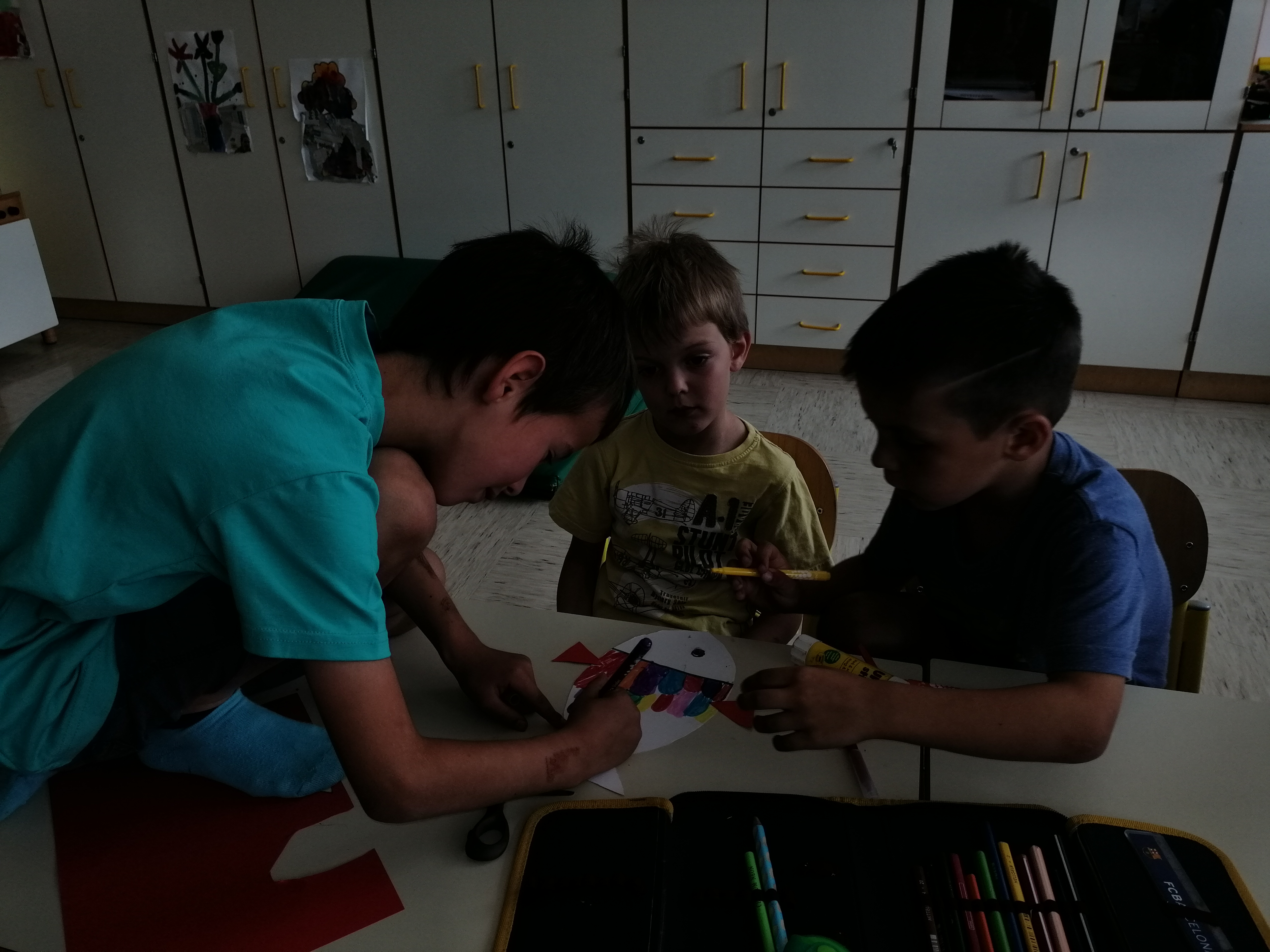 Danes, v sredo, 19. 6. so nas v 1. A obiskali otroci iz vrtca, iz skupine škratki. Pokazali smo jim, kaj smo letos počeli, kaj smo se novega naučili. Skupaj smo prebrali pravljico Reševanje malega Nema in izdelali ribice. Vsak škratek je imel ob sebi za pomoč dva naša učenca. Bilo je zanimivo in zabavno. Upamo, da smo jim prikazali kanček dobrega vzdušja v šoli, da bodo v jeseni z veseljem zakorakali v 1. razred.