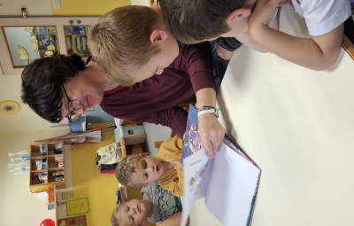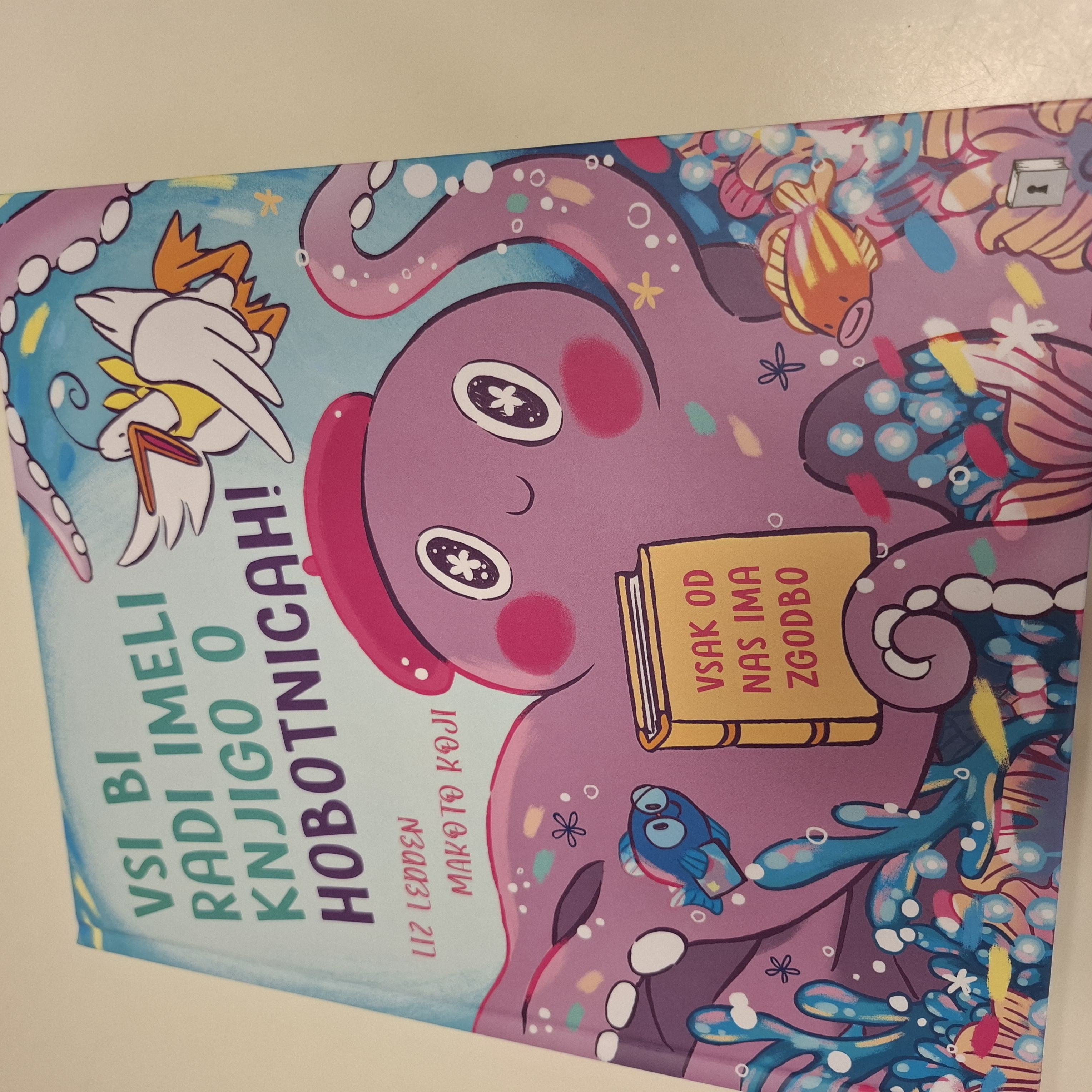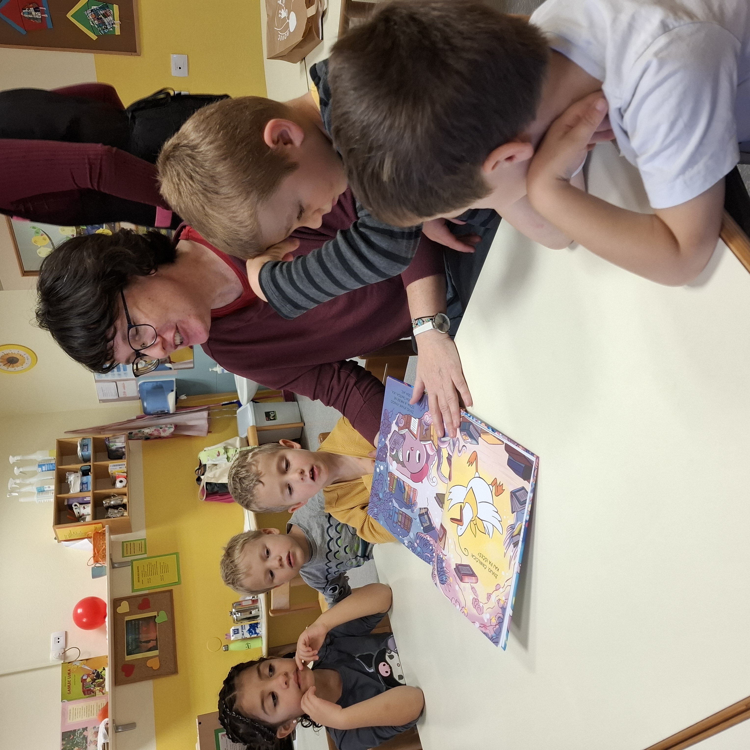 Včeraj, v sredo nas je obiskala šolska knjižničarka Urška. Pogovarjali smo se o knjigah, kako ravnamo s knjigami, kaj počnemo v knjižnici, katere knjižnice obiskujemo. Spoznali smo, kako je knjiga napisana in kdo piše pravljice in kdo pesmice. Prebrala nam je lepo pravljico o hobotnici, ki je spoznala prijateljico račko. Skozi pravljico smo lahko ugotovili, kako pomembno je, da imamo prijatelje. Pravljico smo z zanimanjem poslušali in občudovali prelepe ilustracije. Knjižničarka nam je prinesla tudi pobarvanke z različnimi hobotnica, velikimi, majhnimi, veselimi in prijaznimi. Pobarvali smo vsak svojo hobotnico.