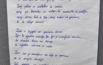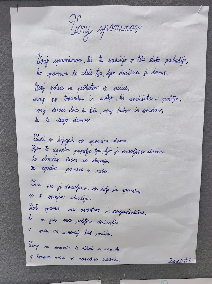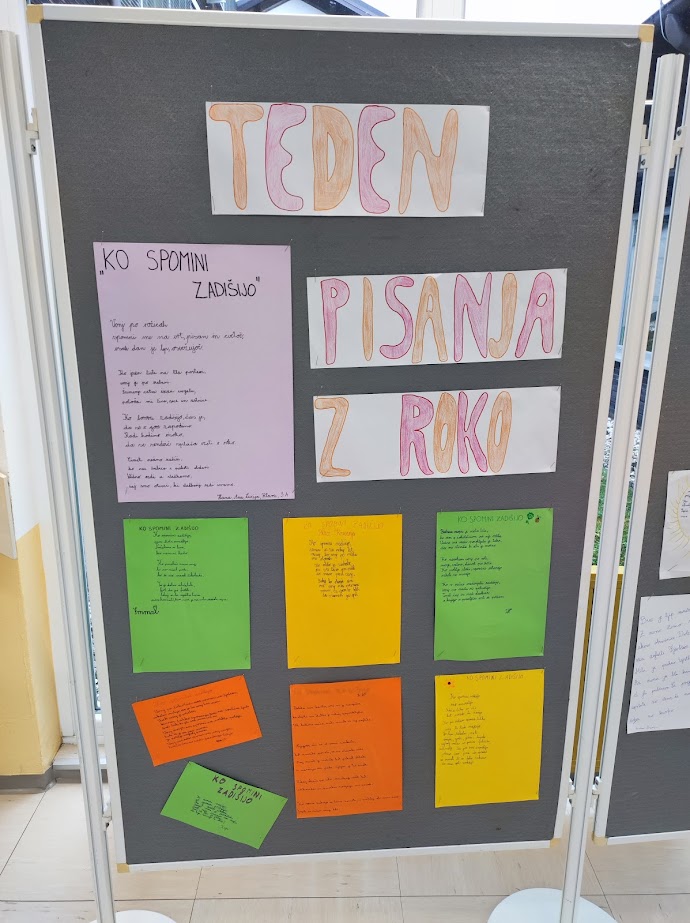 Teden pisanja z roko je letos potekal med 20. in 24. januarjem 2025. Društvo Radi pišemo z roko s projektom spodbuja pomen pisanja z roko, ki se z leti, sploh pri odraslih, izgublja. Letošnja tema je bila Ko spomini zadišijo. Vonj je tisto čutilo, ki najhitreje in najintenzivneje v nas prebudi še tako zakoreninjene spomine. Učenci so napisali pesmi, utrinke, kratke zgodbe o tem, kako jim določen vonj obudi spomine na ljube osebe in lepe trenutke. Nastali so krasni literarni izdelki, ki jih lahko preberete v preddverju šole, kjer smo jih razstavili. Nekateri so jih zapisali tudi v »buščini« in obenem ne samo opozorili na pomen pisanja z roko, ampak tudi na pomen ohranjanja narečja.