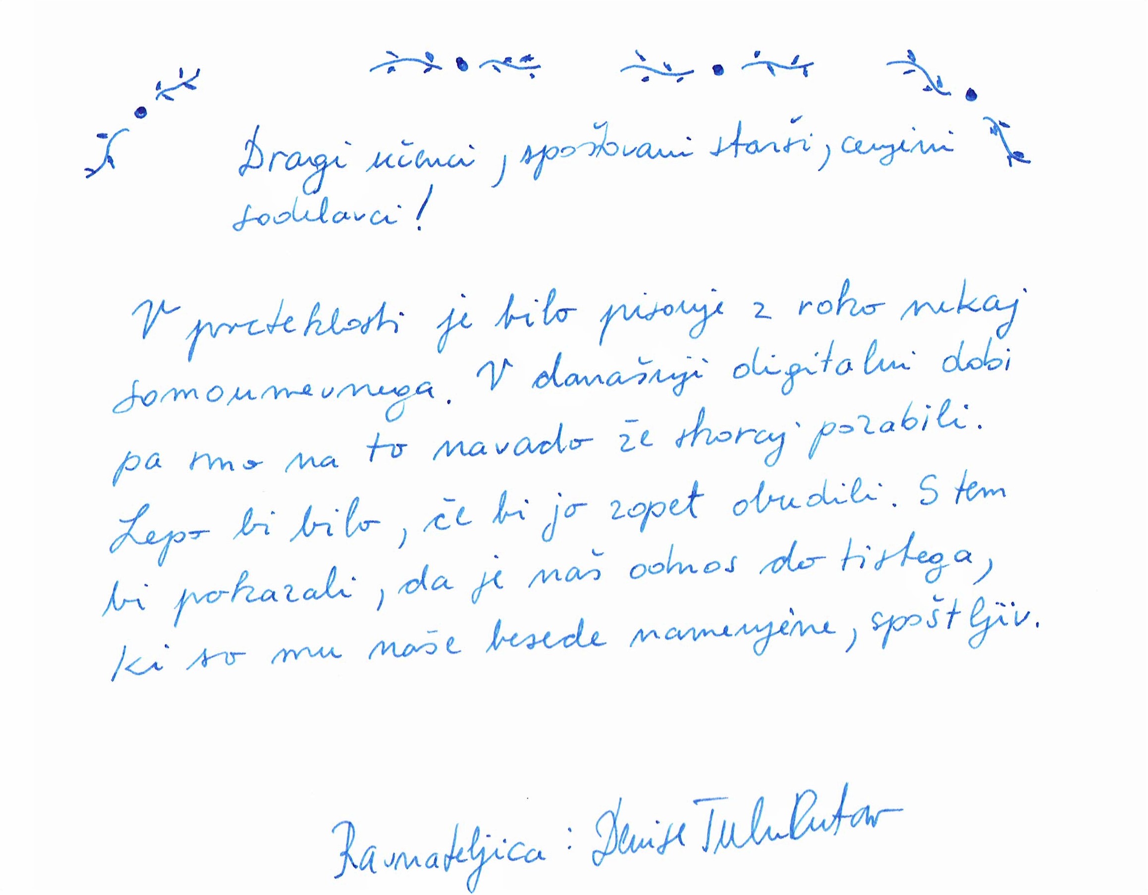 Za sodelovanje v tej akciji smo se odločili, ker želimo spodbujati zavedanje, da ima pisanje z roko precej prednosti. Naj jih nekaj naštejemo: boljši spomin, ustvarjanje več idej, dolgotrajnejša pozornost, celovitejše delovanje možganov, izražanje spoštovanja in naklonjenosti, izboljšanje finih motoričnih spretnosti, ohranjanje možganov v dobri formi, ko smo starejši.