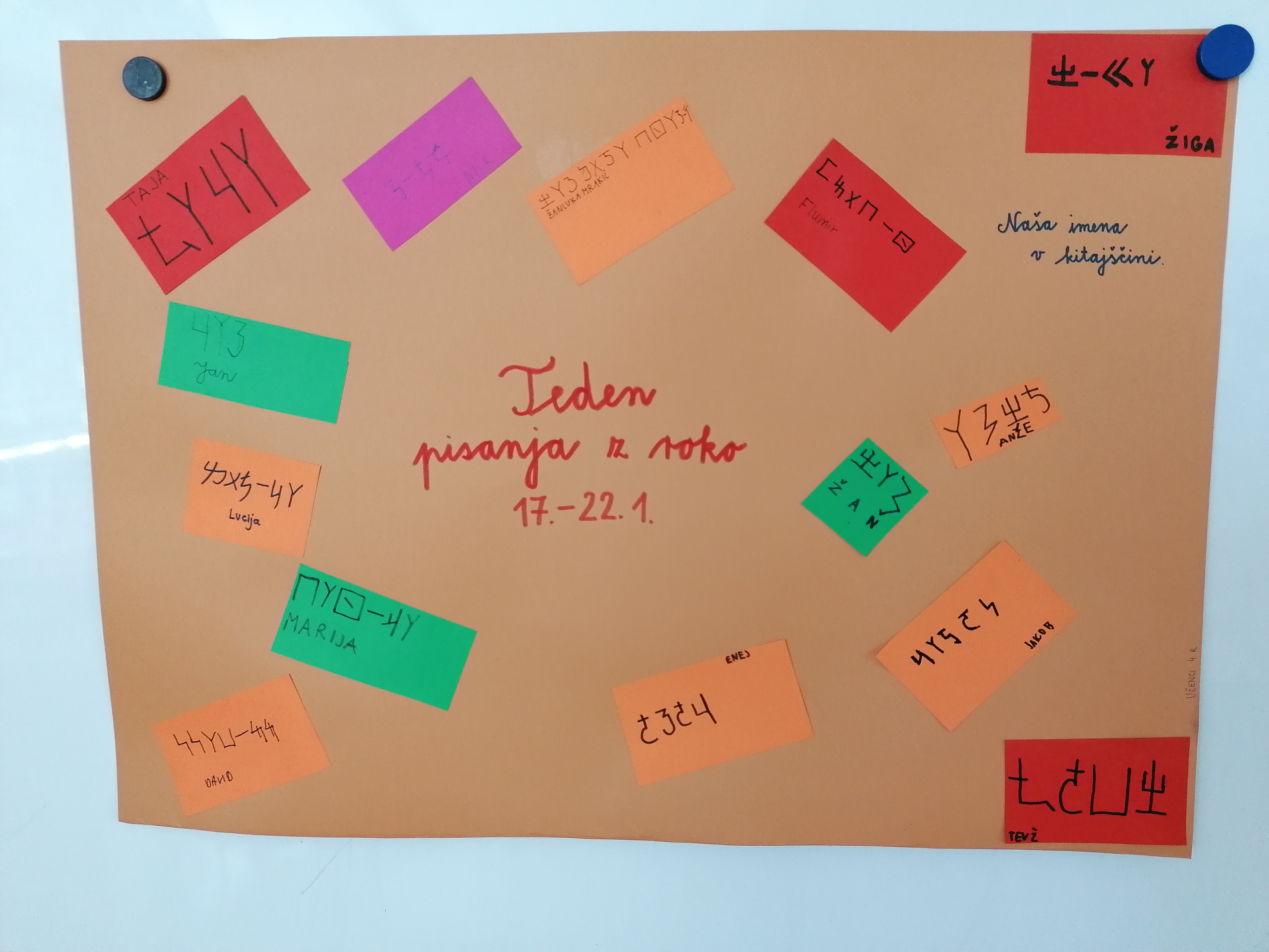 V četrtem razredu so izvedli več aktivnosti. Učenci so se naučili napisati svoje ime s kitajskimi pismenkami in izdelali plakat. Naučili so se, da vsi ljudje ne uporabljajo enakih pisav in da ponekod pišejo tudi v obratni smeri.