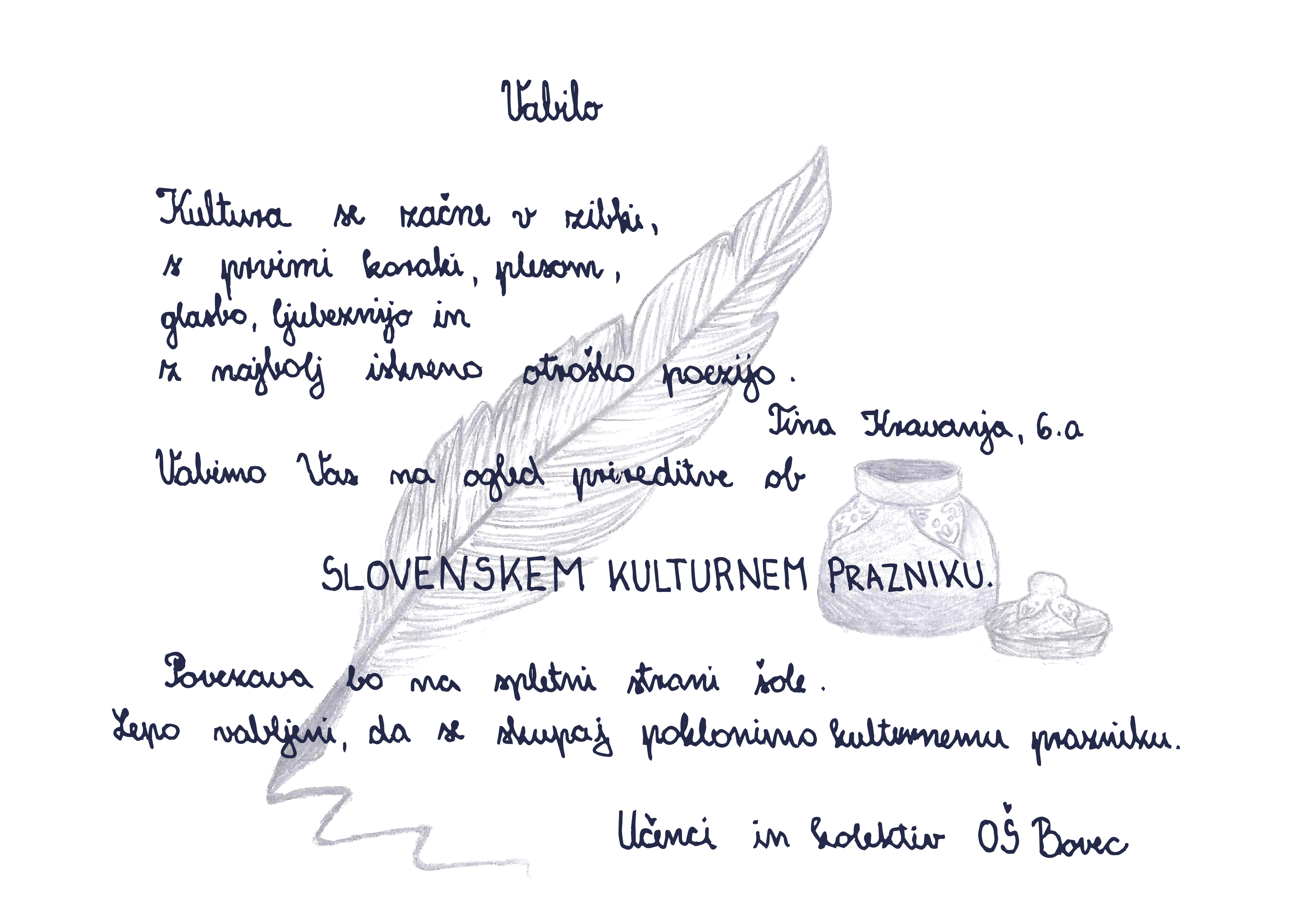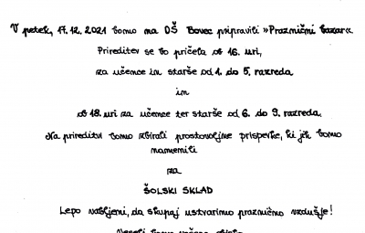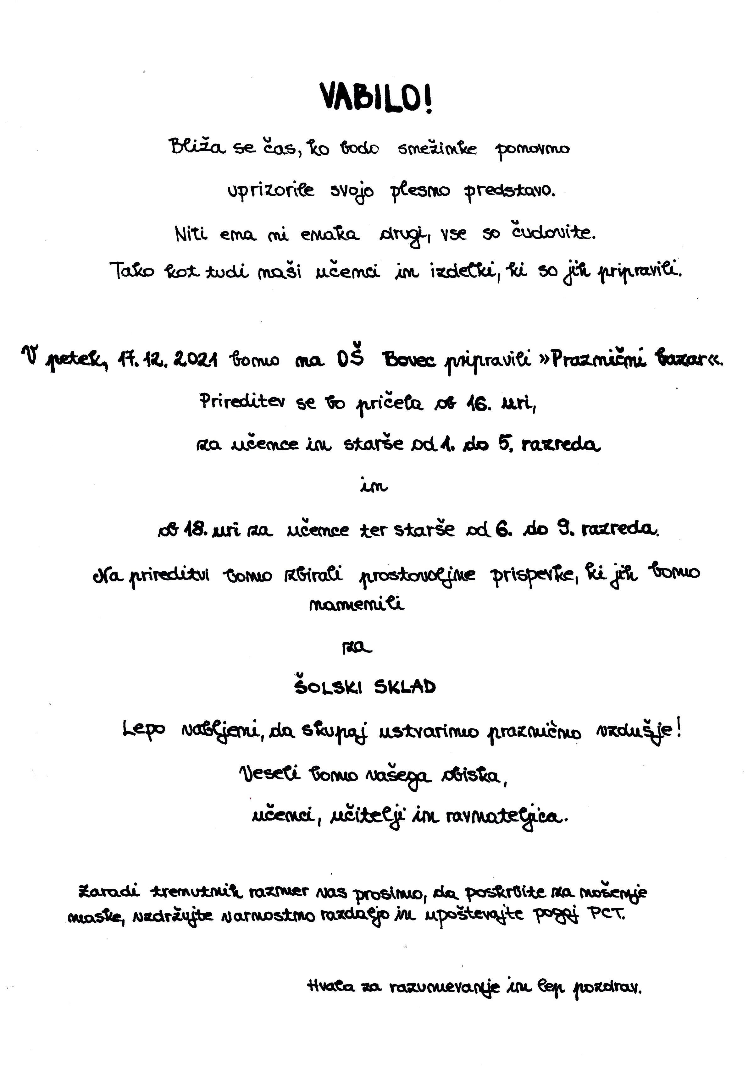 Učenec Mihael Braz je napisal vabilo na praznični bazar z roko. Učenka Lara Škander je napisala vabilo za kulturno prireditev.
