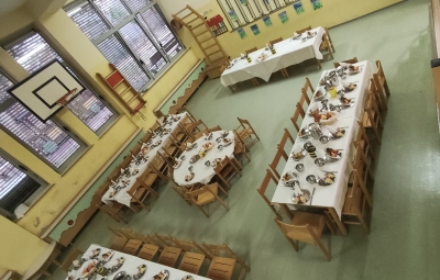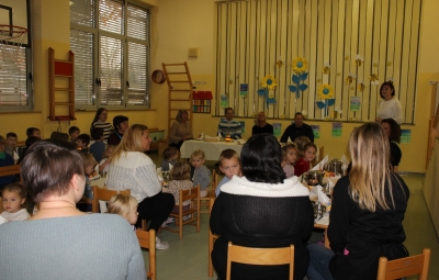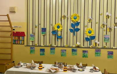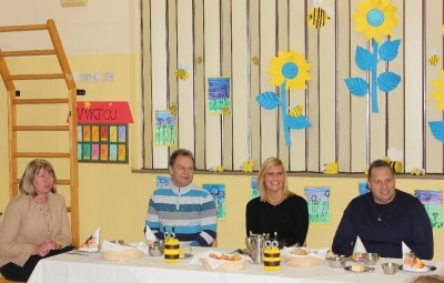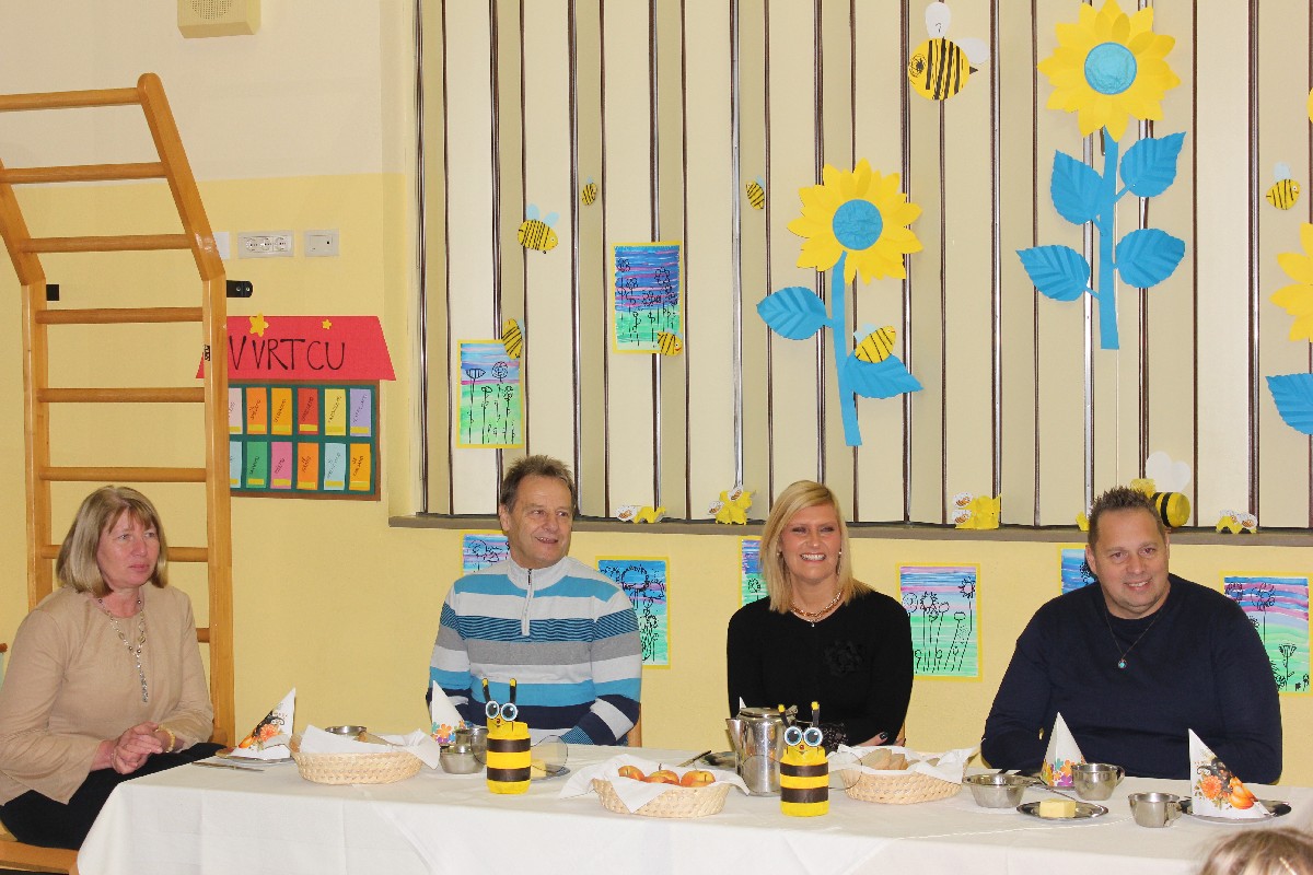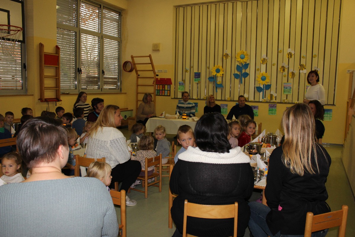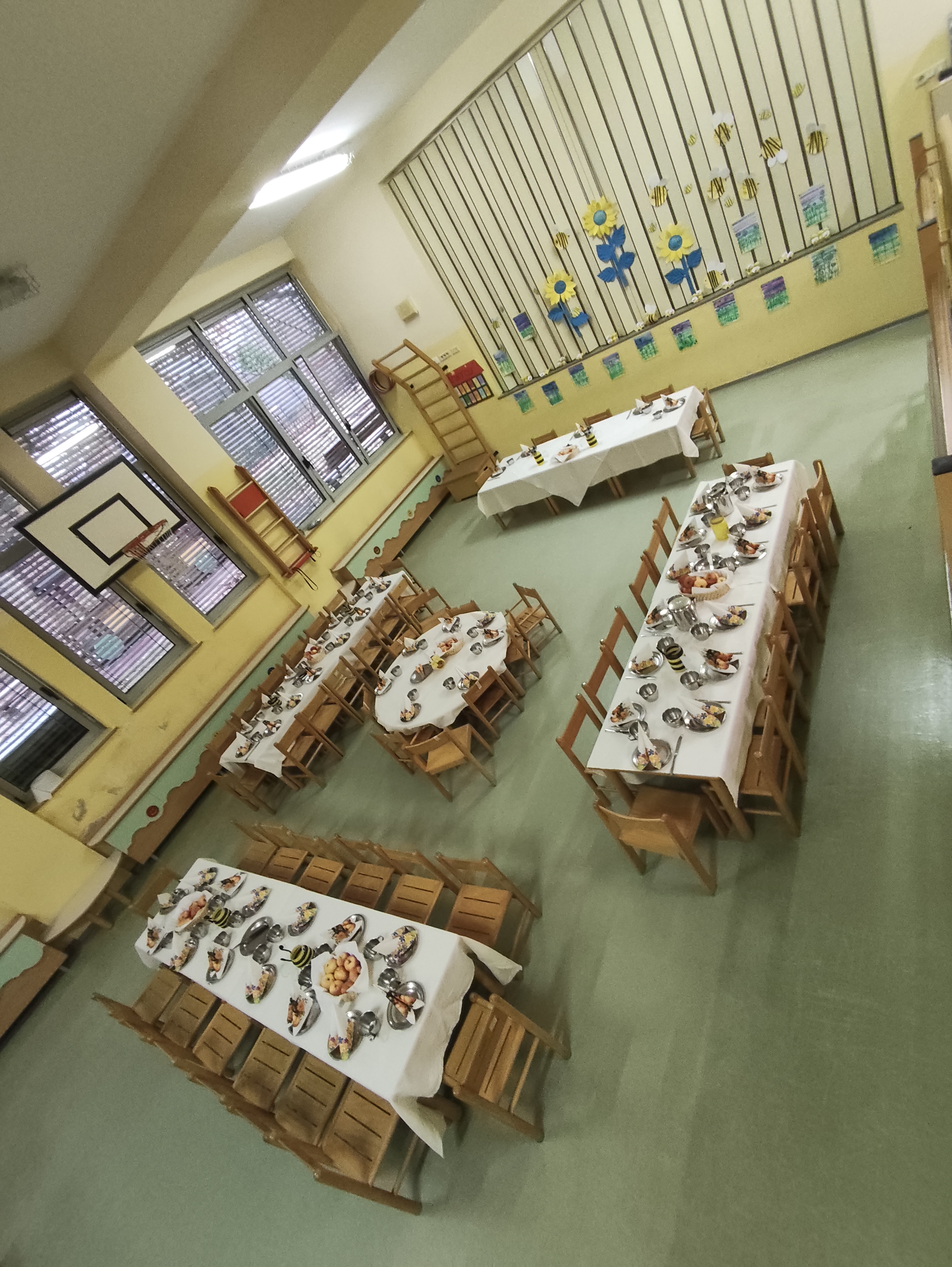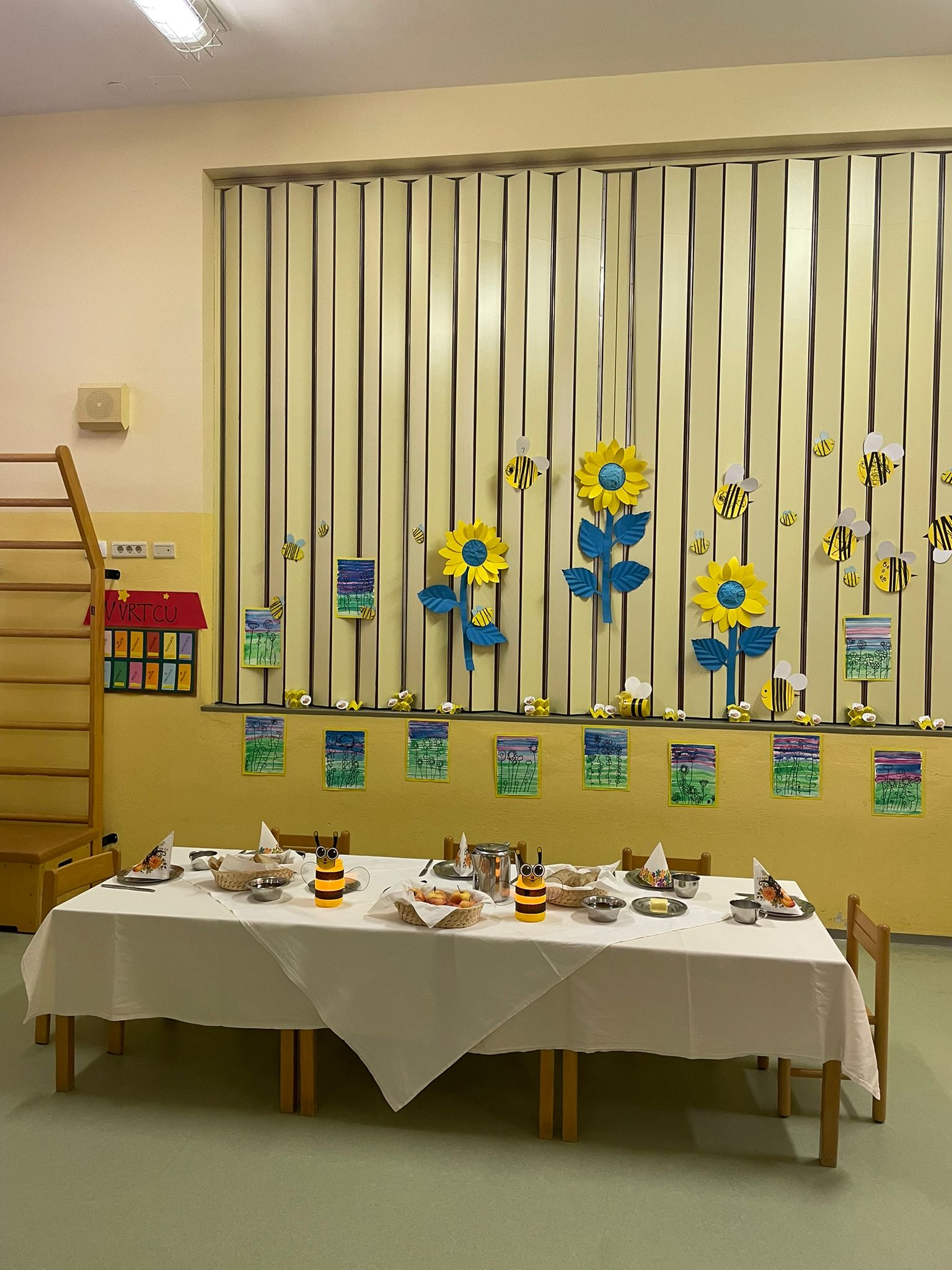 Že zgodaj zjutraj se je začel dan, vzgojiteljice so poskrbele za pripravo prostora, ki so ga še polepšale z izdelki in risbicami otrok. Največji poudarek smo dali pridnim čebelicam, ki so priletele na naš pano in ga lepo zapolnile, ter polepšale že skoraj praznične mize.