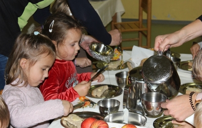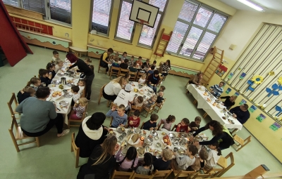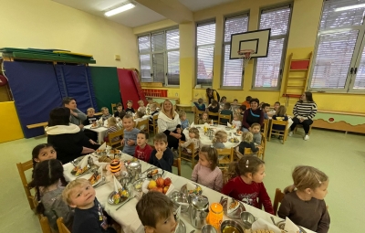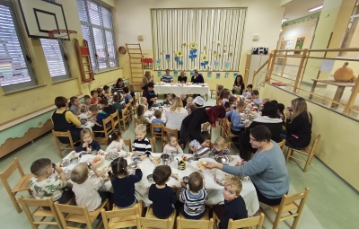 Otroci so najprej zagledali prostor, ki je bil zelo lepo pripravljen, v njihovih očeh je zasijala iskrica. Kmalu za tem, ko so zasedli svoja mesta, pa so nas presenetili posebni gostje: ravnateljica šole in vrtca Denise Rutar Šuler, župan občine Bovec Valter Mlekuž, podžupan občine Bovec Erik Cuder in gospa Jožica Kavs iz občine Bovec, ki vodi sektor družbene dejavnosti. Čez nekaj trenutkov pa smo med nas povabili še našo pridno kuharico Zdenko, ki dnevno skrbi za naše lačne želodčke. Otroci so goste radovedno povabili medse, jih pozdravili, ter jim zaupali, kaj vse imajo pri zajtrku najraje. Skupaj smo pojedli slasten med, namazali maslo na mehke rezine kruha, spili požirek mleka in ugriznili v hrustljava jabolka. Ob tem nas je spremljala domača narodno-zabavna pesem Čebelar, brez katere tradicionalnega slovenskega zajtrka nebi bilo. Vzdušje je bilo sproščeno, prežeto z dobro voljo in otroškim smehom. Bil je eden tistih posebnih dni v vrtcu.