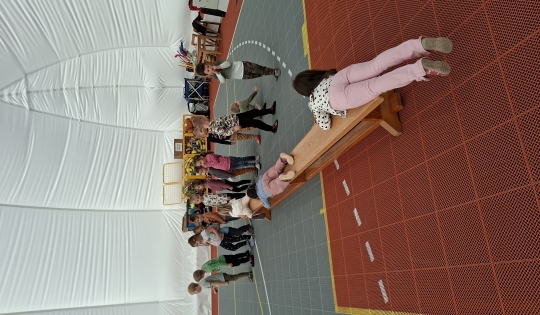 Zjutraj smo se vzgojiteljice dogovorile, da bomo izvedle gibalno urico v »balonu«. Otroci so bili nad idejo navdušeni saj se vedno zelo radi udeležujejo vadbe v »balonu«. Najprej smo izvedle ogrevanje, pri katerem so...