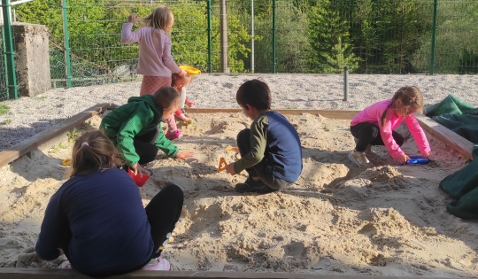 Na popoldanski športni dan smo se tokrat odpravili vsi "Škratki". Imeli smo srečo z vremenom, saj je bil prekrasen sončen dan, ki smo ga še popestrili z veselo pesmijo in otroško razigranostjo.