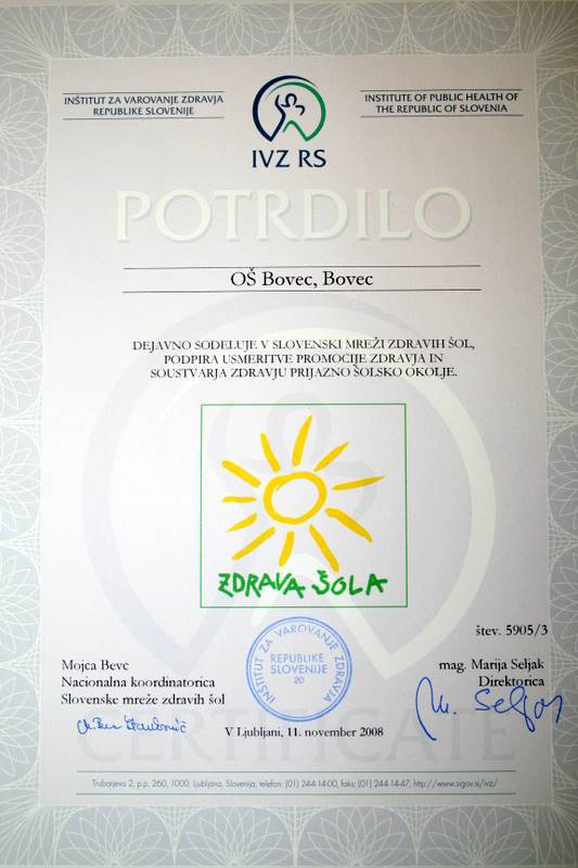 Pri načrtovanju šolske prehrane moramo dati prednost kakovostnim slovenskim sezonskim živilom. Pri osveščanju otrok o pomenu zdravega prehranjevanja je pomembno, da jim omogočimo zdravo izbiro. Učenci OŠ Bovec imajo enkrat tedensko , ob četrtkih na voljo brezplačno sadje (v letošnjem šolskem letu bodo tudi mlečni izdelki), kar nam omogoča projekt Shema šolskega sadja in zelenjave. Tudi v prihodnje bomo otroke spodbujali k zdravemu načinu življenja in primerni telesni aktivnosti ter osveščali o pomenu pozitivnega odnosa do kvalitetne slovenske hrane.